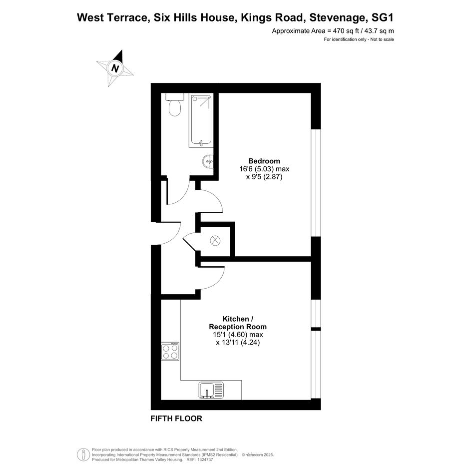 The property on the fifth floor comprises an entrance hall, a living room with a modern open-plan kitchen, a large bedroom, and a bathroom. This could be great for a couple or a single person.