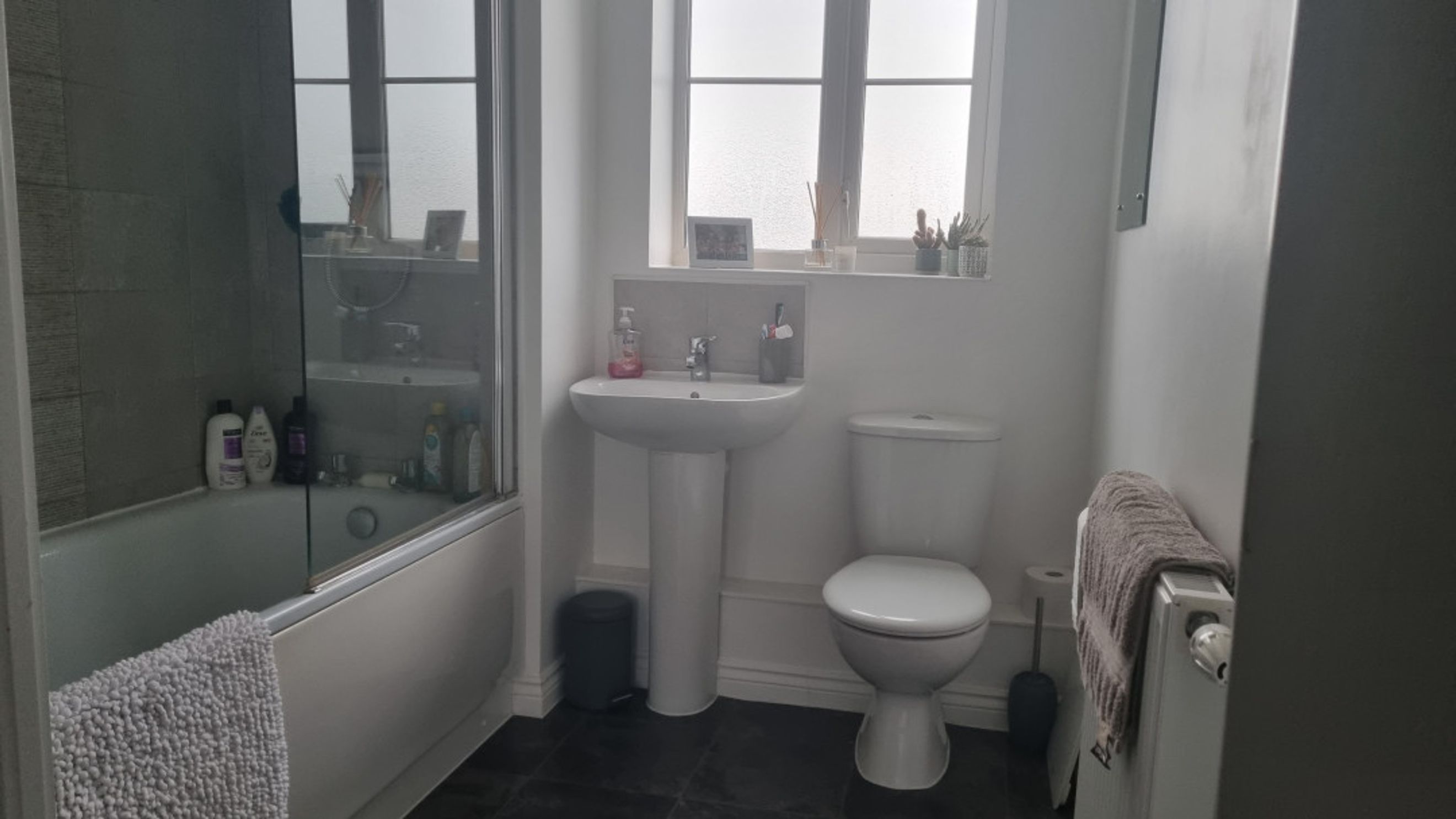 The bathroom continues the modern theme with a stylish white and grey suite, laminate flooring, and a window for natural ventilation. A shower over the bath adds convenience and versatility.