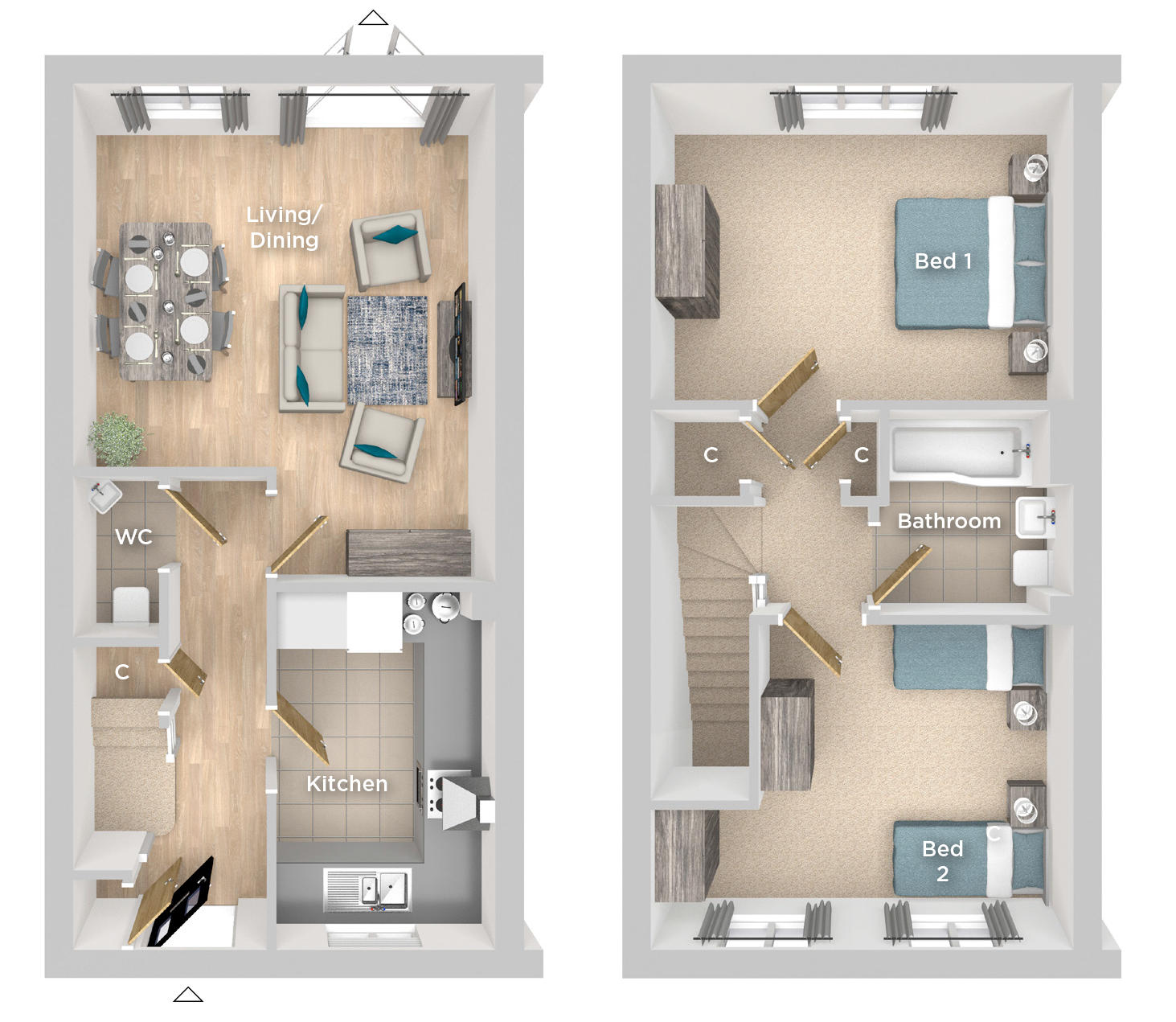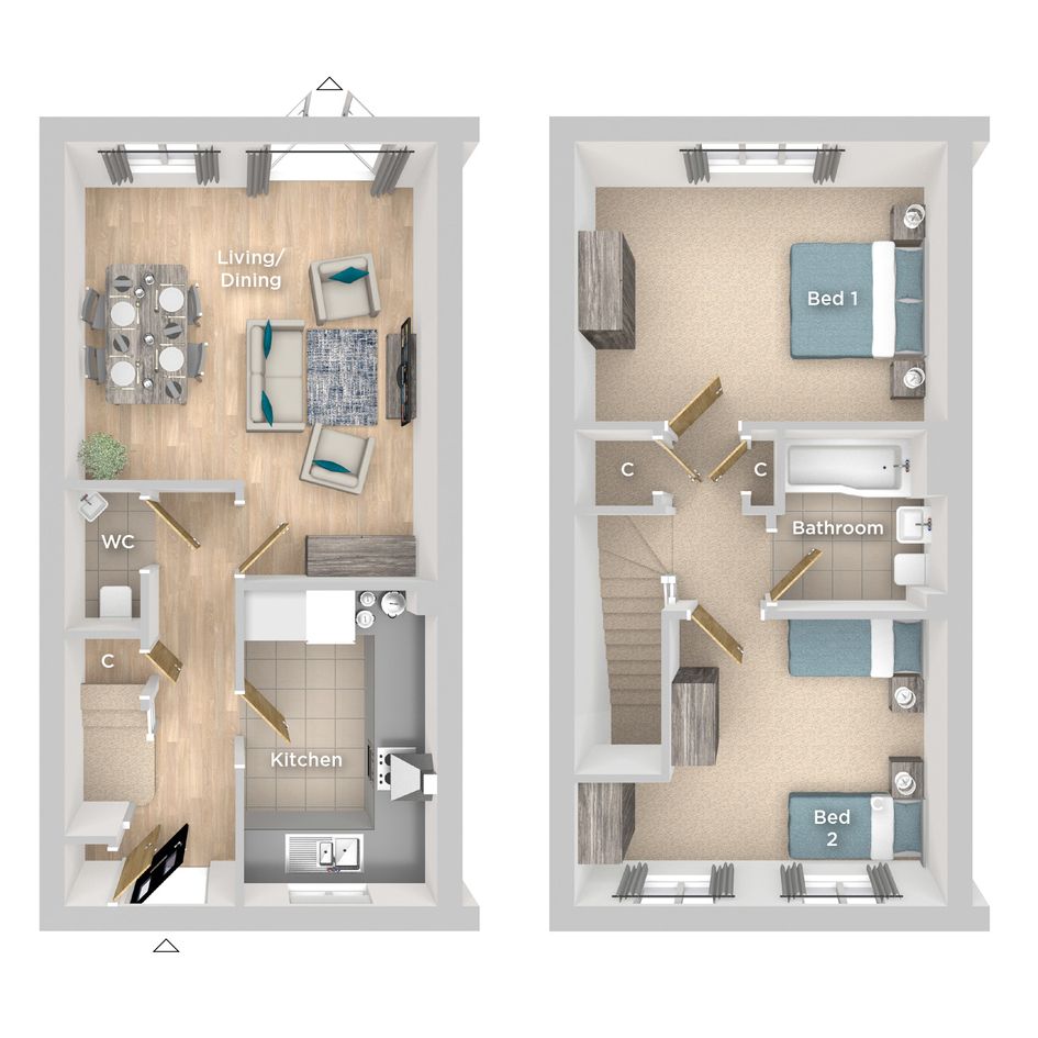 The Pine is a modern two bed semi-detached home comprising of a well appointed front aspect kitchen and spacious living/dining area with access via French doors to the rear garden. Upstairs you will find two bedrooms and a white fitted family bathroom with shower over the bath.