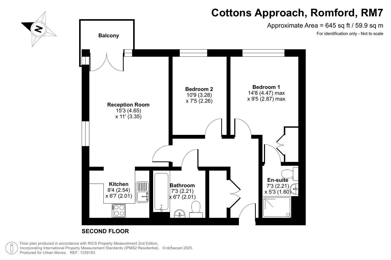 This smartly-presented flat is on the second floor, which is the top floor in that part of the building. The property has a dual-aspect reception room with double doors that lead out onto a balcony. The kitchen is semi-open-plan to the reception and features white units and contrasting worktops. There is a main bedroom with fitted wardrobe and en-suite shower room plus a second bedroom which, though smaller, still has space for a double bed and good-sized wardrobe. A large storage/utility cupboard has been provided in the entrance hallway and the energy-efficiency rating is very good, thanks to well insulated walls and roof, triple glazing and gas central heating powered by a newly installed boiler. The development has a communal rear garden and backs onto the green, open spaces of Cottons Park. Romford town centre is just a short walk away and Romford Station, for Elizabeth Line, Greater Anglia and London Overground services, is also within easy reach. Ofsted list nine primary schools within a mile radius, all rated either 'Good' or 'Outstanding'.