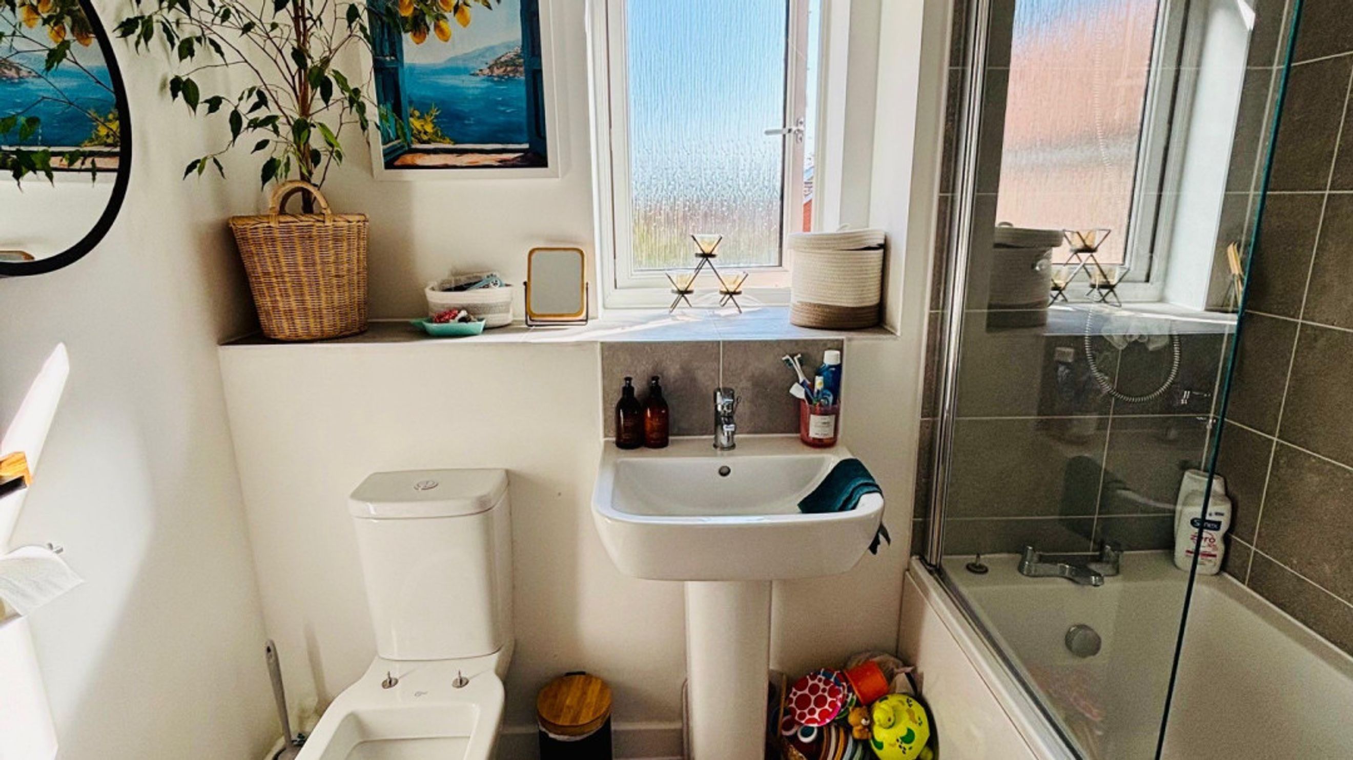 Upstairs, you'll find two generously sized, carpeted bedrooms, offering a comfortable space to unwind. The family bathroom is finished with laminate flooring, a white suite, grey tiled walls, and a shower over the bath.