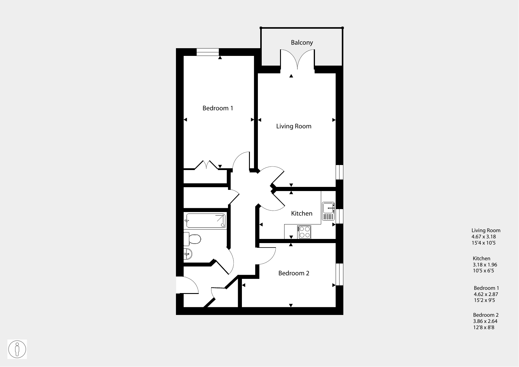 Featuring an open-plan living / dining room, with a door to your balcony. The kitchen has an integrated oven, hob and hood. There are two comfortable bedrooms, with built-in storage to the master. The bathroom has a modern, white suite.