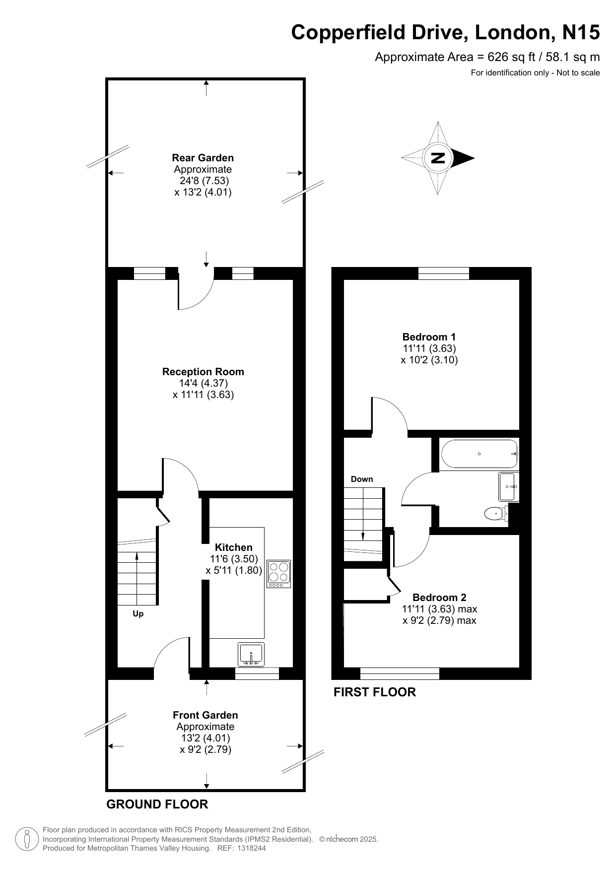 The property features a living room, a separate kitchen, a rear and front garden on the ground floor, two bedrooms, and one bathroom on the first floor.