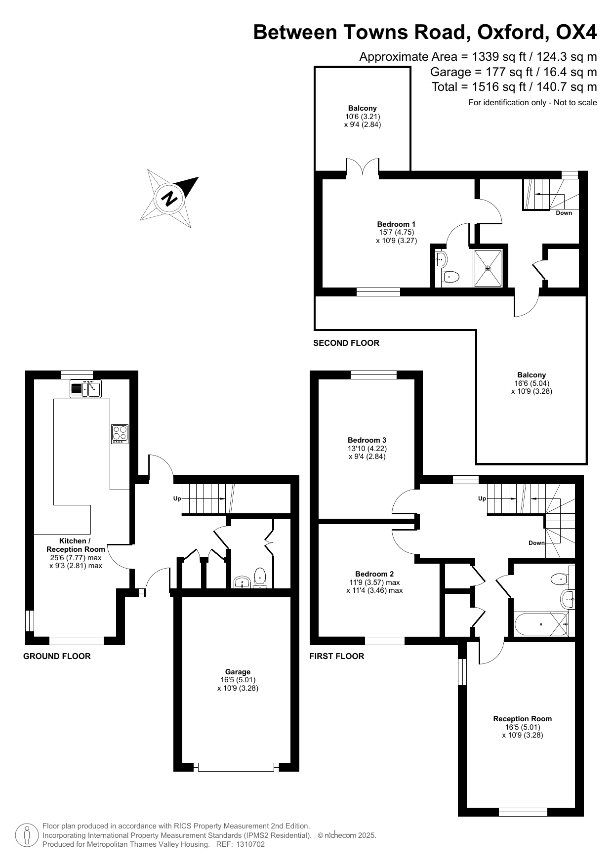 The property is set across two floors. The ground floor has a separate kitchen and reception area, a toilet, and a garage. On the first floor, there is a reception room, two bedrooms, and one bathroom. On the second floor, there is another bedroom, another bathroom, and two private balconies.