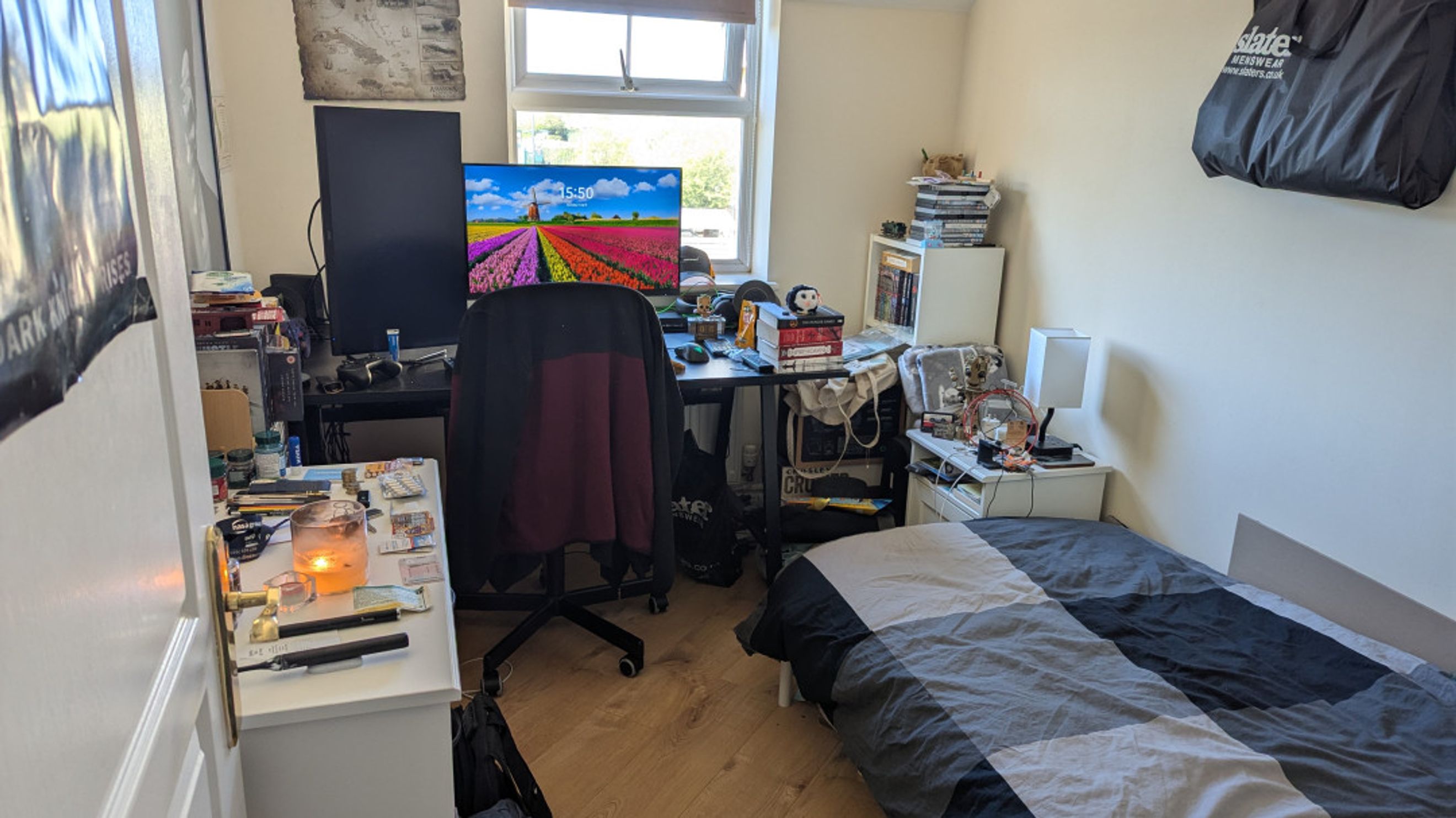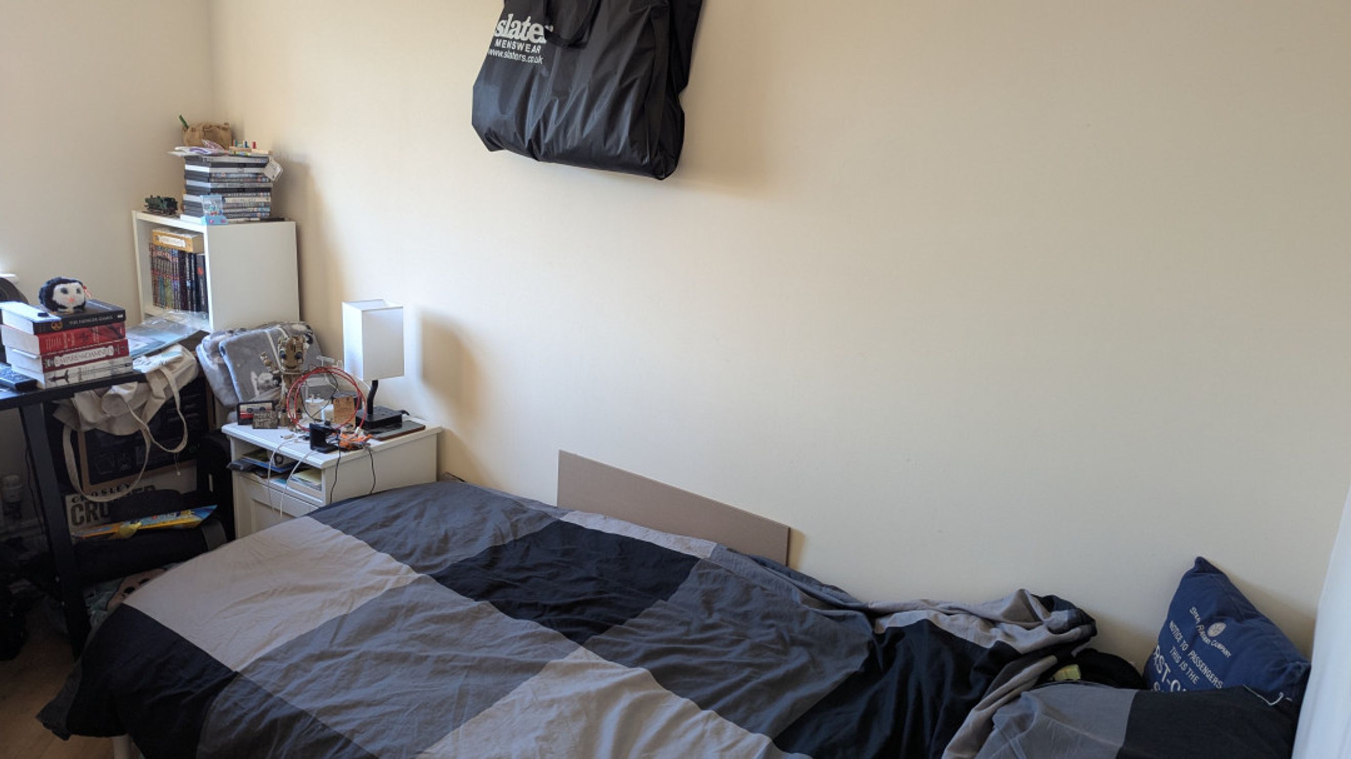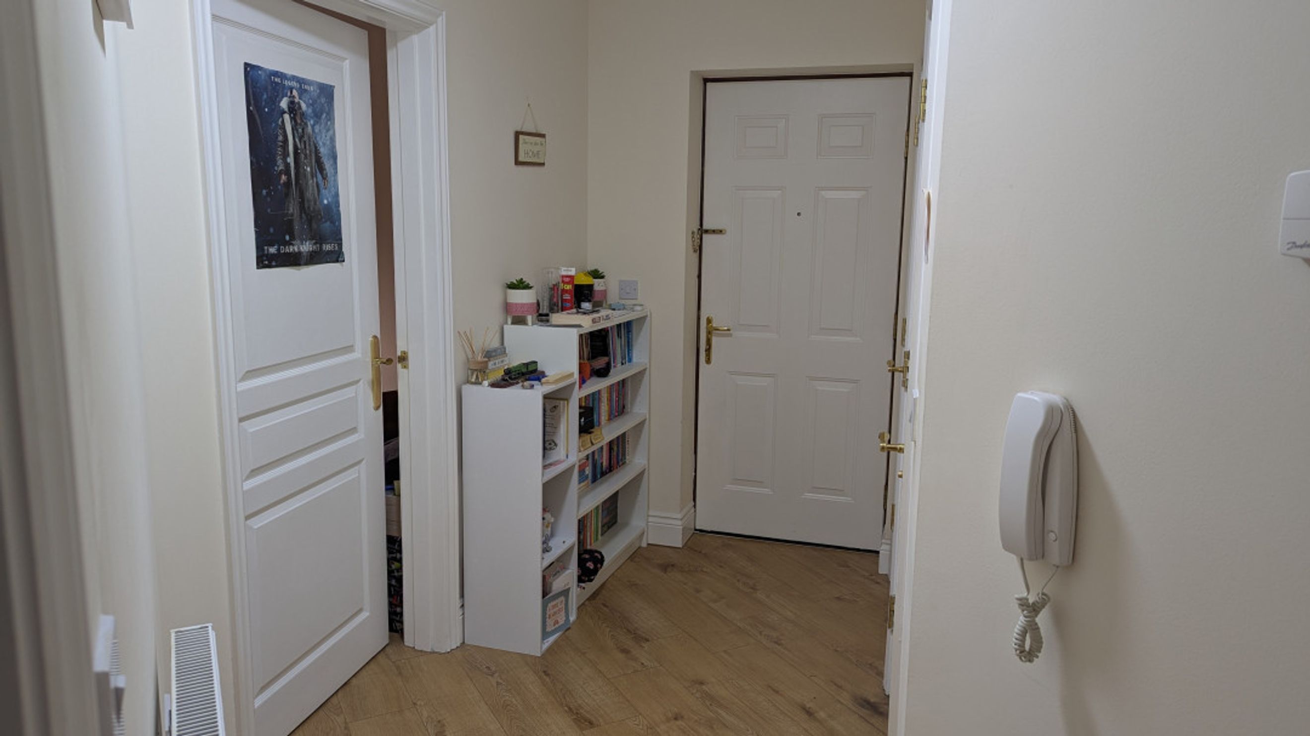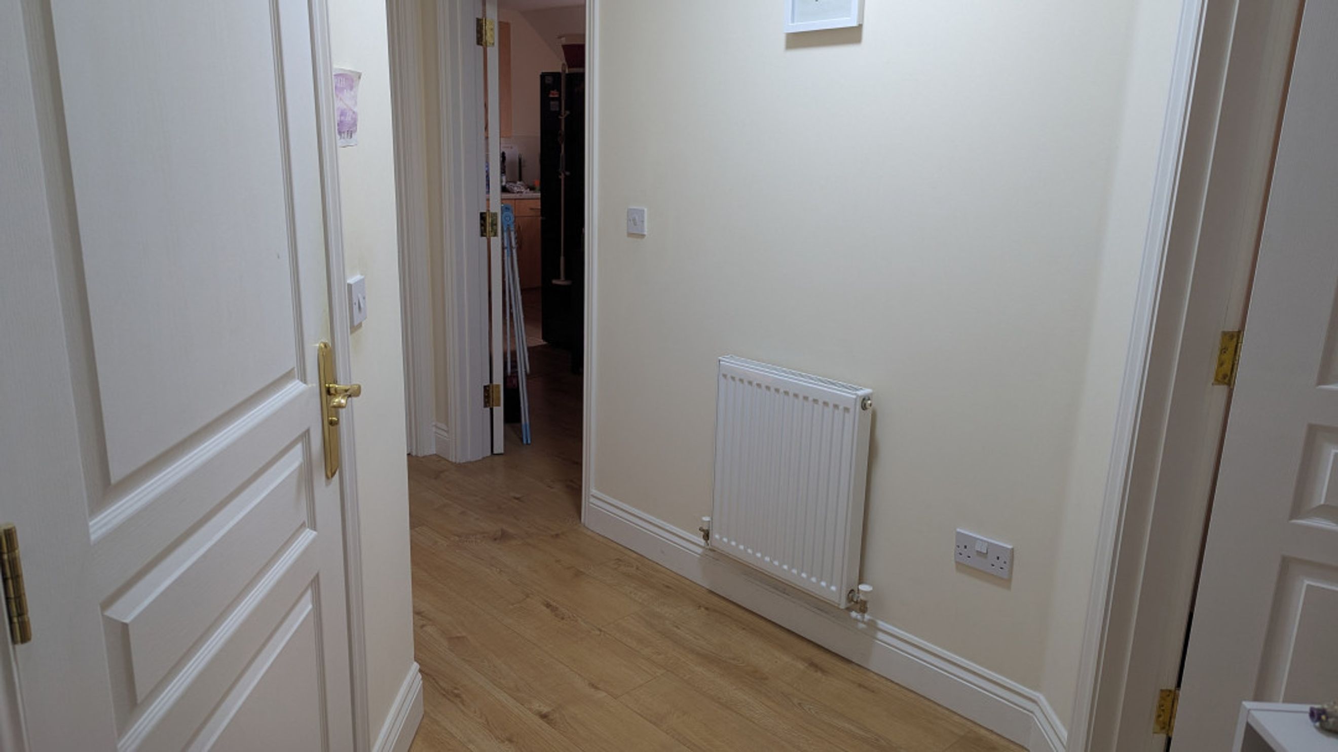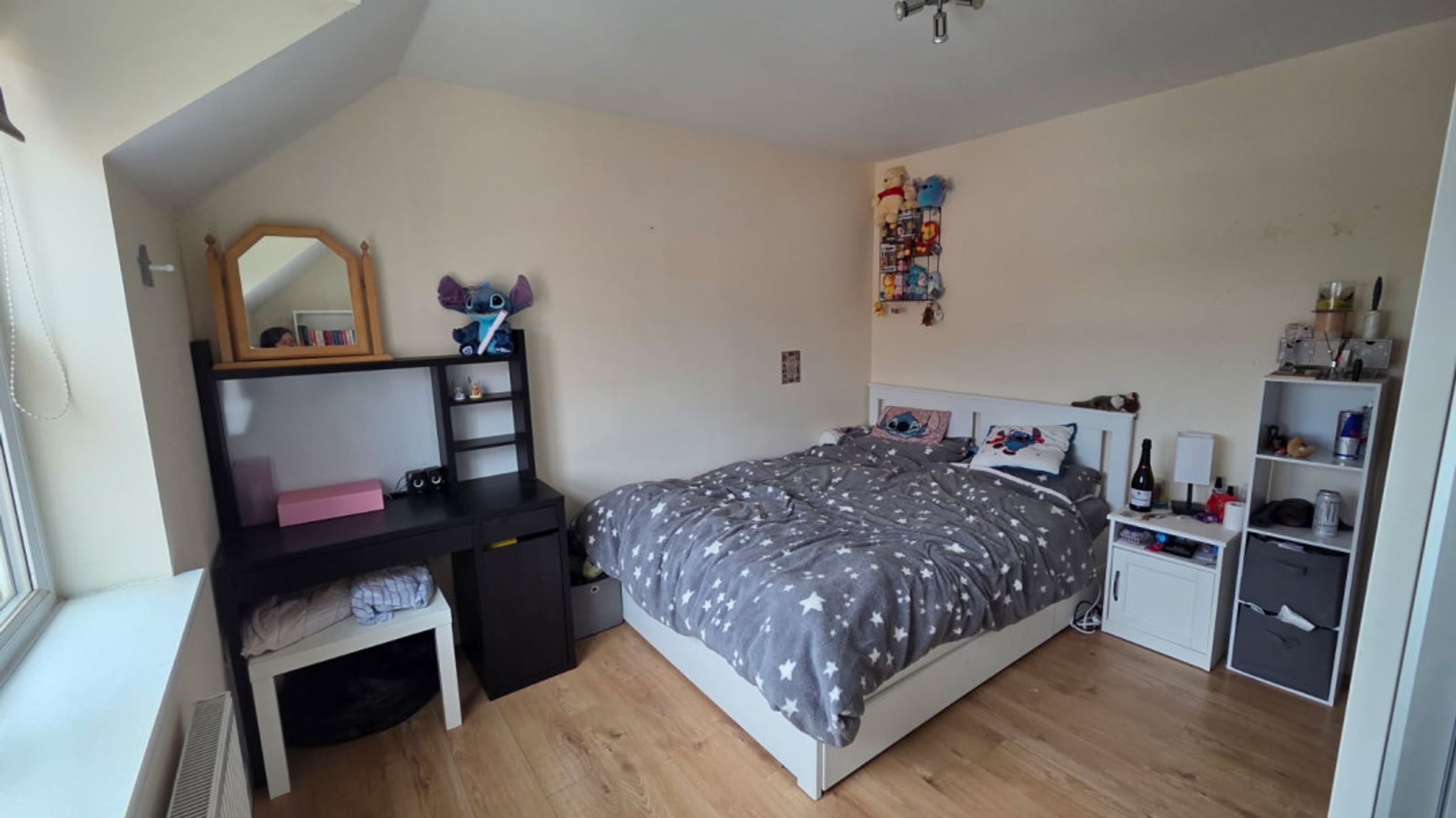 Both bedrooms are generously sized and benefit from sleek laminate flooring, offering comfort and versatility. The bathroom is finished with a clean white suite, shower over the bath, and partially tiled walls in crisp white for a fresh, modern feel.