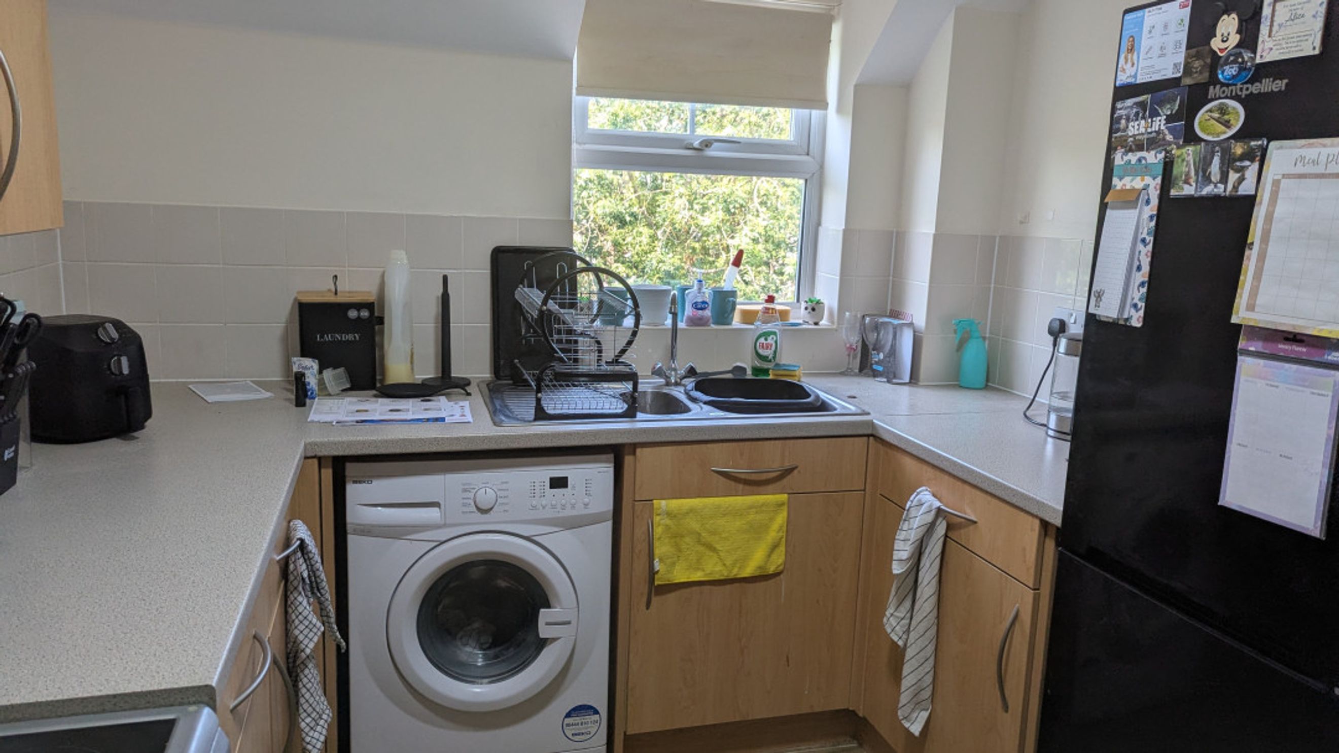 It includes a telephone point, TV aerial point, and SKY/cable connection, making it ideal for relaxing or entertaining. The adjoining kitchen is thoughtfully designed with laminate flooring, an electric hob, gas oven, and ample space for a fridge/freezer and washer/dryer.