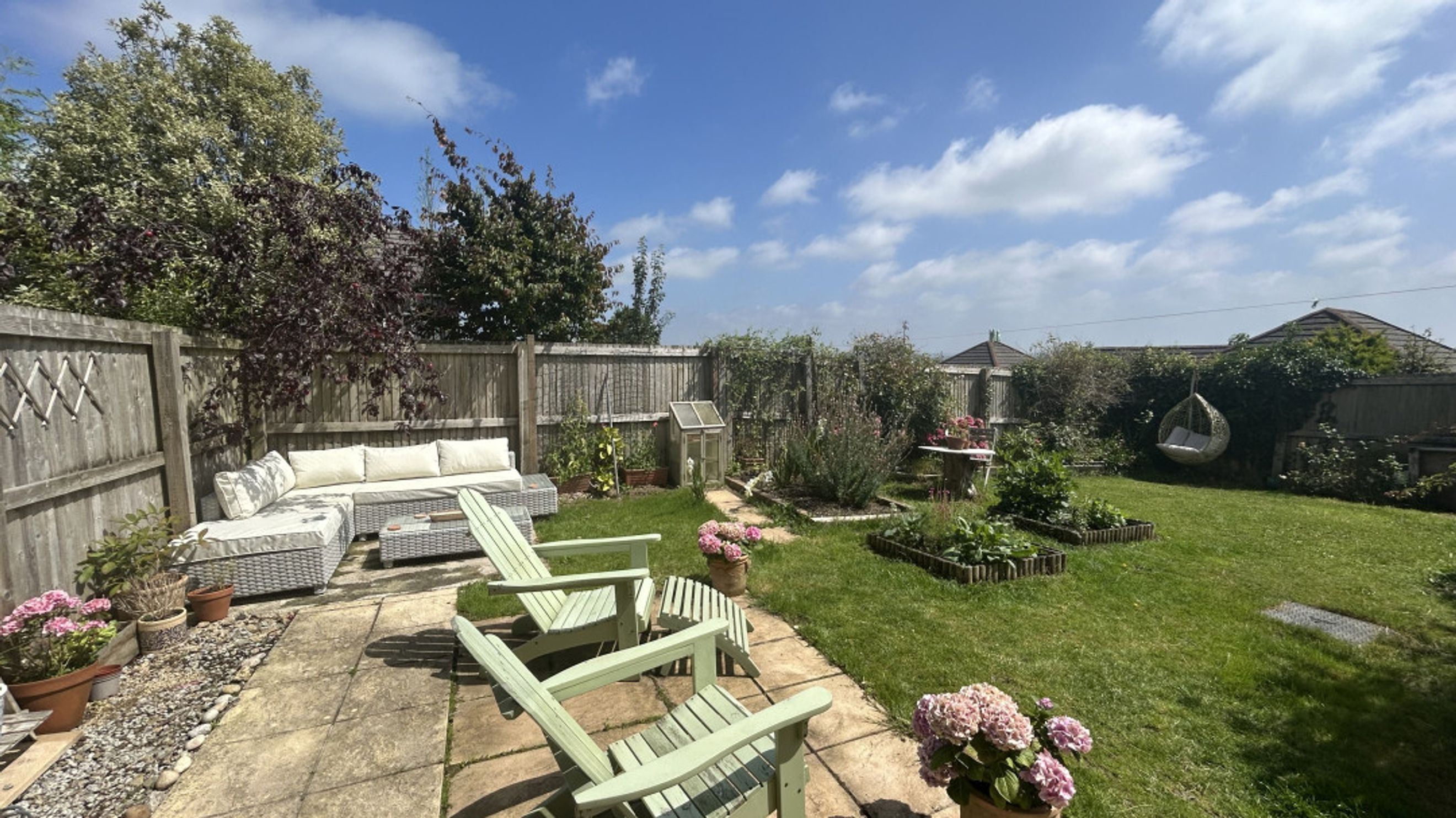 Outside, the rear garden is beautifully maintained with a lawn, flower beds, and a patio area ideal for outdoor dining. The property also includes two allocated parking spaces for added convenience.