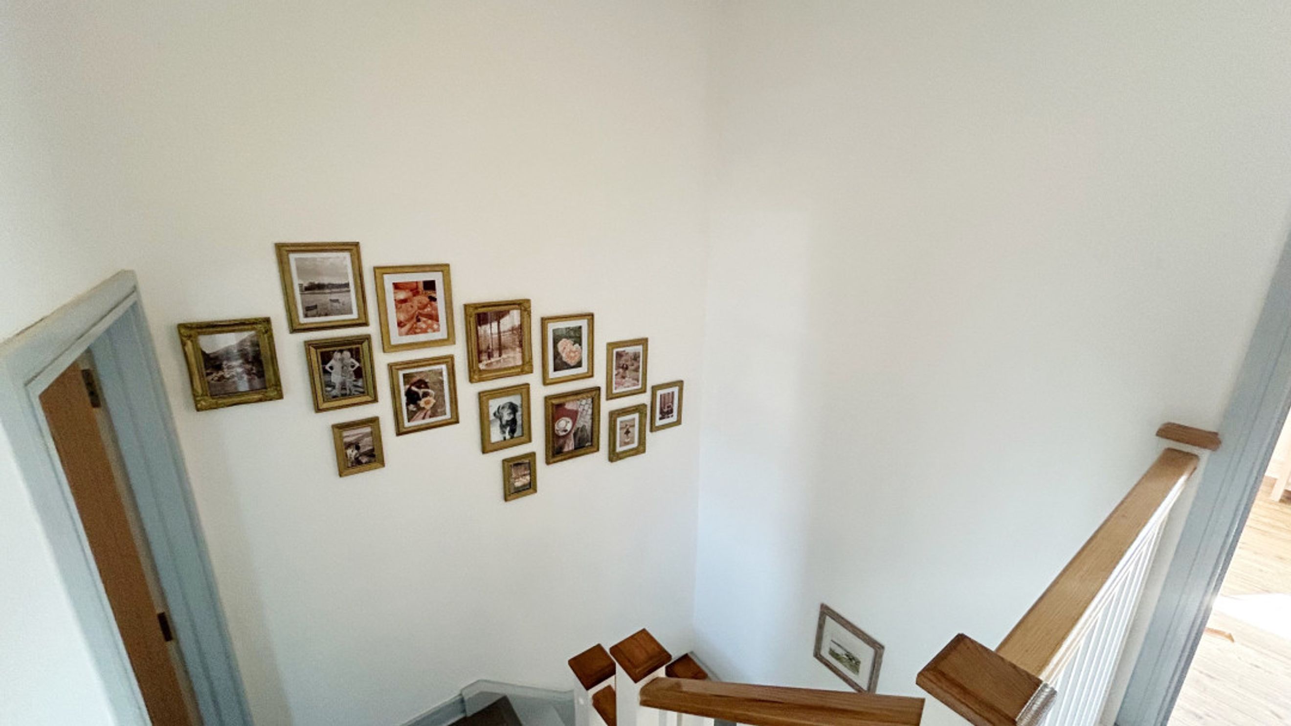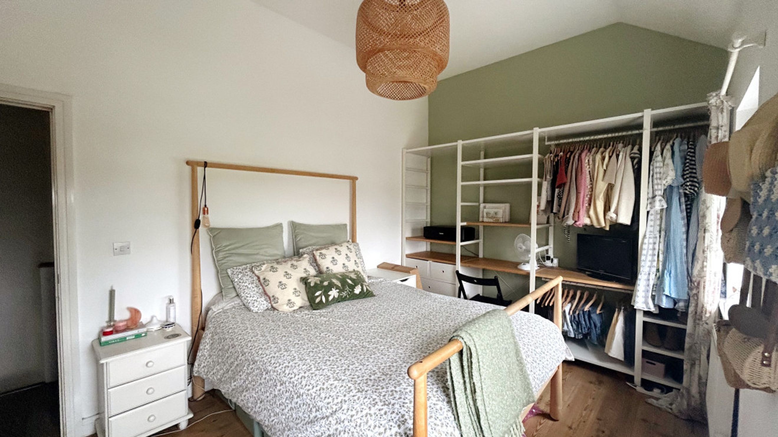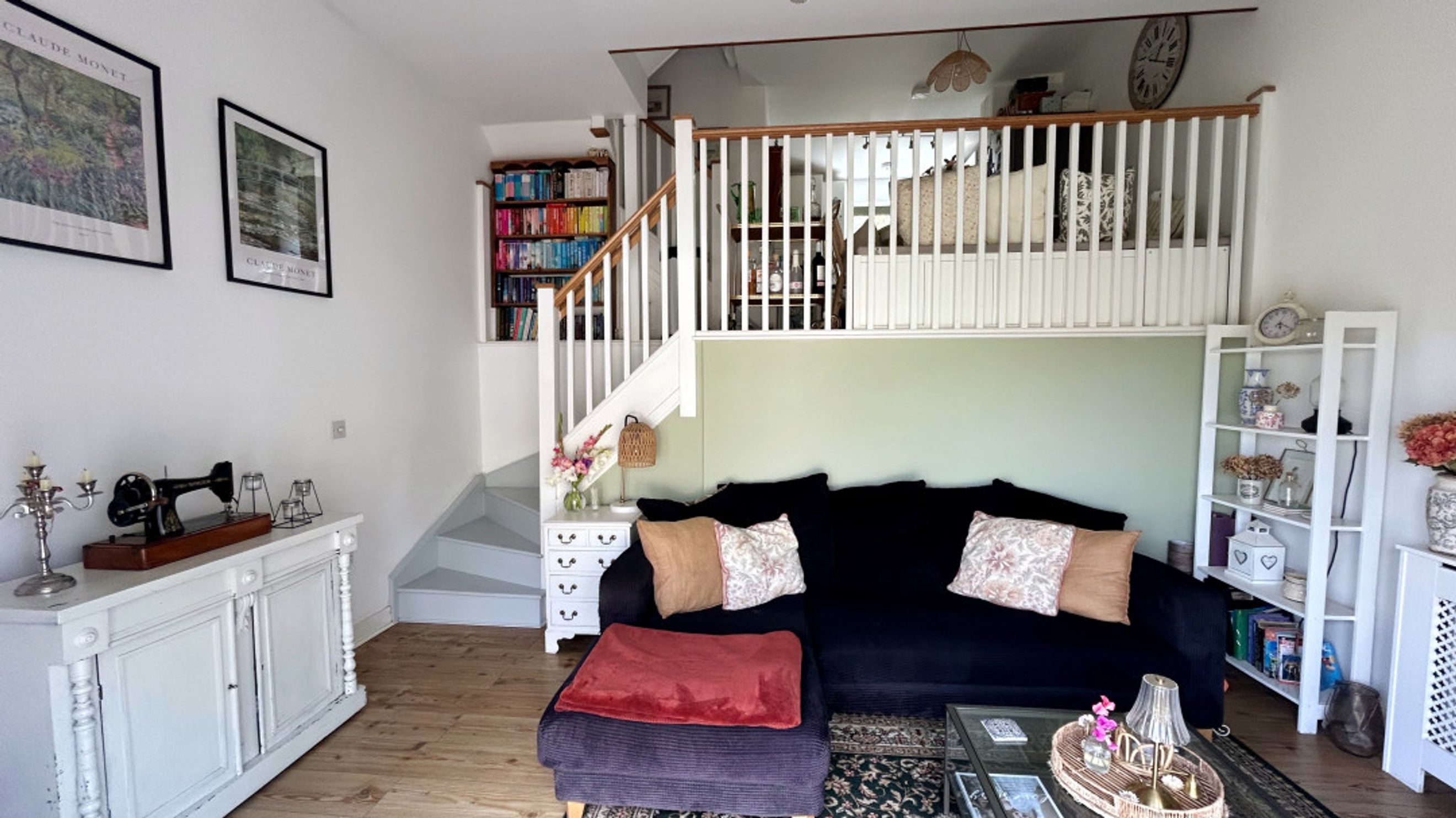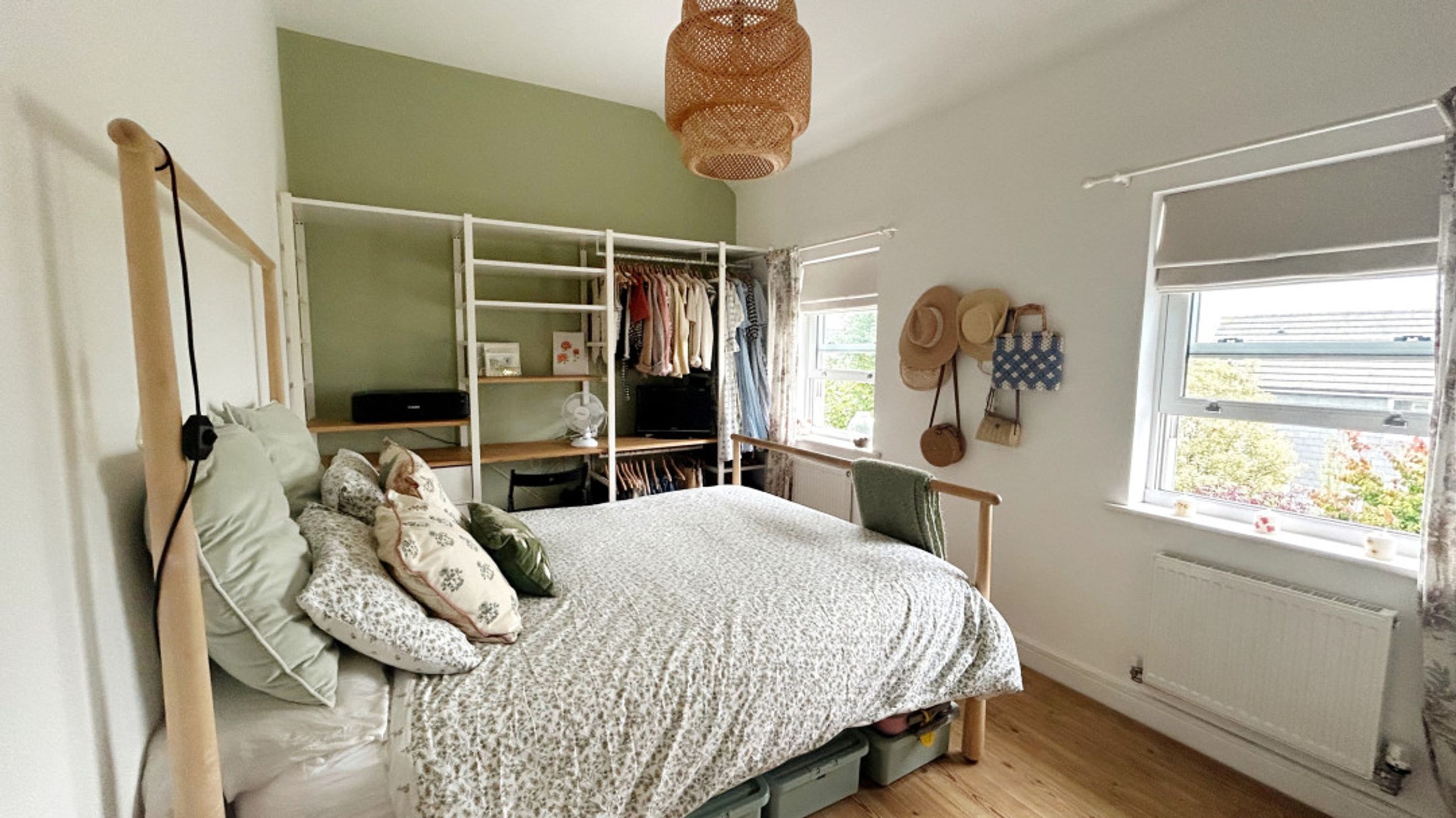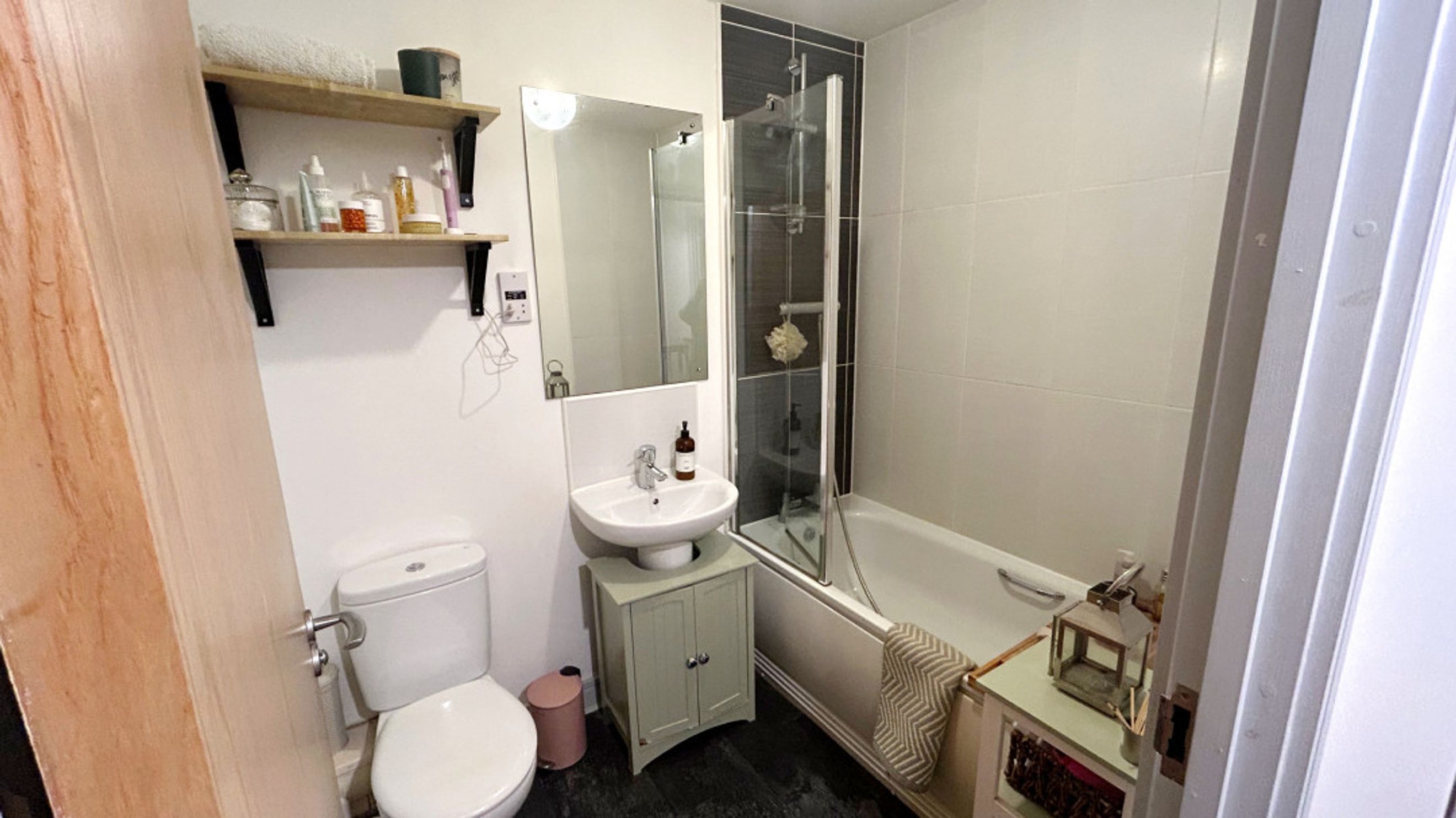 Upstairs, the bathroom boasts a white suite with a shower over the bath, partially tiled walls, and laminate flooring. Both bedrooms are generously sized and benefit from laminate flooring throughout.