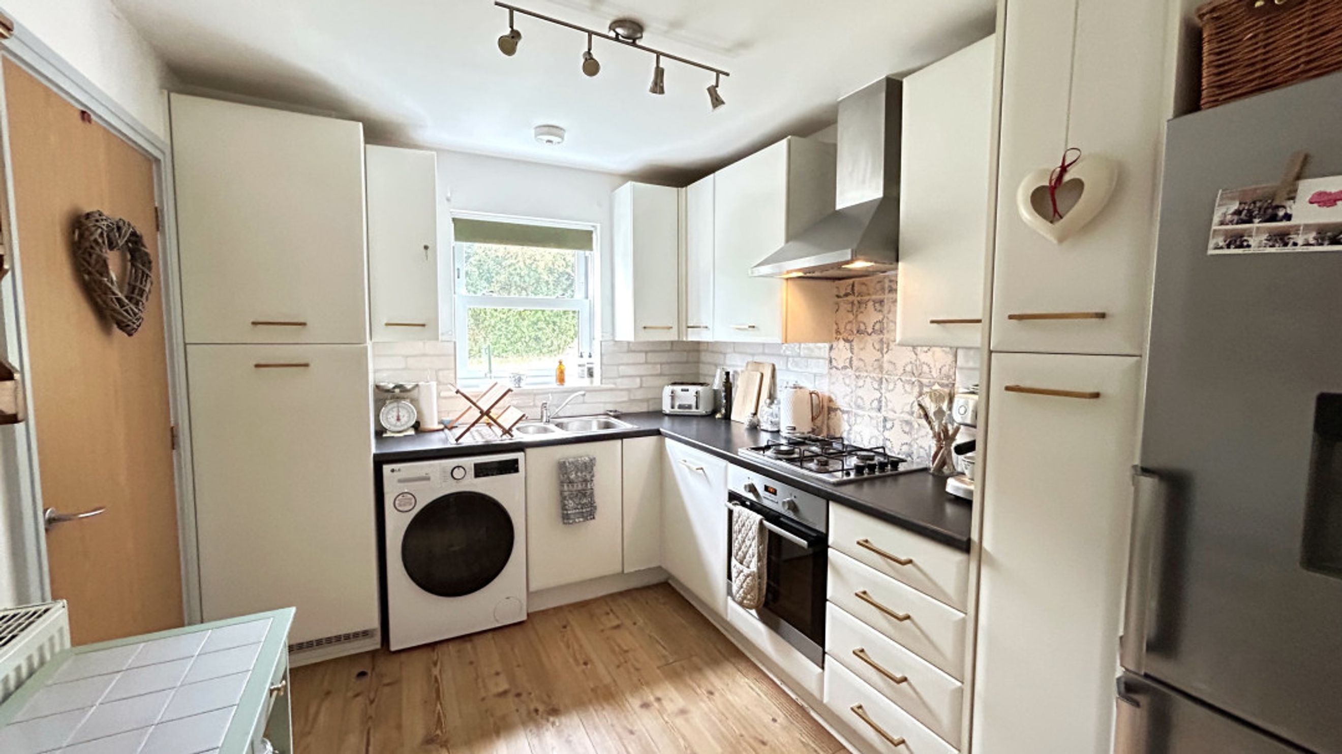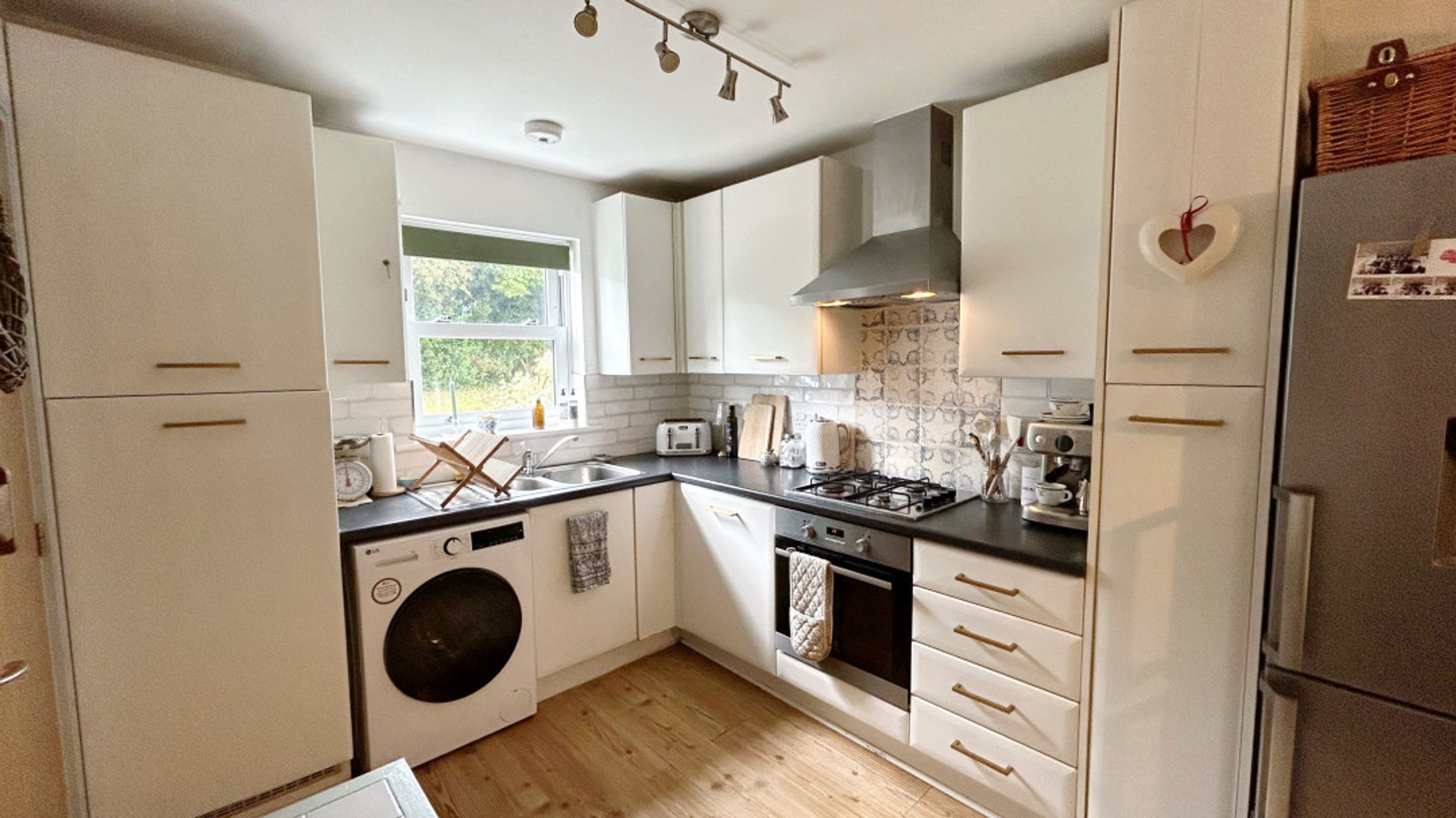 The modern kitchen/diner is fitted with laminate flooring, a gas hob, electric oven, and provides ample space for a fridge/freezer and washer/dryer, making it both functional and inviting. Down a set of stairs, the spacious living room features laminate flooring, a telephone point, TV aerial point, and elegant French doors that open directly onto the rear garden - perfect for relaxing or entertaining.