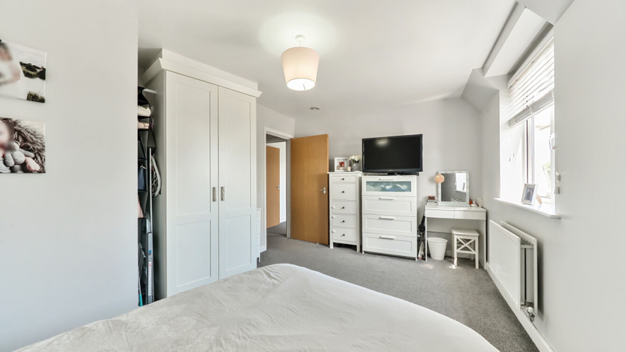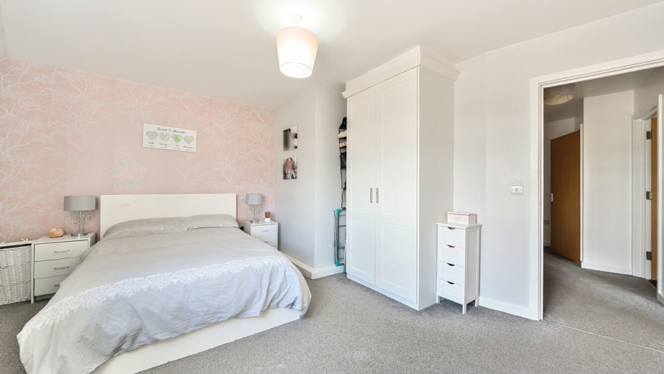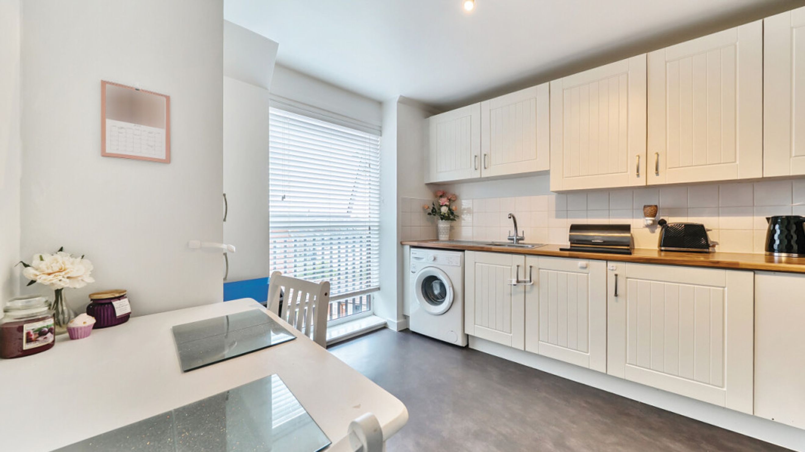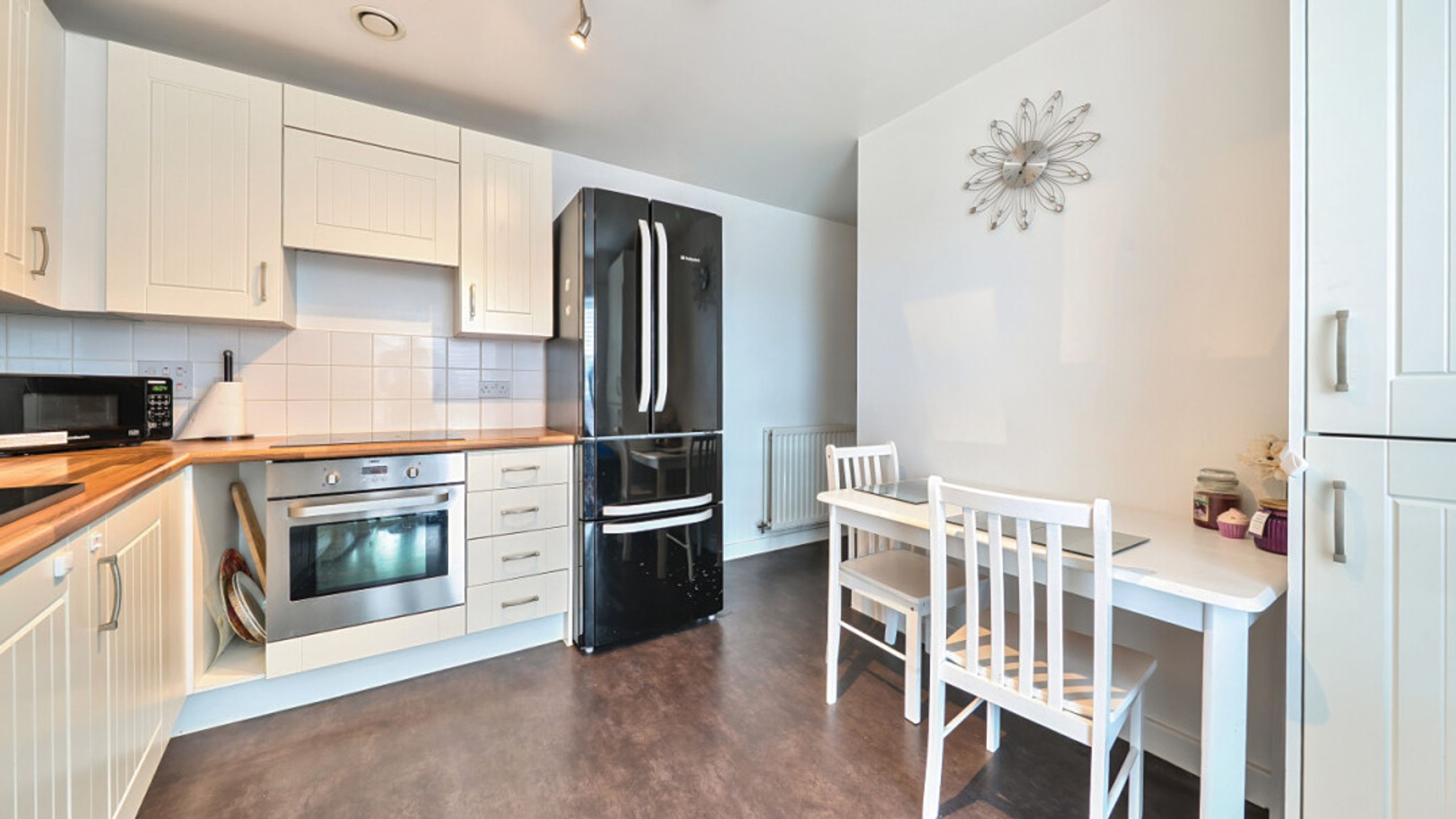 spaces for white goods. One of the two generous double bedrooms has fitted storage. A tiled family bathroom