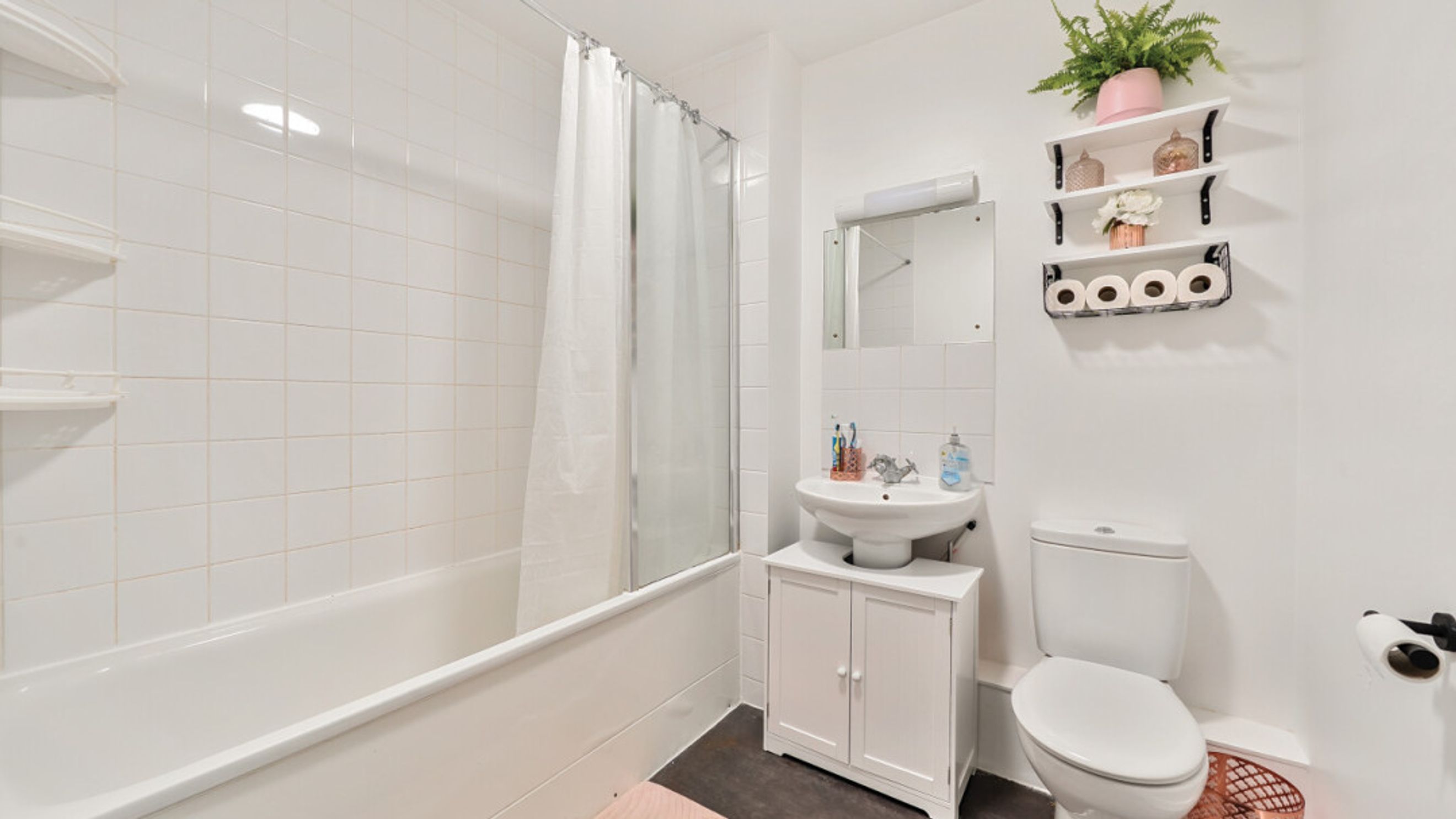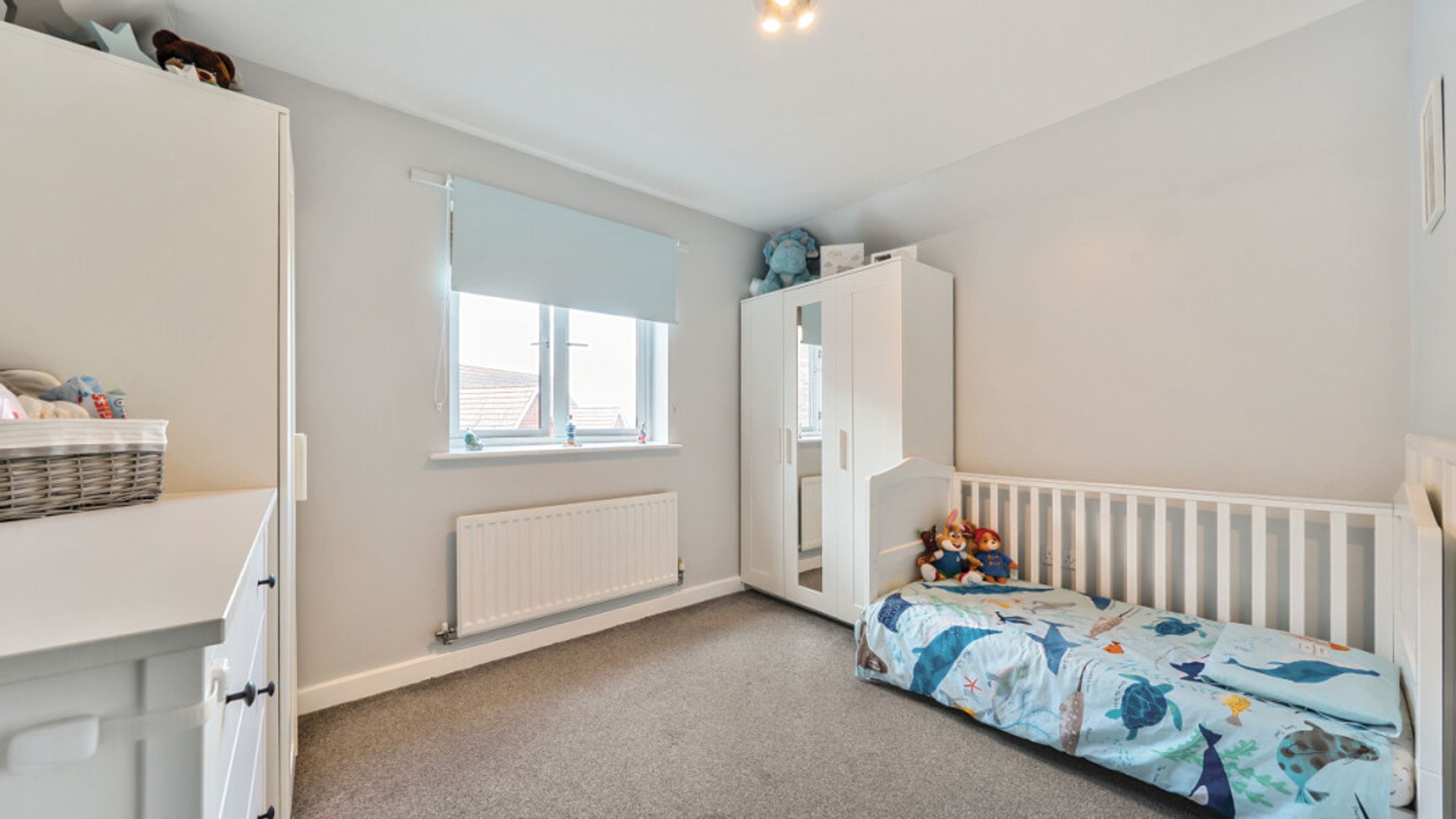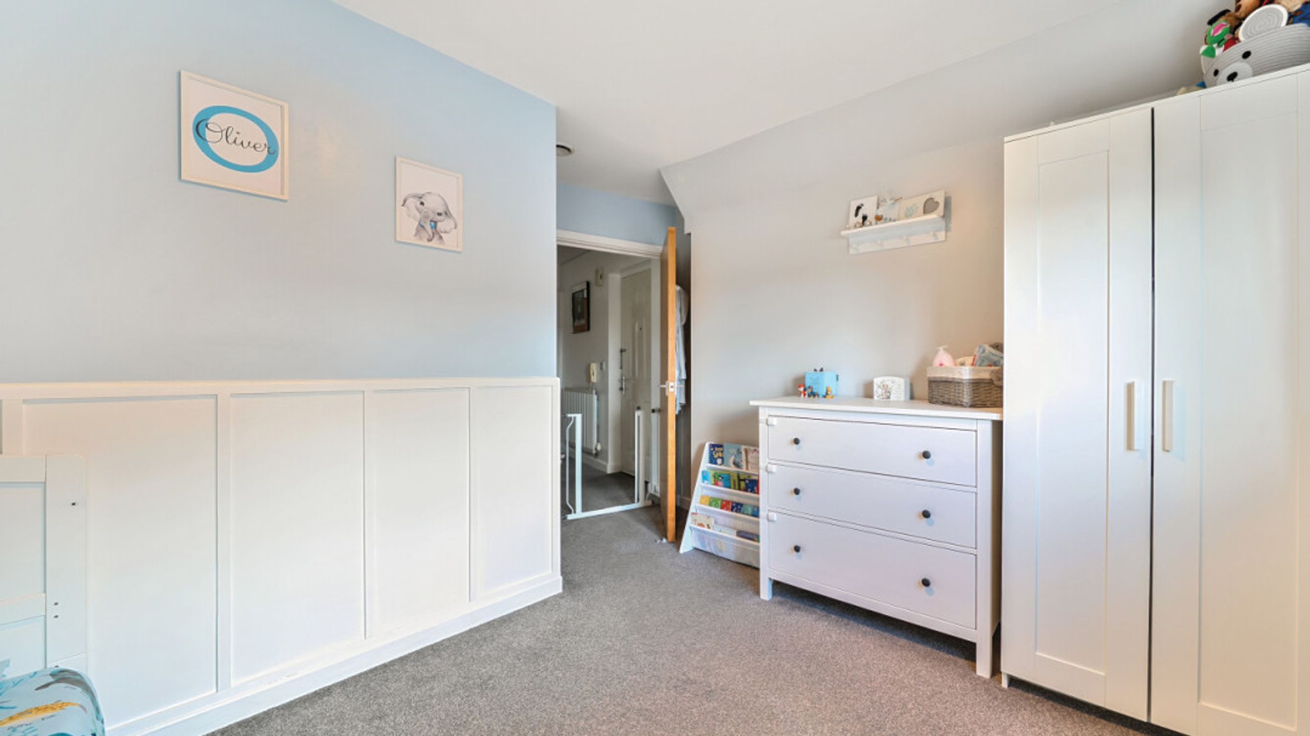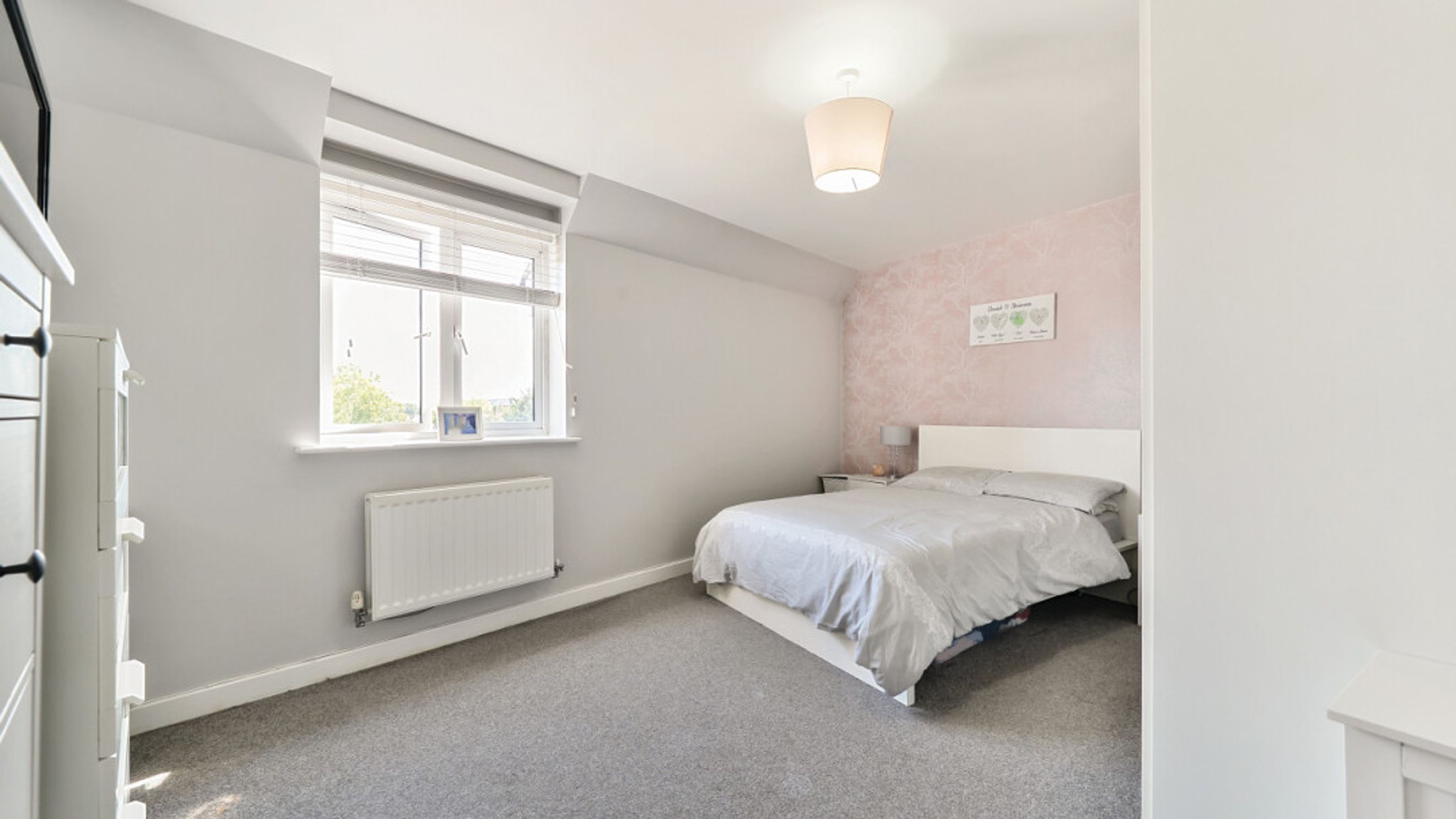 spaces for white goods. One of the two generous double bedrooms has fitted storage. A tiled family bathroom