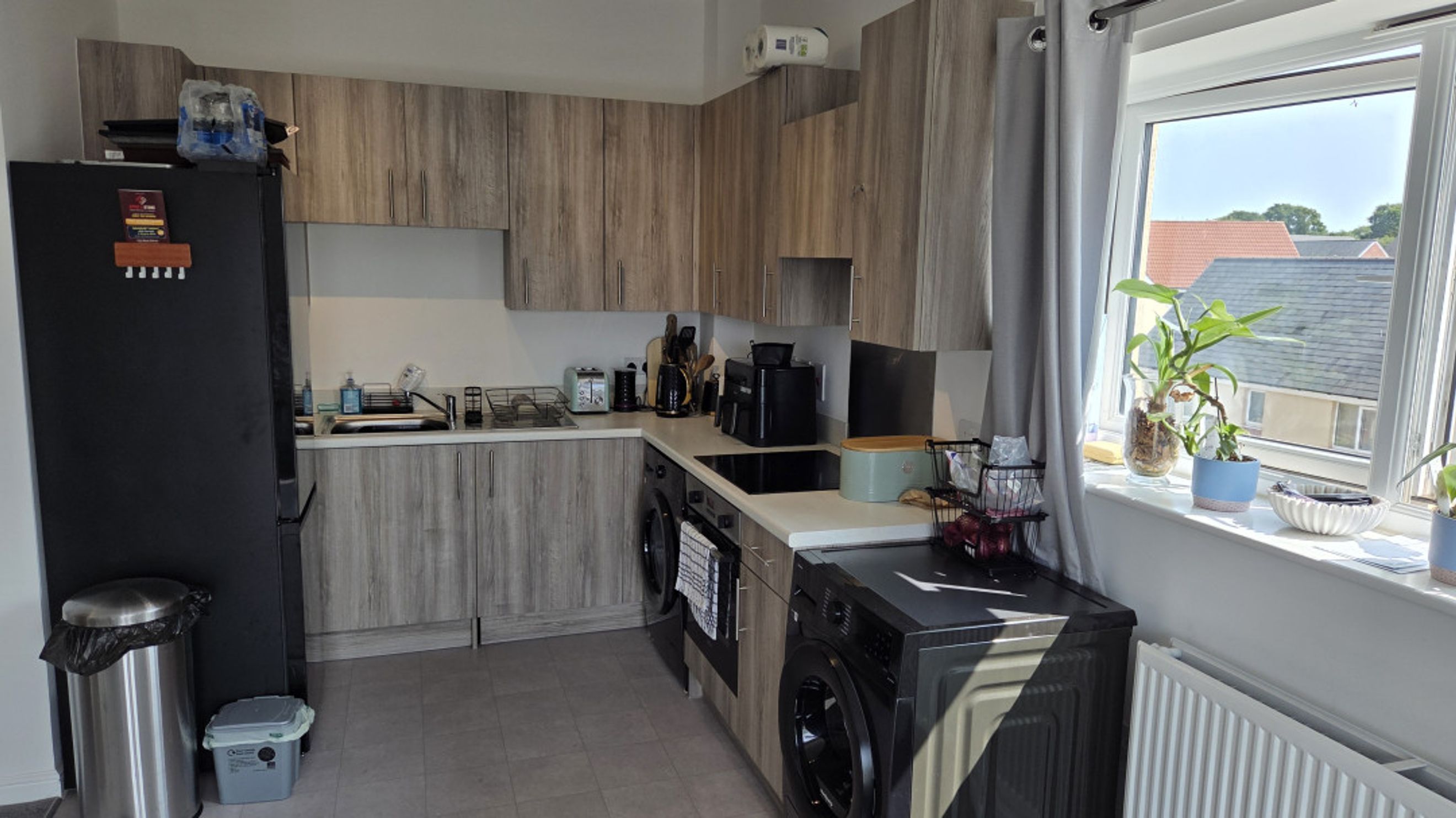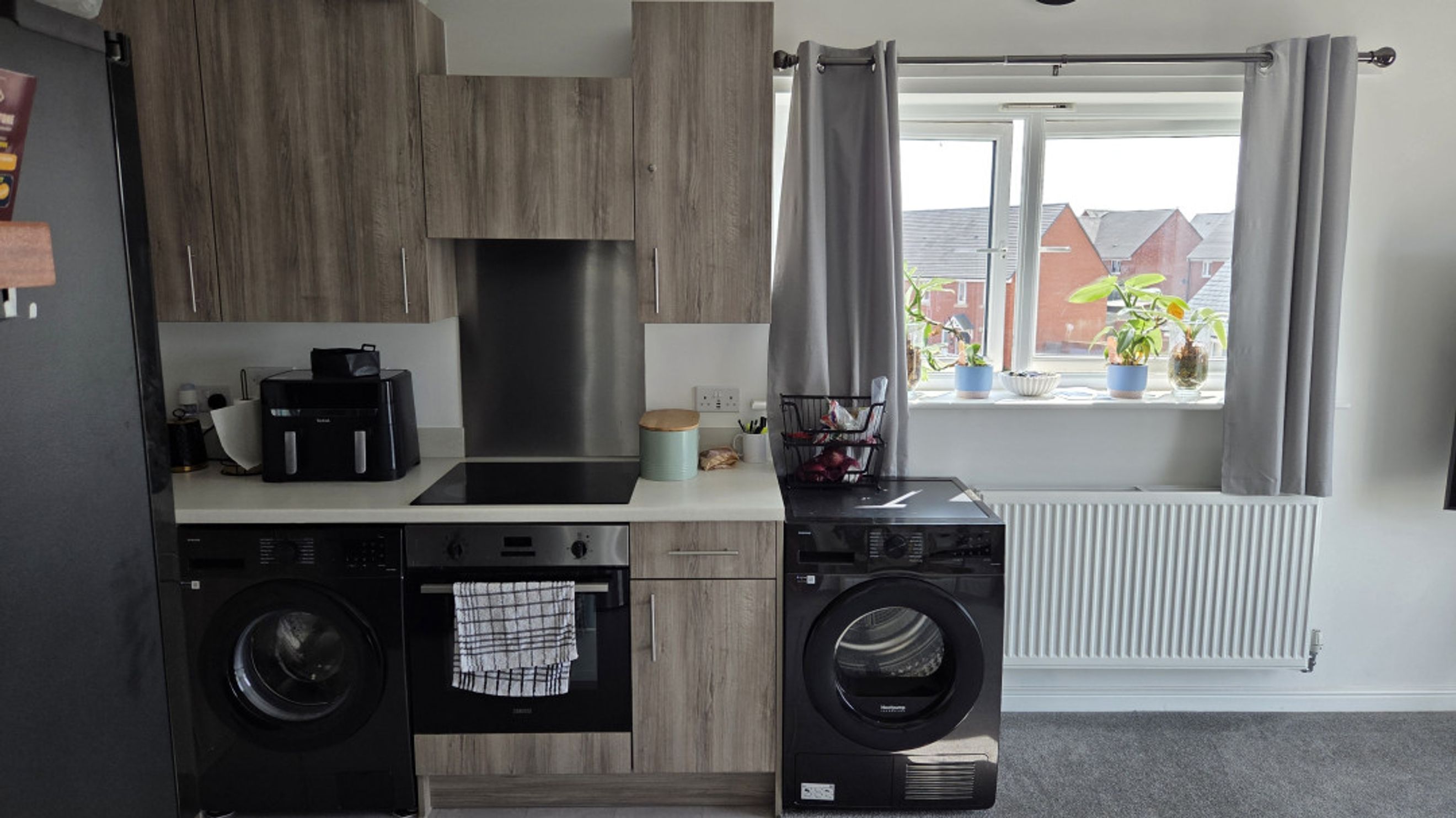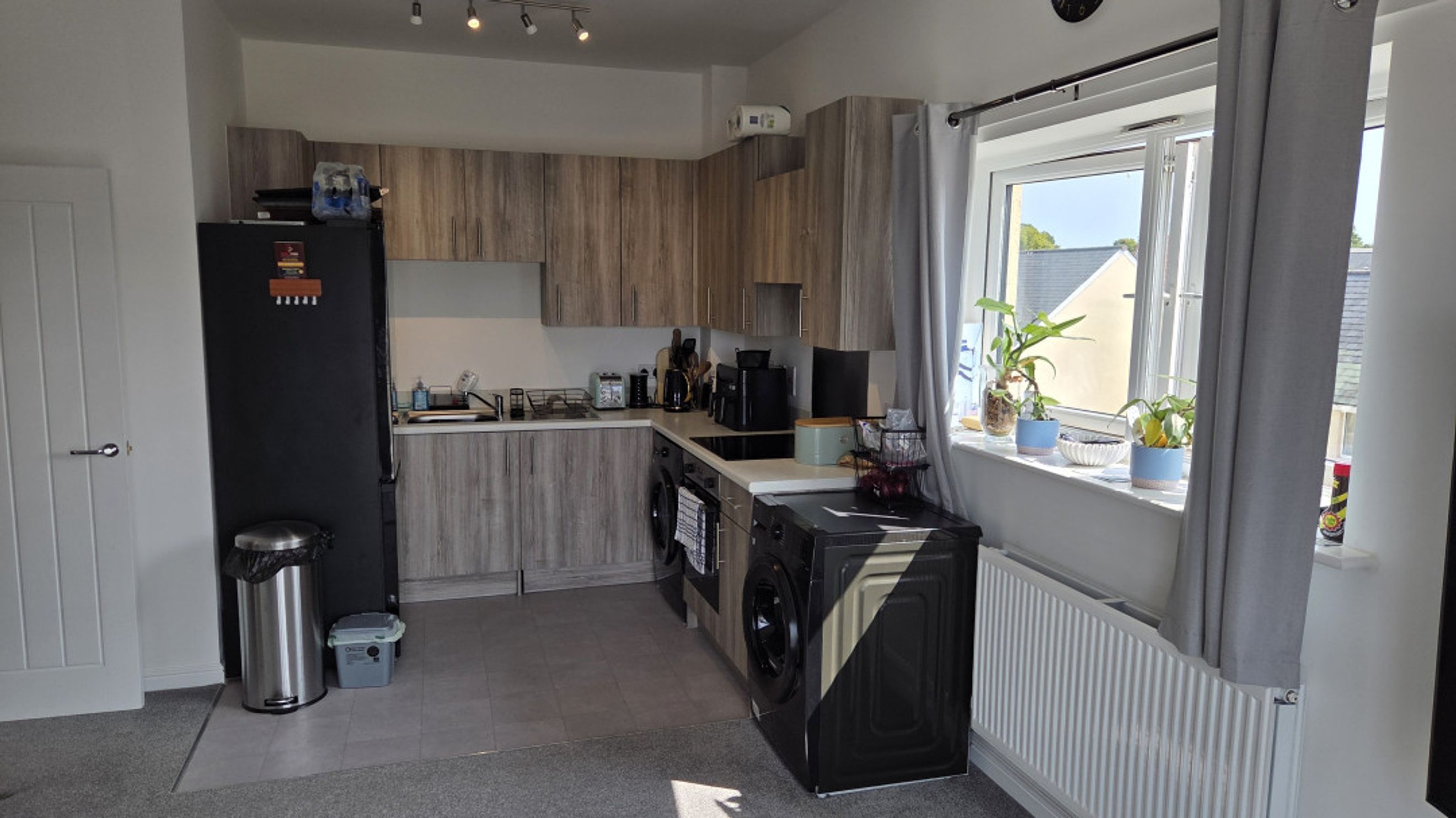 The open-plan living room and kitchen create a bright and sociable space. The living area features plush carpeted flooring, a telephone point, TV aerial point, and SKY/cable connection, making it ideal for relaxing or entertaining. The kitchen is defined by sleek laminate flooring and includes an electric hob and oven, with dedicated space for a fridge/freezer and washer/dryer.