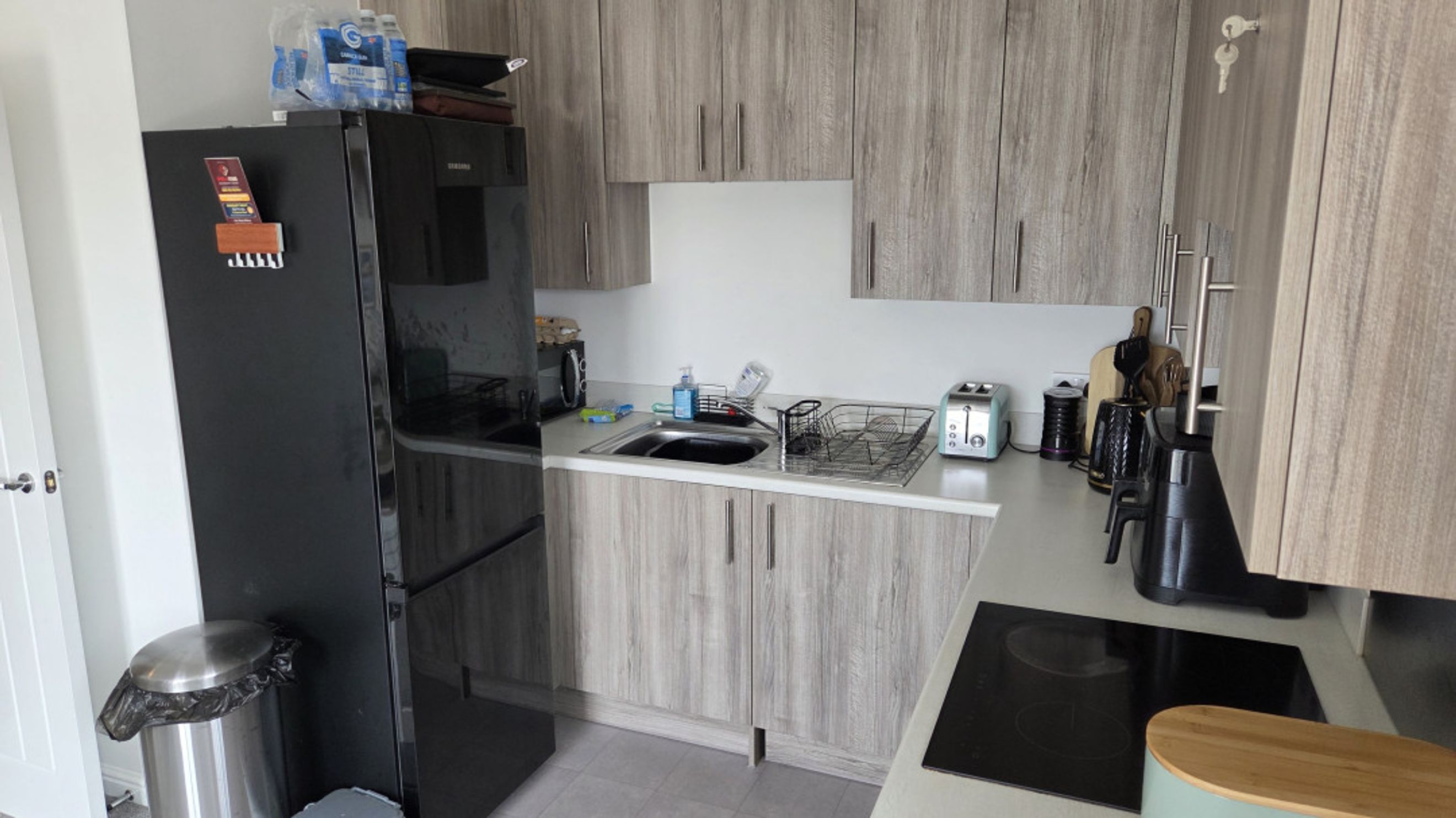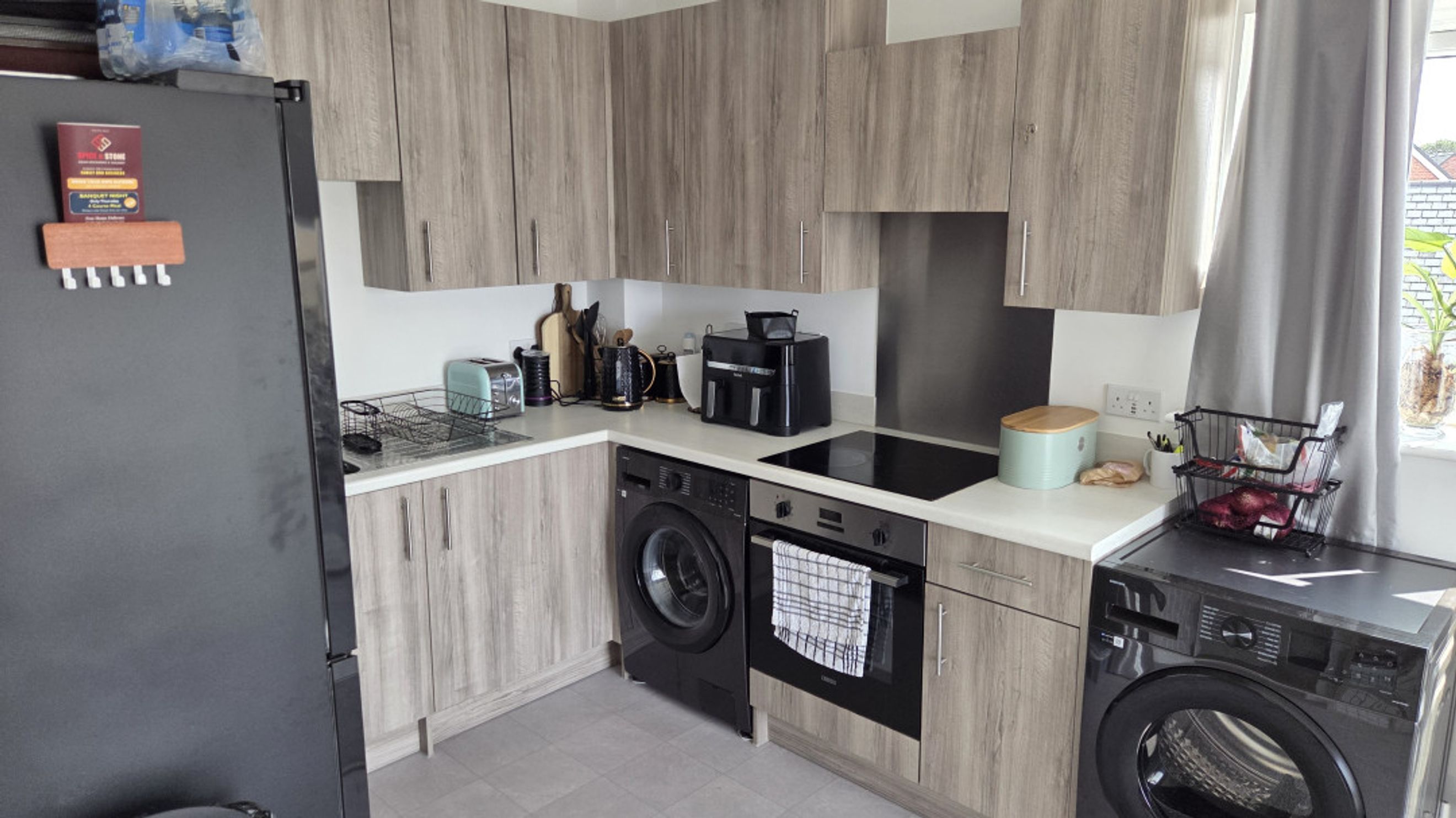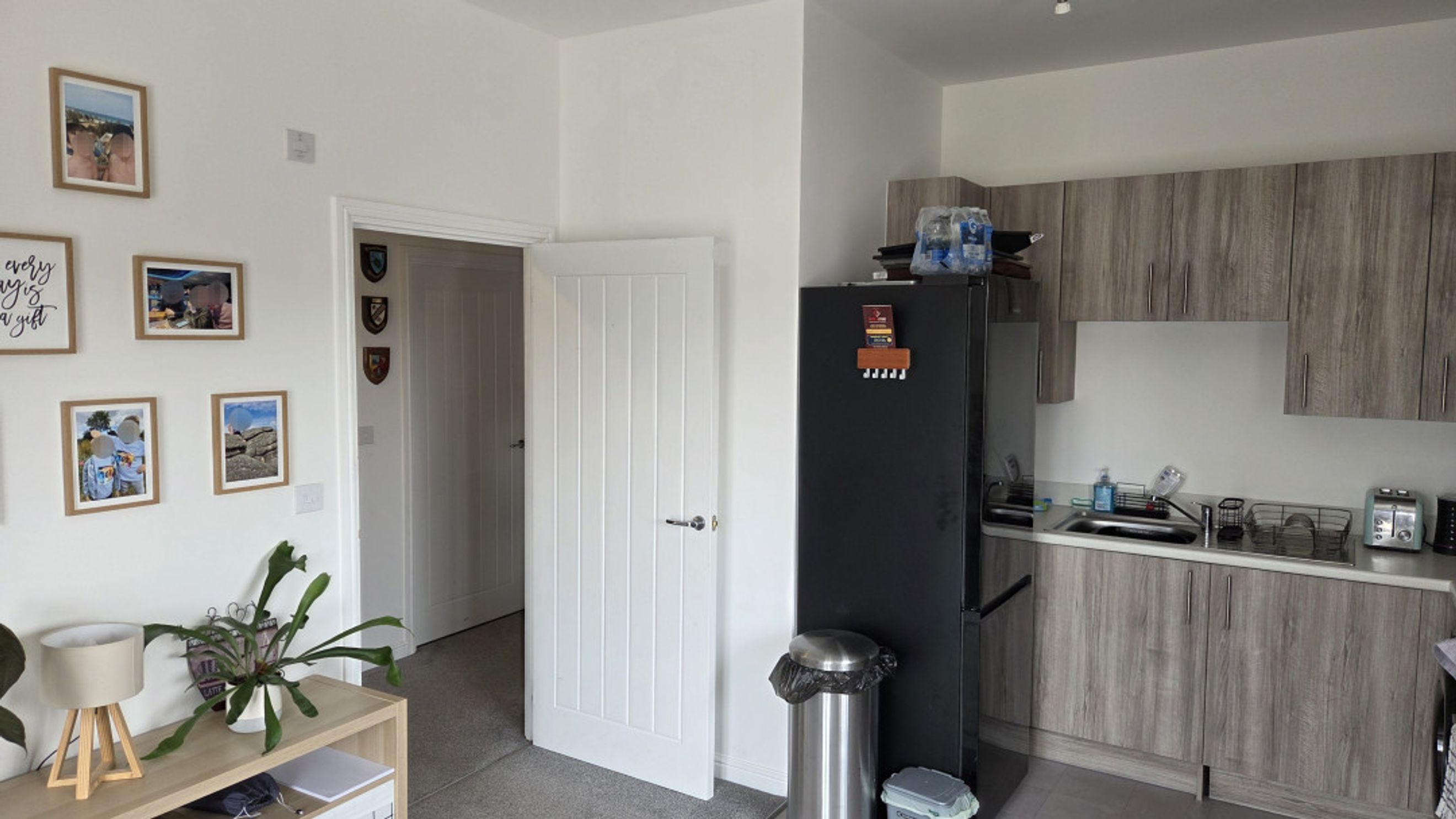 The open-plan living room and kitchen create a bright and sociable space. The living area features plush carpeted flooring, a telephone point, TV aerial point, and SKY/cable connection, making it ideal for relaxing or entertaining. The kitchen is defined by sleek laminate flooring and includes an electric hob and oven, with dedicated space for a fridge/freezer and washer/dryer.