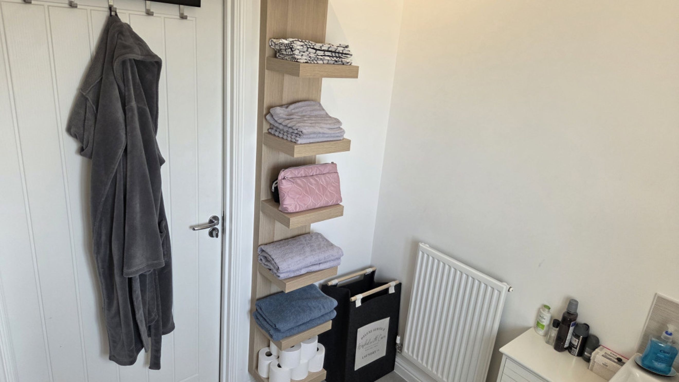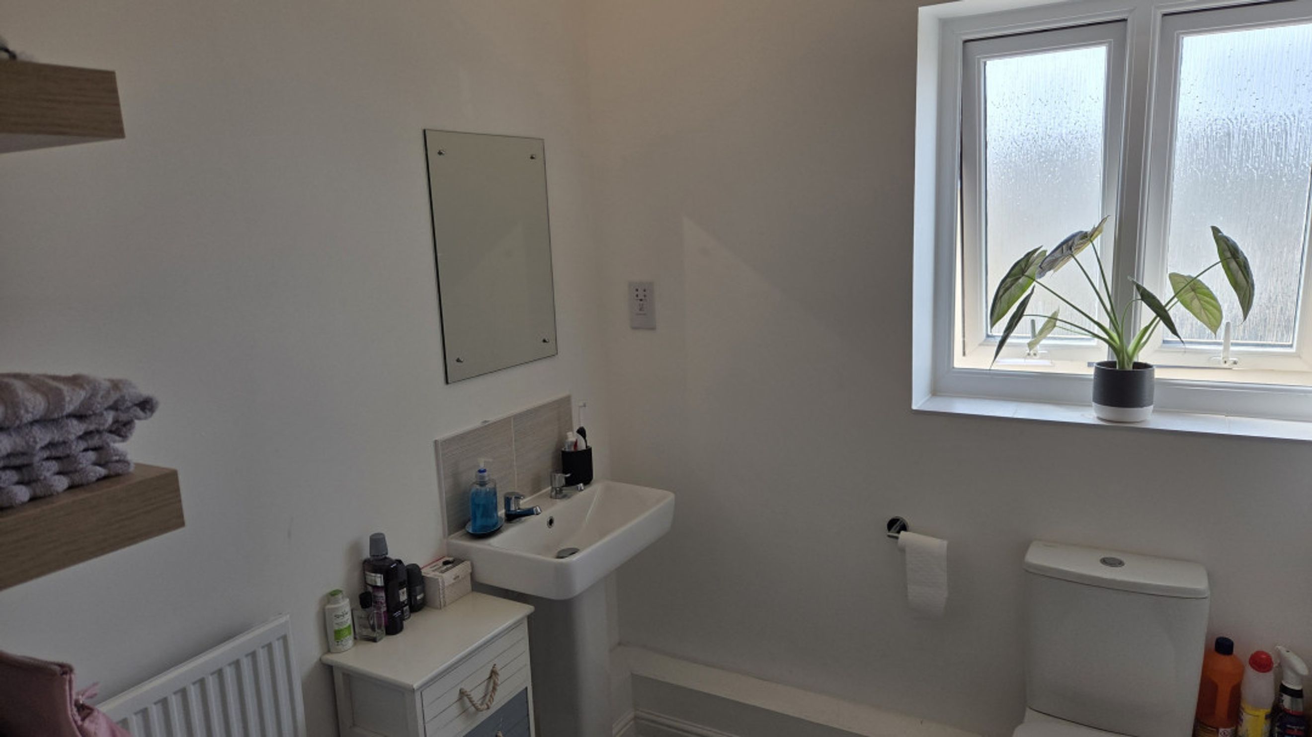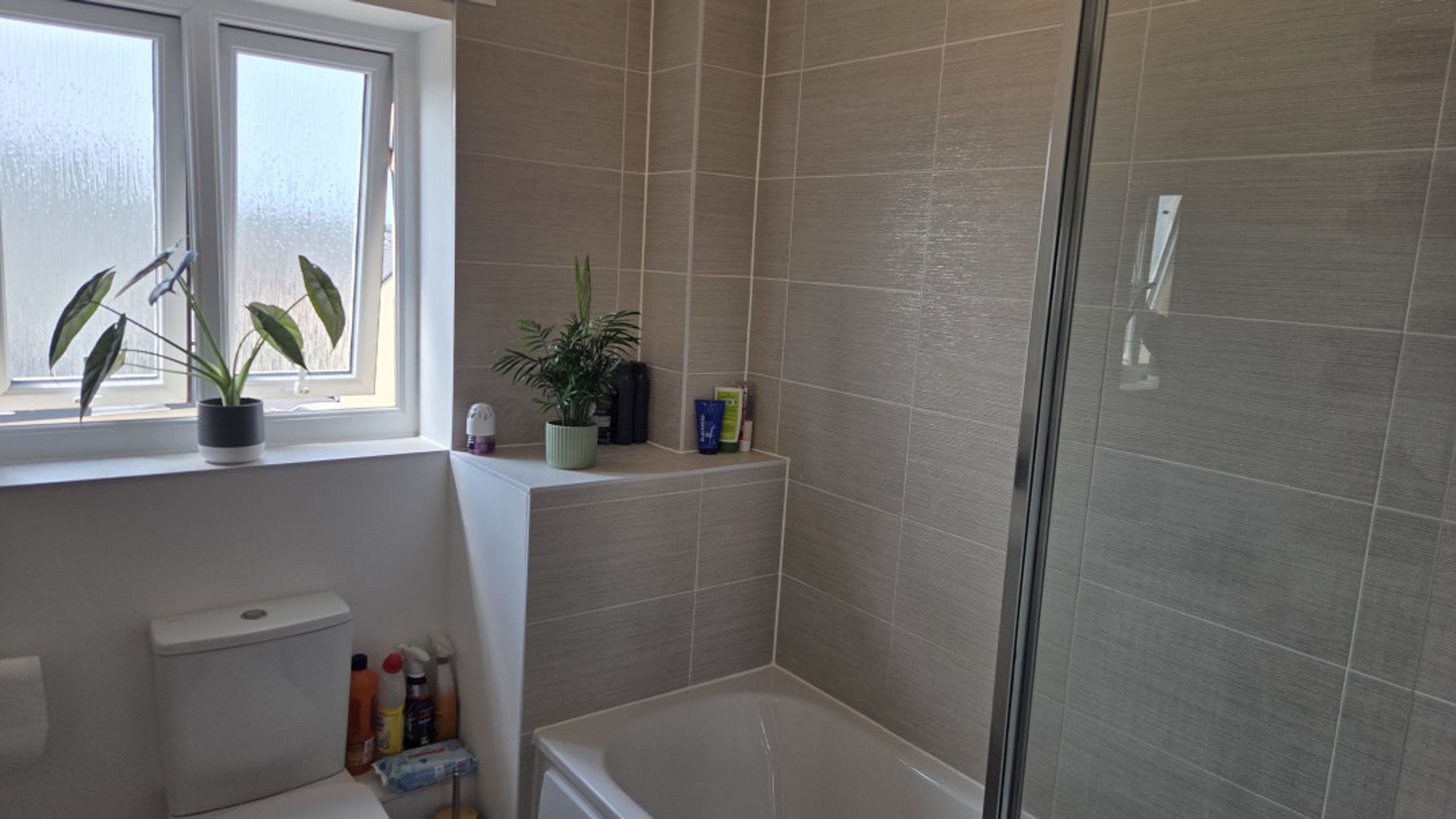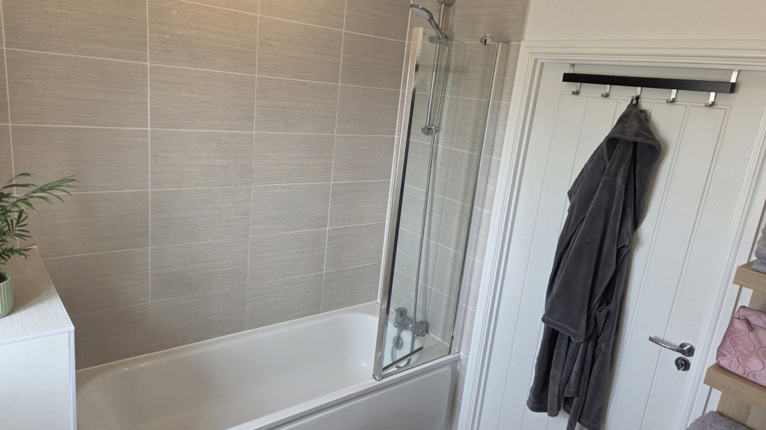 The bathroom is stylishly finished with laminate flooring, partial tiling, and a shower over the bath for added convenience.