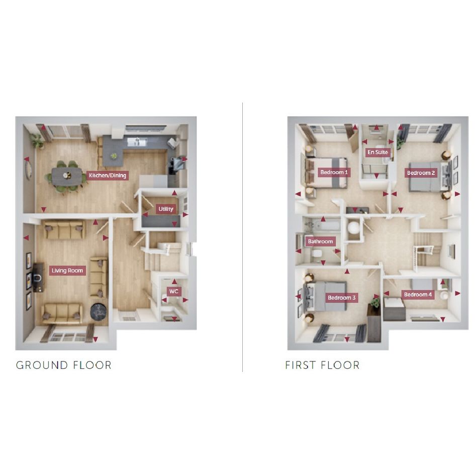 The stylish open-plan kitchen/dining area features a breakfast bar and French doors opening to the rear garden. A dedicated utility room with outside access and a convenient downstairs WC complete the ground floor. Upstairs, a large landing connects four spacious bedrooms, including bedroom one with built-in wardrobe and a private en-suite. A contemporary family bathroom serves the remaining three bedrooms. This home comes with solar panels as standard and includes a single garage and two parking spaces.