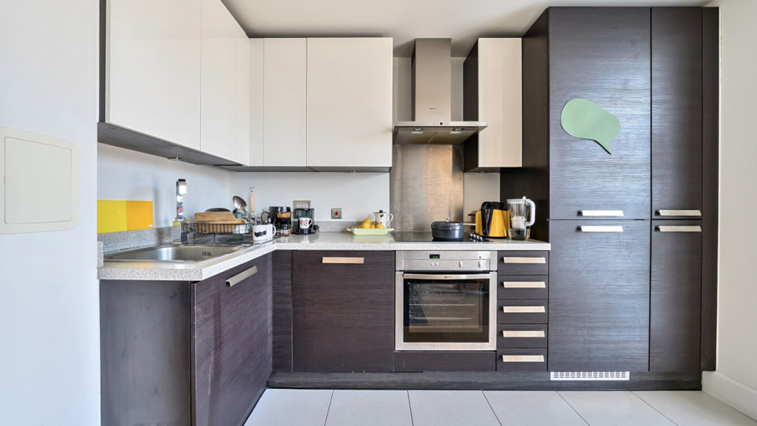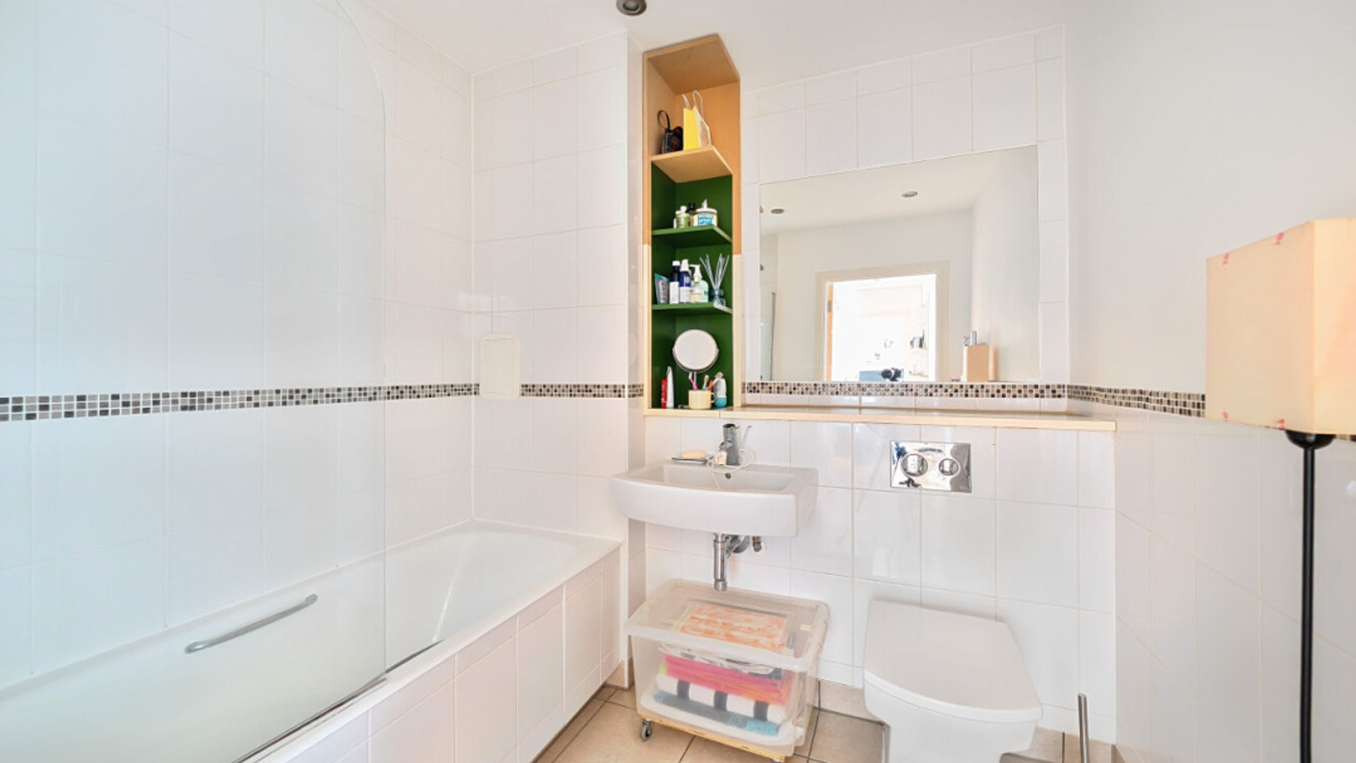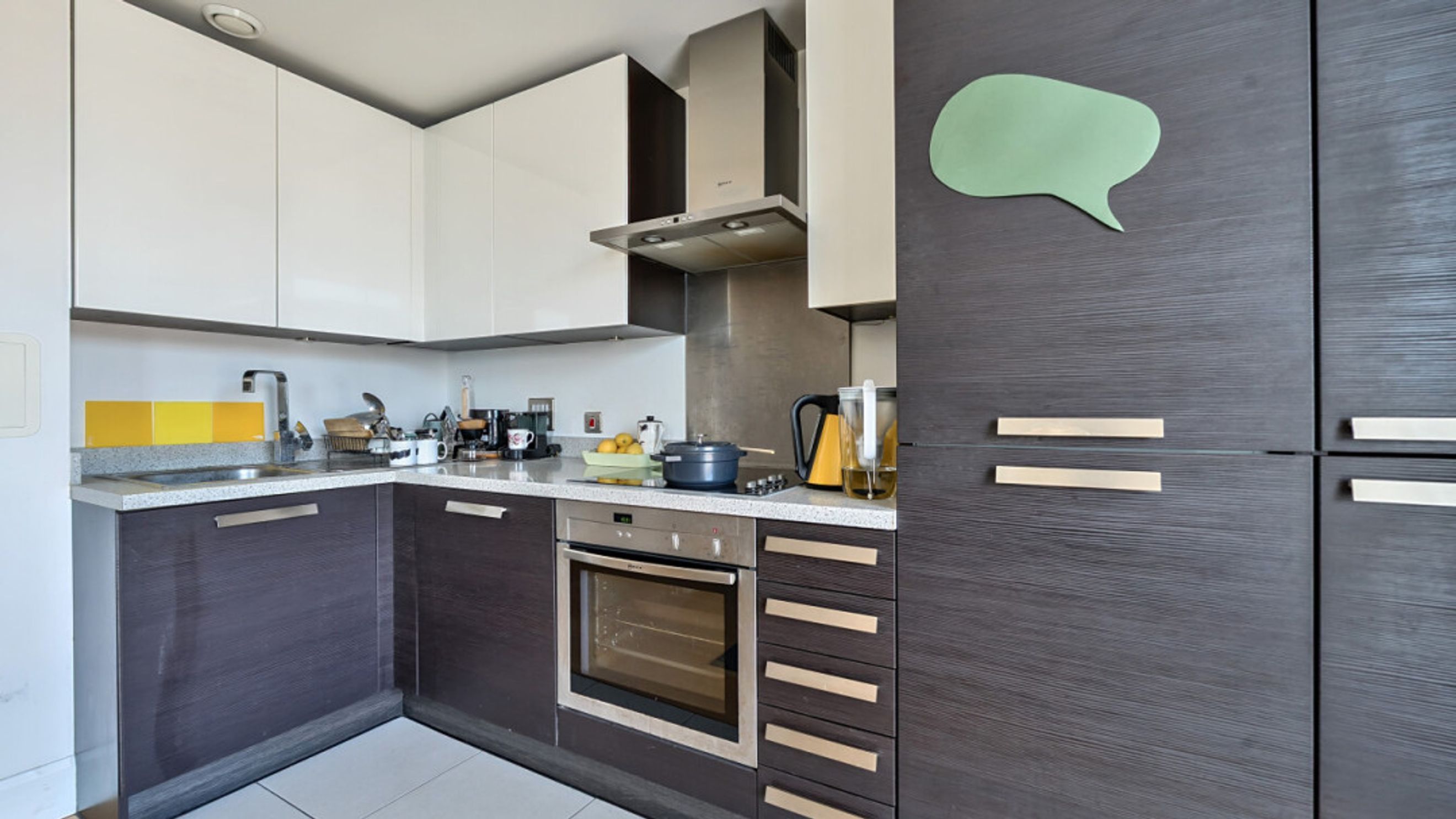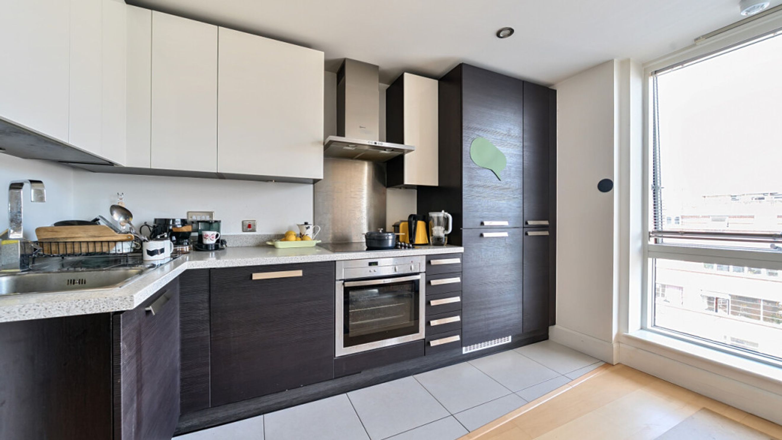 All rooms lead from a central hallway in this modern triple aspect apartment. The light and bright and well proportioned dual aspect open plan living area, including a contemporary kitchen with integrated appliances, opens onto a private south east facing balcony. A generous dual aspect double bedroom, with fitted storage, and a family bathroom, complete the accommodation.