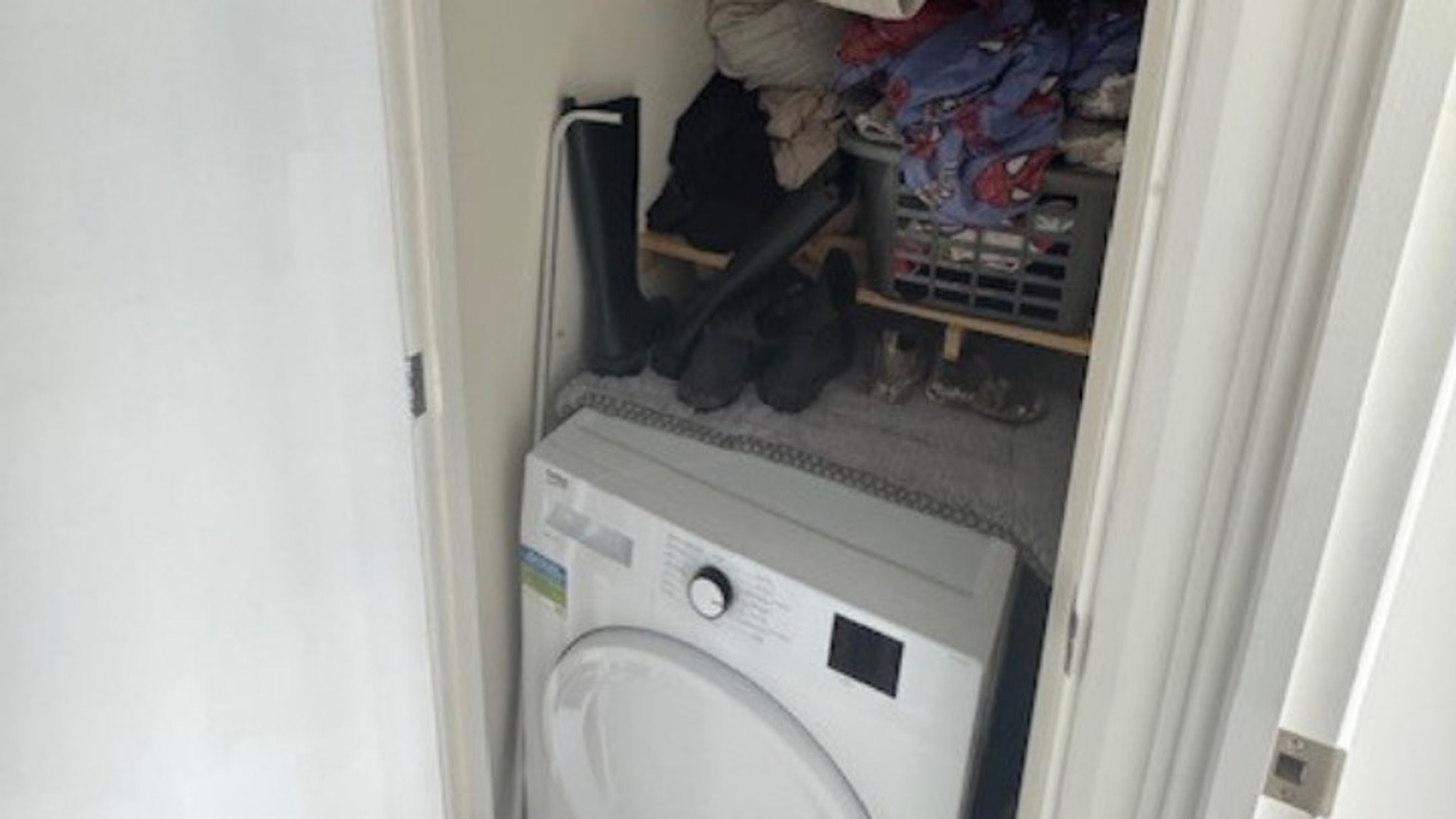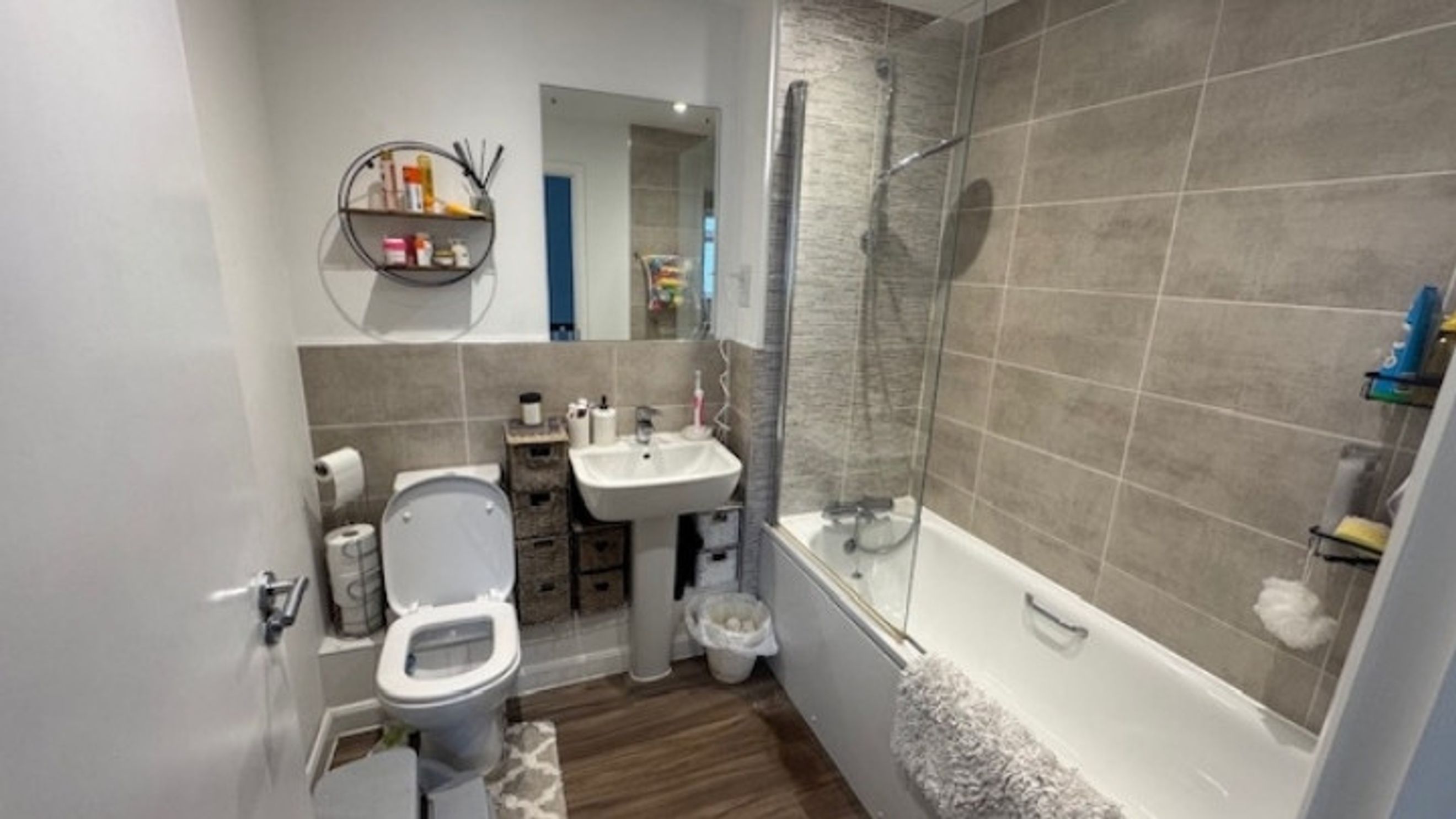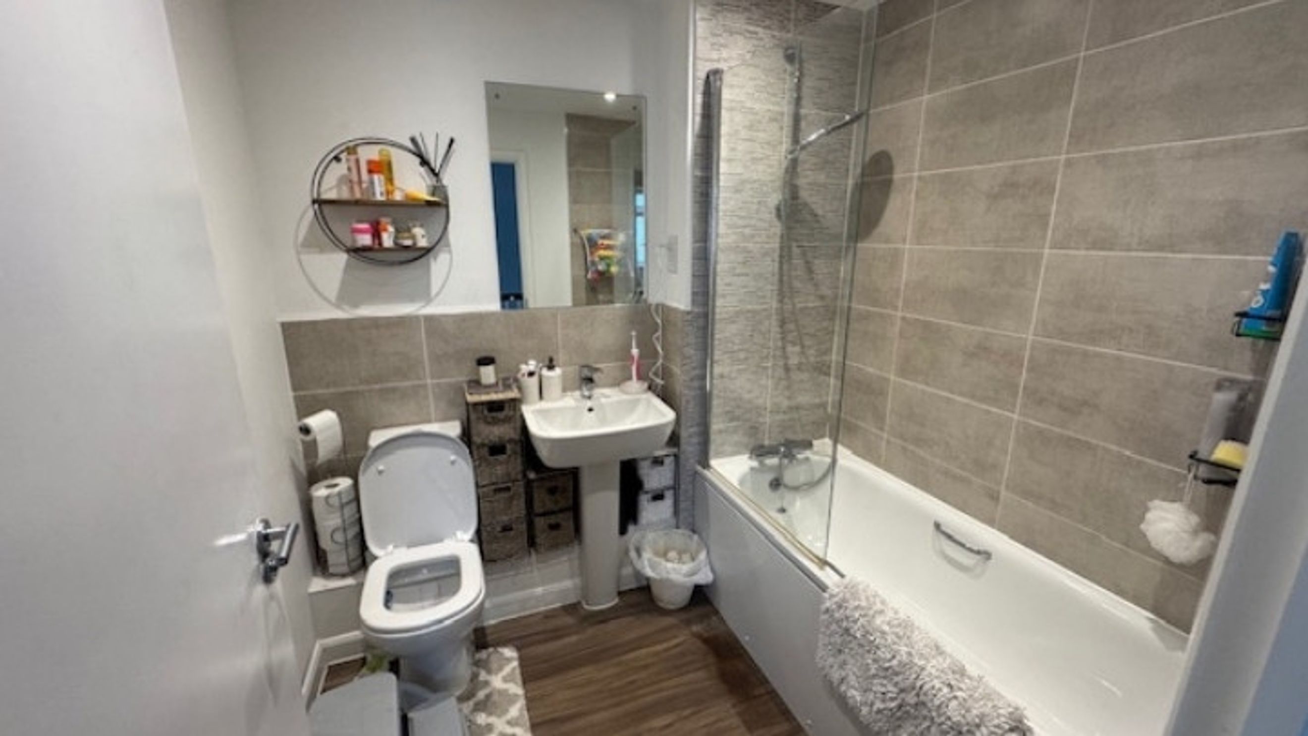 Upstairs, the bathroom is fitted with a white suite, shower over the bath, and neutral partial tiling, all complemented by laminate flooring. Both bedrooms are carpeted in a plush cream carpet, with bedroom one featuring a fitted double wardrobe for ample storage.