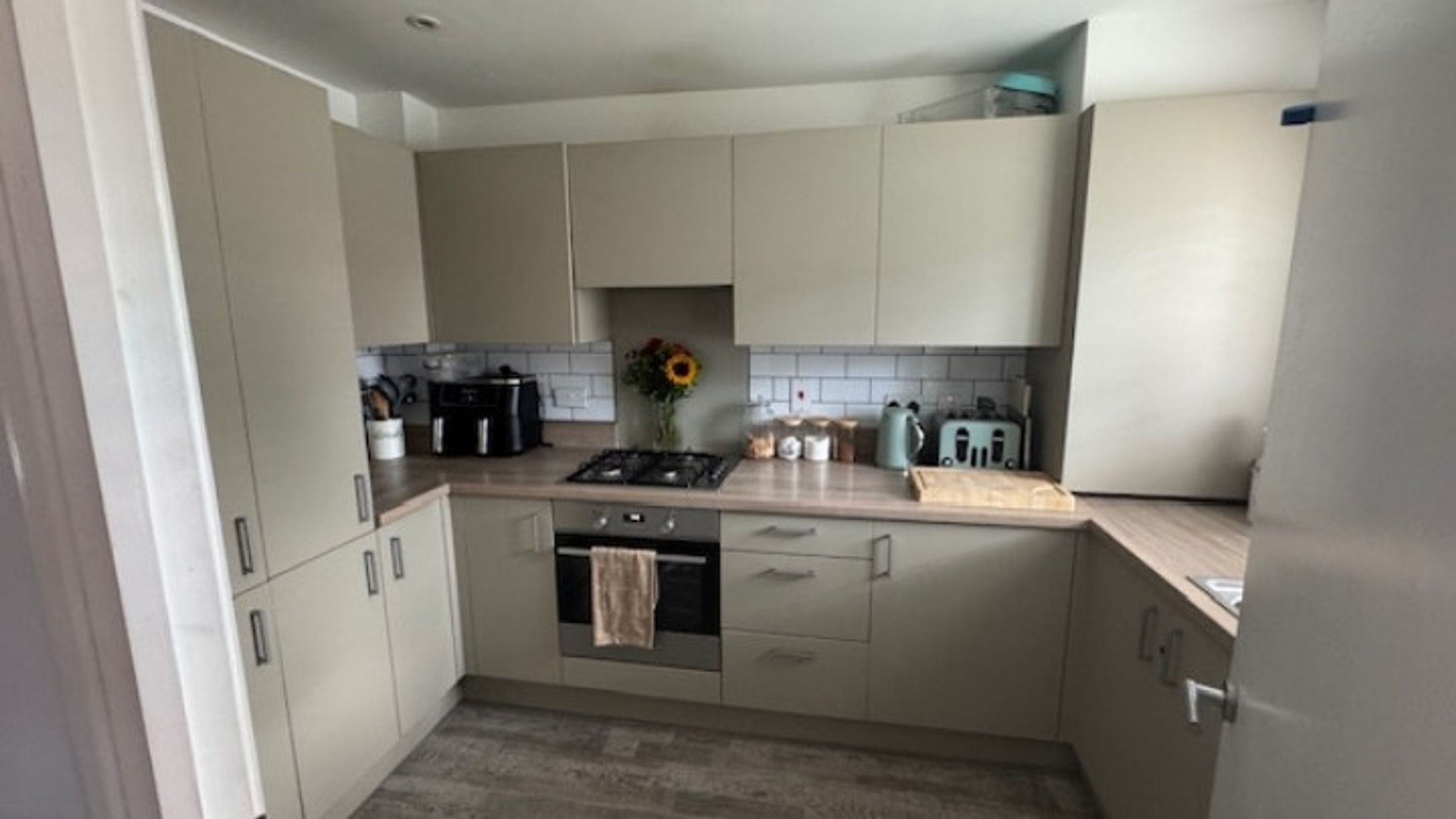 The modern kitchen boasts neutral cabinetry, laminate flooring, a gas hob and oven, an integral fridge/freezer, and space for a washer/dryer, making it both functional and attractive.
