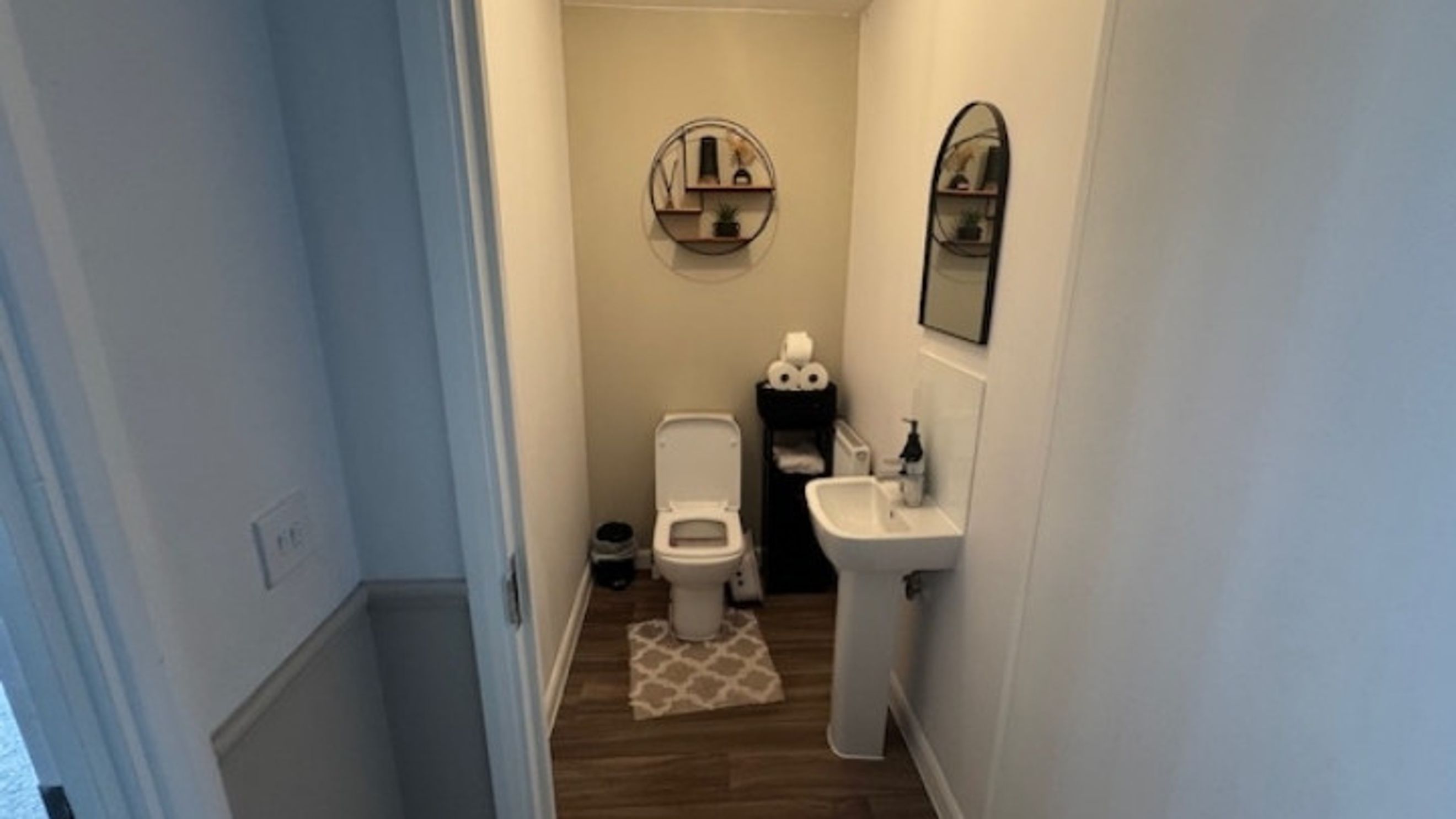 Step into a welcoming entrance hall with stylish laminate flooring, leading to a convenient downstairs cloakroom. At the rear of the property, the spacious living room features plush carpeting and is fully equipped with a telephone point, TV aerial, and SKY/cable connection.