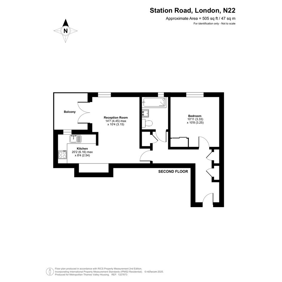 The property on the second floor comprises an entrance hall with storage cupboards, a spacious living room, a separate modern fitted kitchen, one double bedroom, and a bathroom.