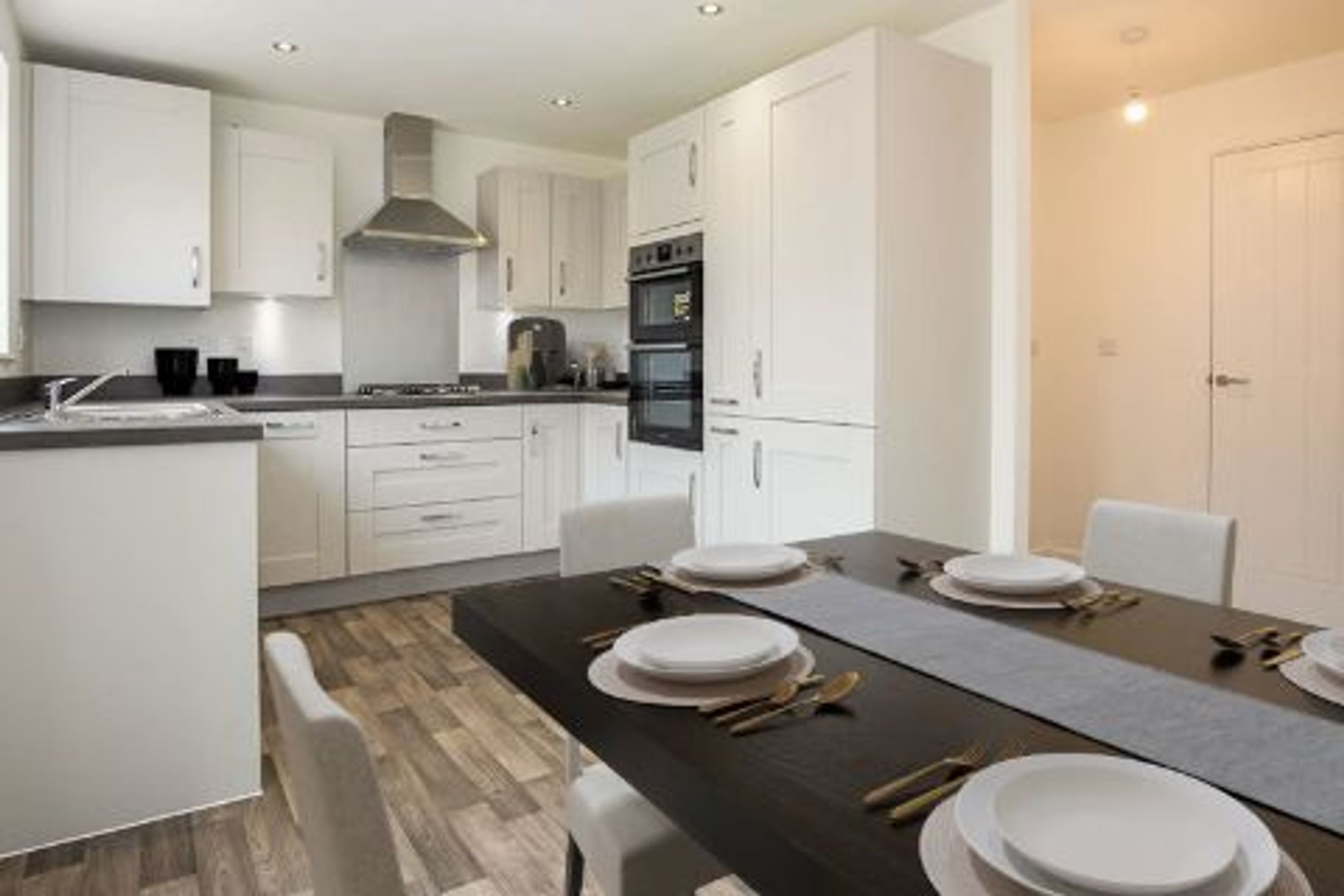 At the front of the home is the contemporary kitchen/diner, boasting a Symphony kitchen, complete with integrated appliances including a fridge freezer, oven, hob, and cooker hood. This is a great space for cooking, eating and entertaining.