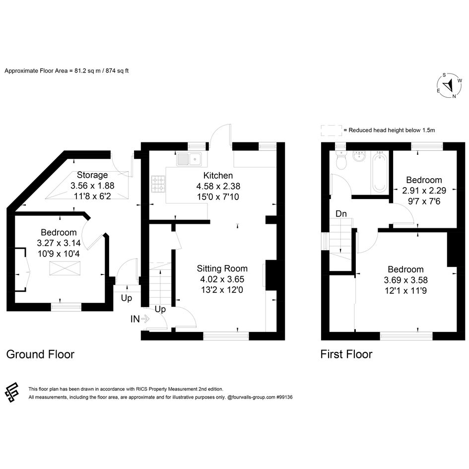 The ground floor features a welcoming reception room, a modern kitchen with direct access to the garden, a dedicated office room, and a separate storeroom. Upstairs, the first floor comprises two double bedrooms and a family bathroom.