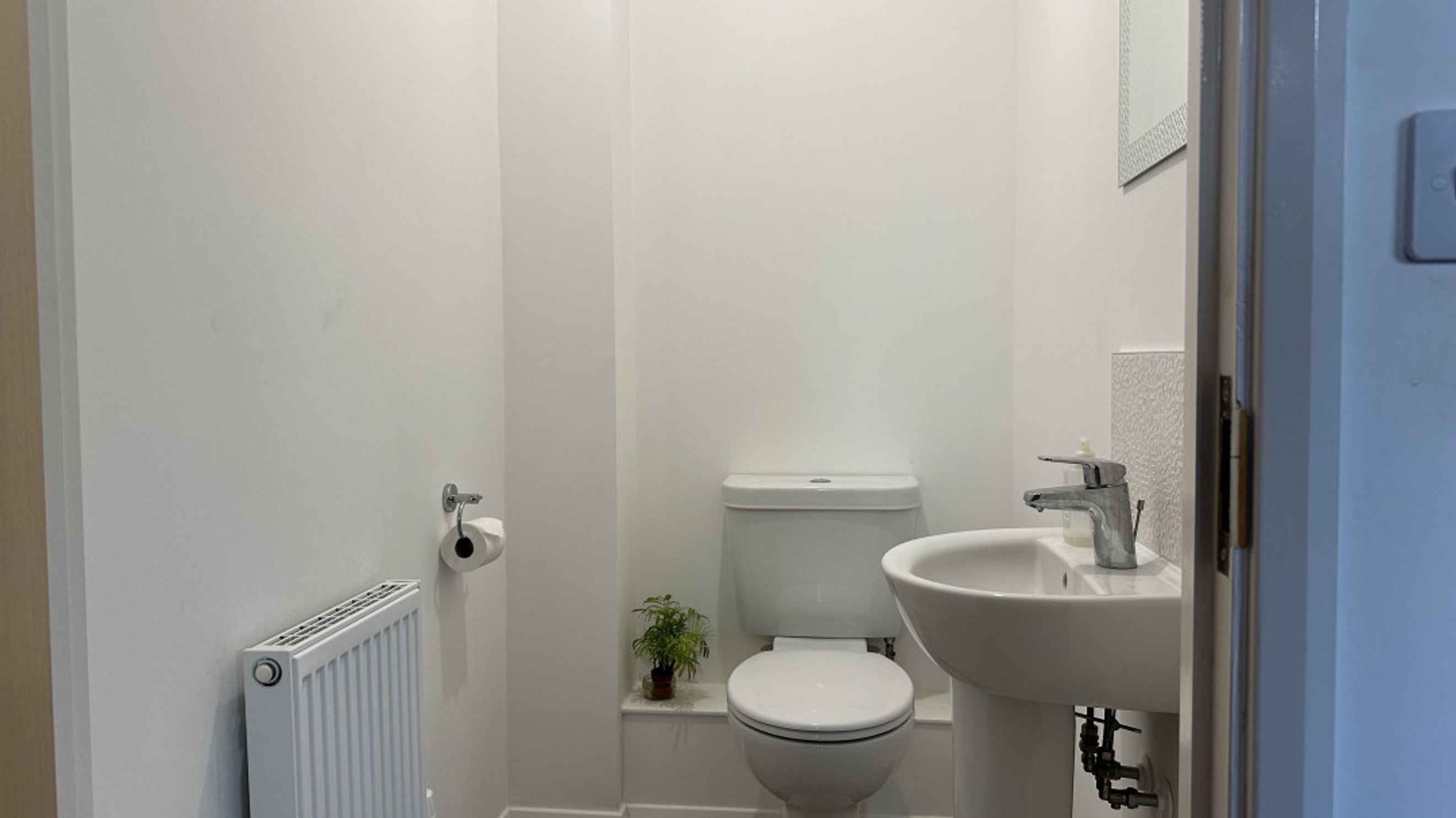 Step into a carpeted entrance hall that leads to a spacious living room, also carpeted, featuring a TV aerial point-perfect for relaxing or entertaining. The kitchen/diner boasts vinyl flooring, a gas hob, electric oven, and ample space for a fridge/freezer and washer/dryer. A rear door opens to the garden, and a downstairs cloakroom adds extra practicality.