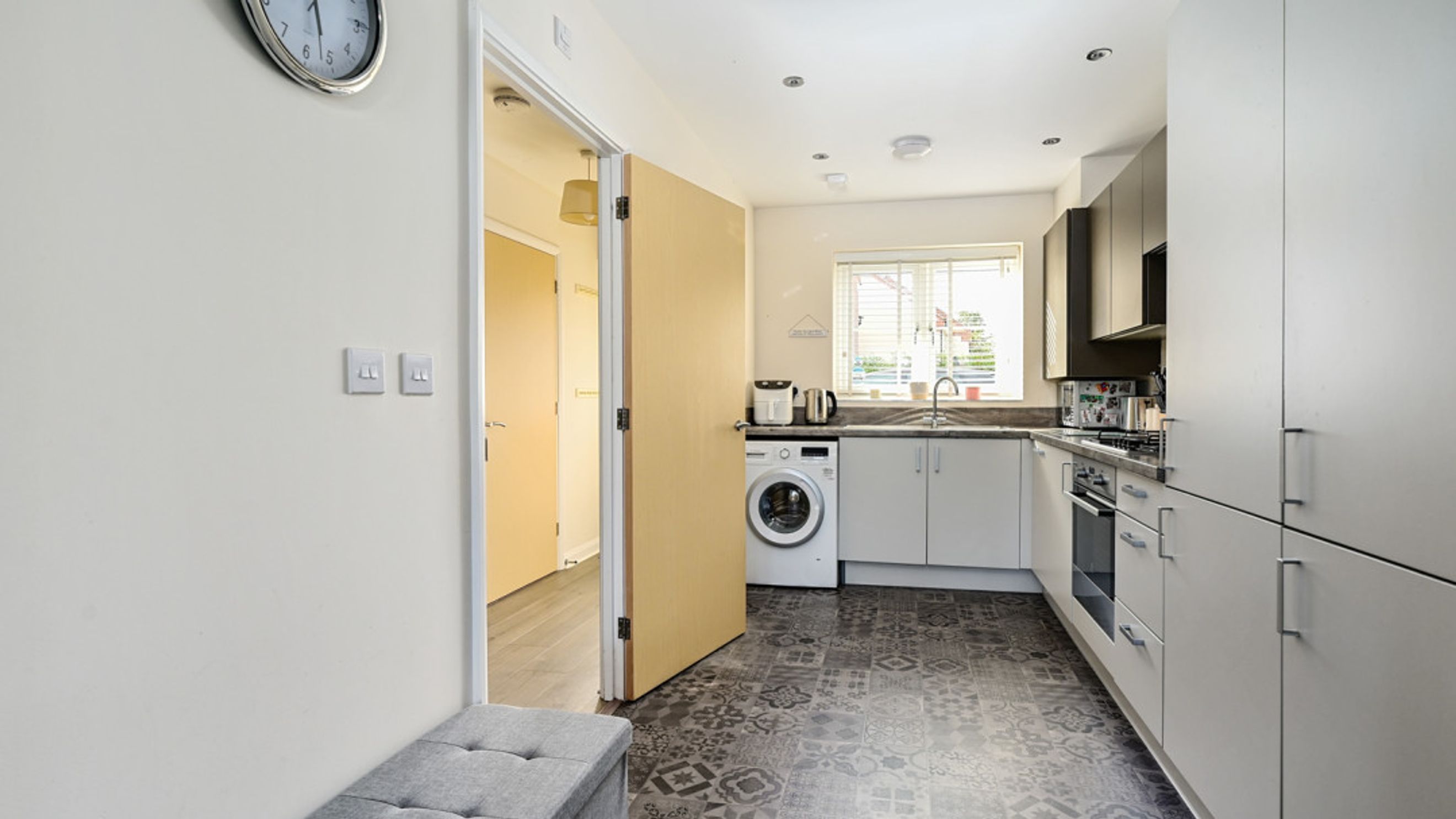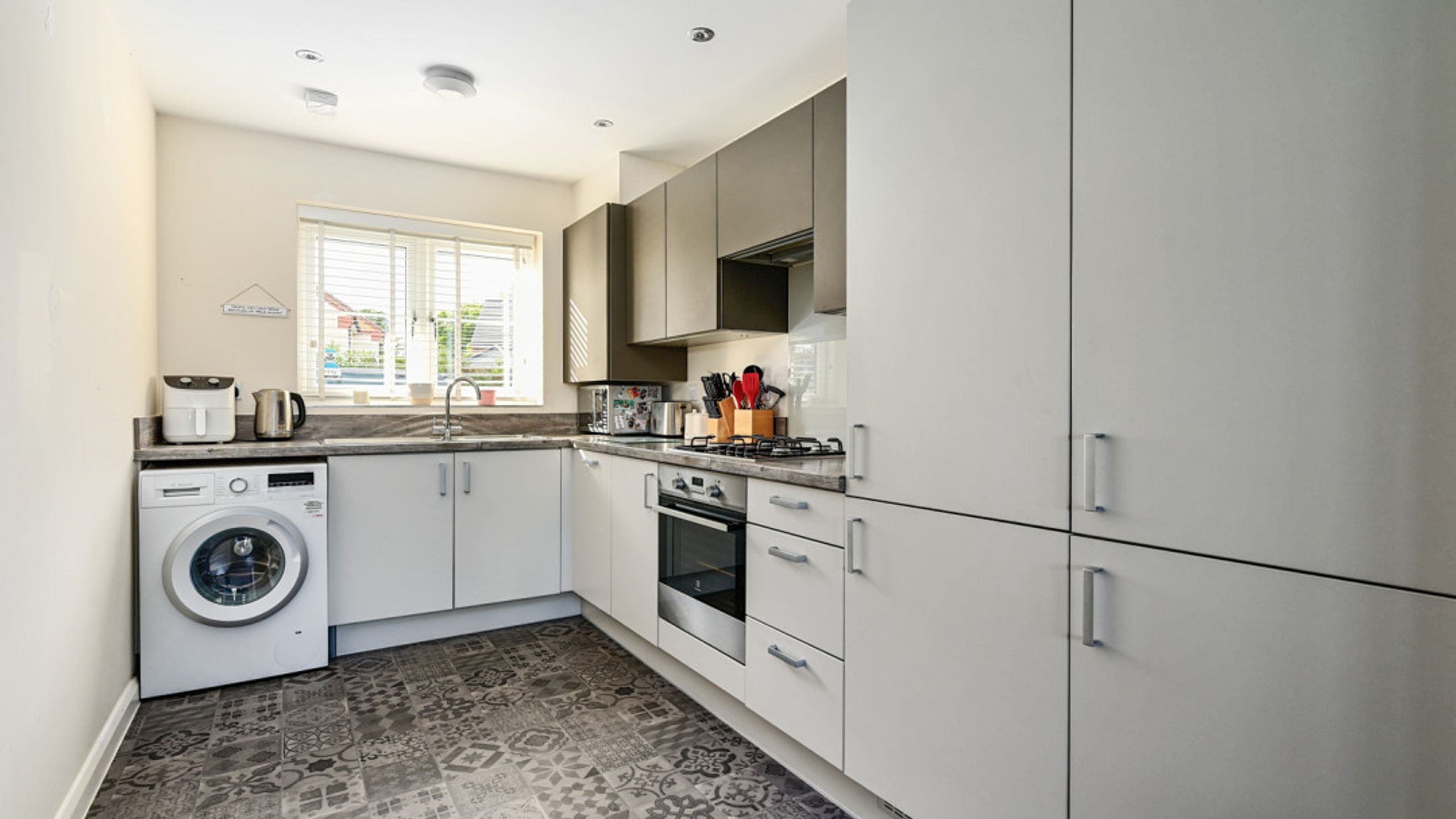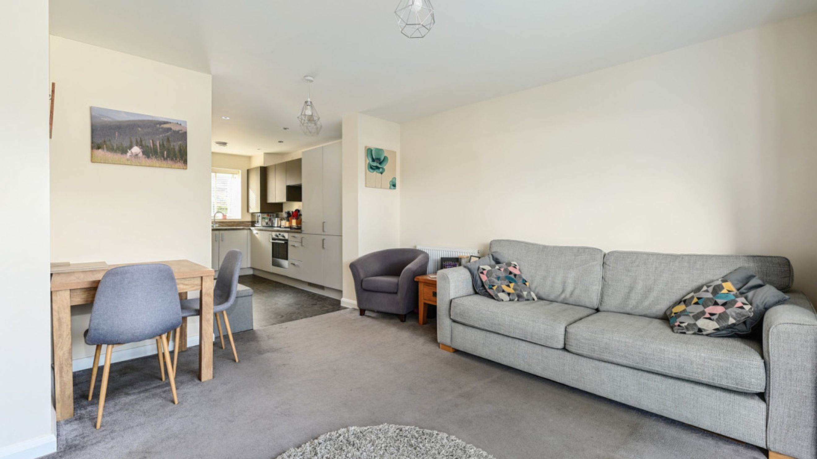 The kitchen seamlessly integrates with the living area while being subtly defined by laminate flooring. It boasts a modern gas hob, electric oven, and integral fridge/freezer-perfect for everyday cooking and entertaining.