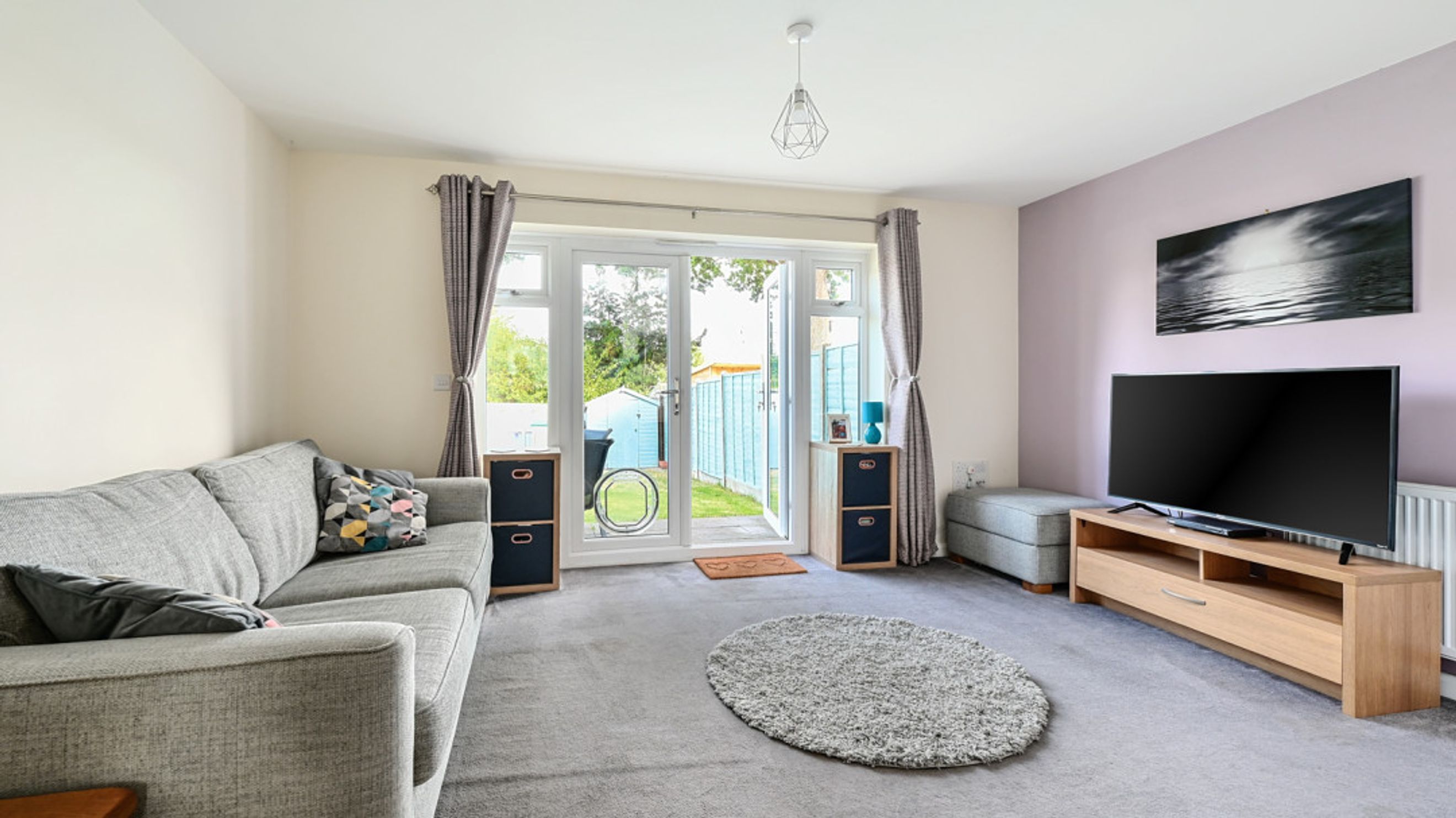 Upon entering, you're greeted by a welcoming entrance hall with sleek laminate flooring, leading to a convenient downstairs cloakroom. The heart of the home is the spacious open-plan living and dining area, featuring soft carpeting, a telephone point, TV aerial, SKY cable connection, and elegant double doors opening onto the rear garden. An understairs storage cupboard adds practicality to the space.