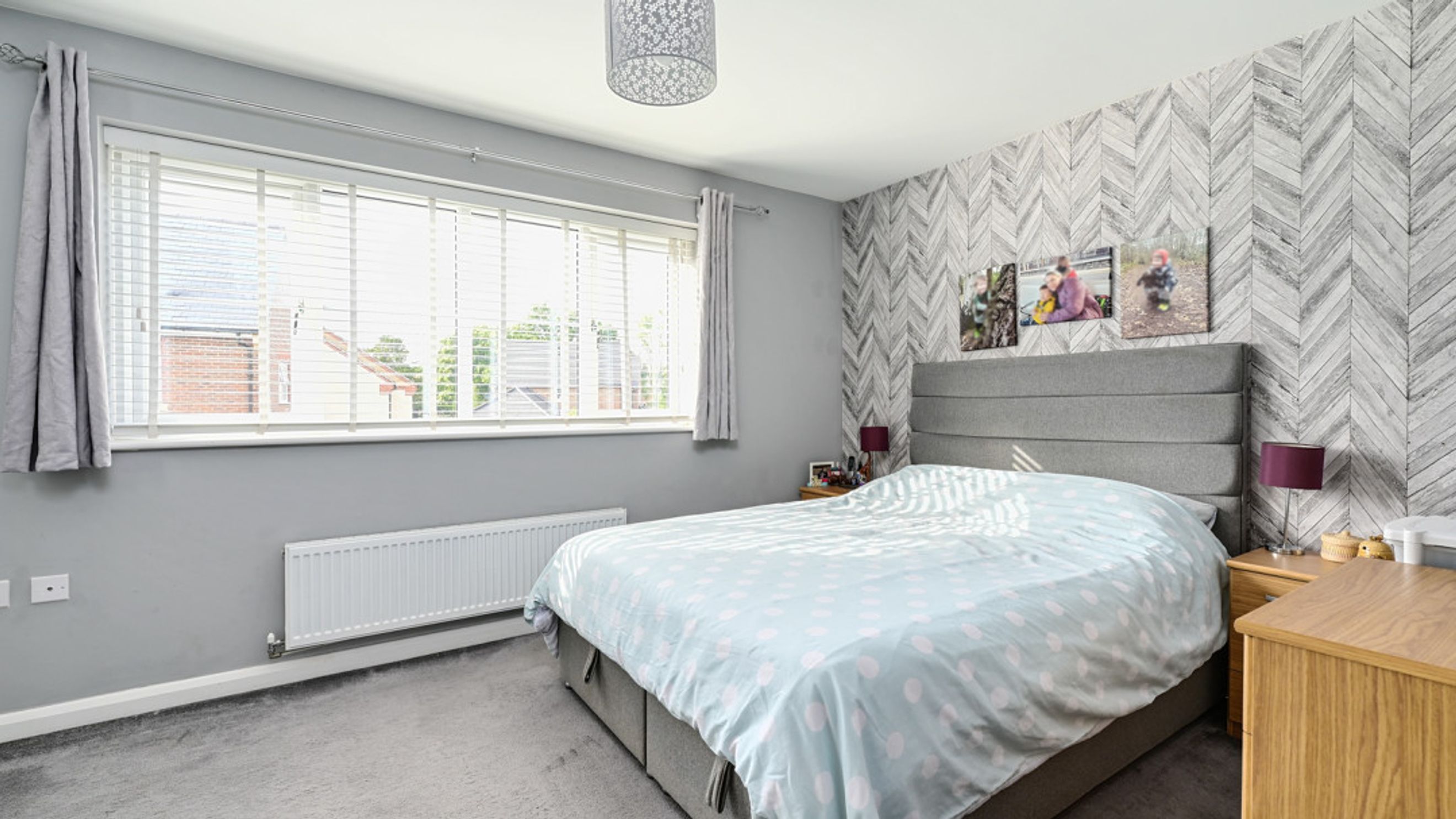 Upstairs, you'll find two generously sized, carpeted bedrooms. The main bedroom benefits from a fitted wardrobe and an airing cupboard, offering ample storage. The family bathroom features a clean white suite, laminate flooring, a shower over the bath, and partial tiling for a contemporary finish.