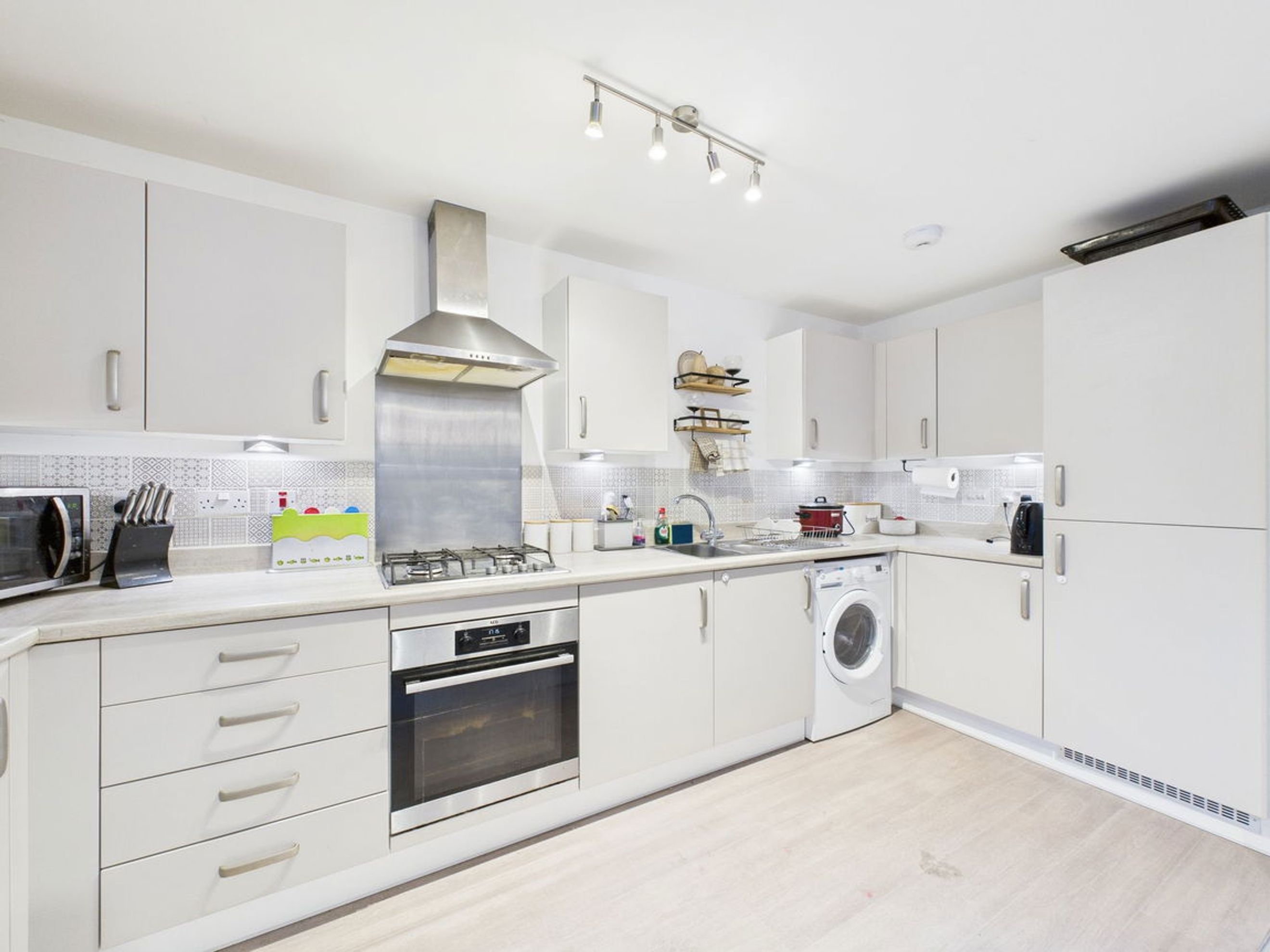 The Kitchen is fitted with a range integrated appliances as well as ample floor and wall mounted storage units .
