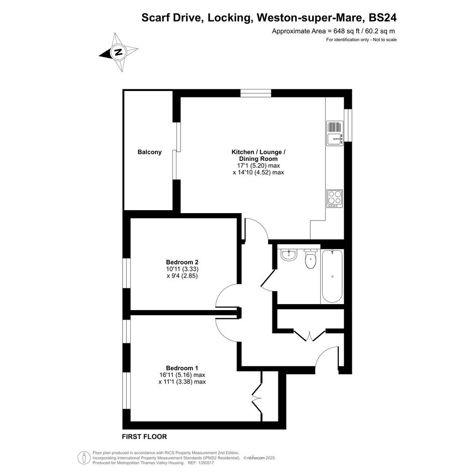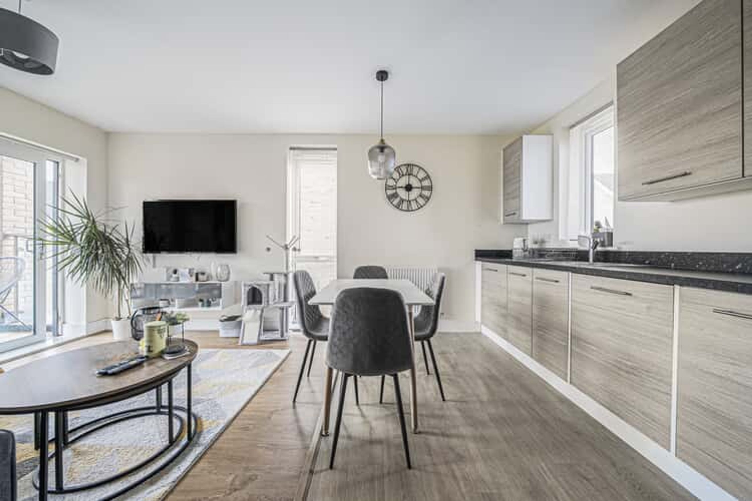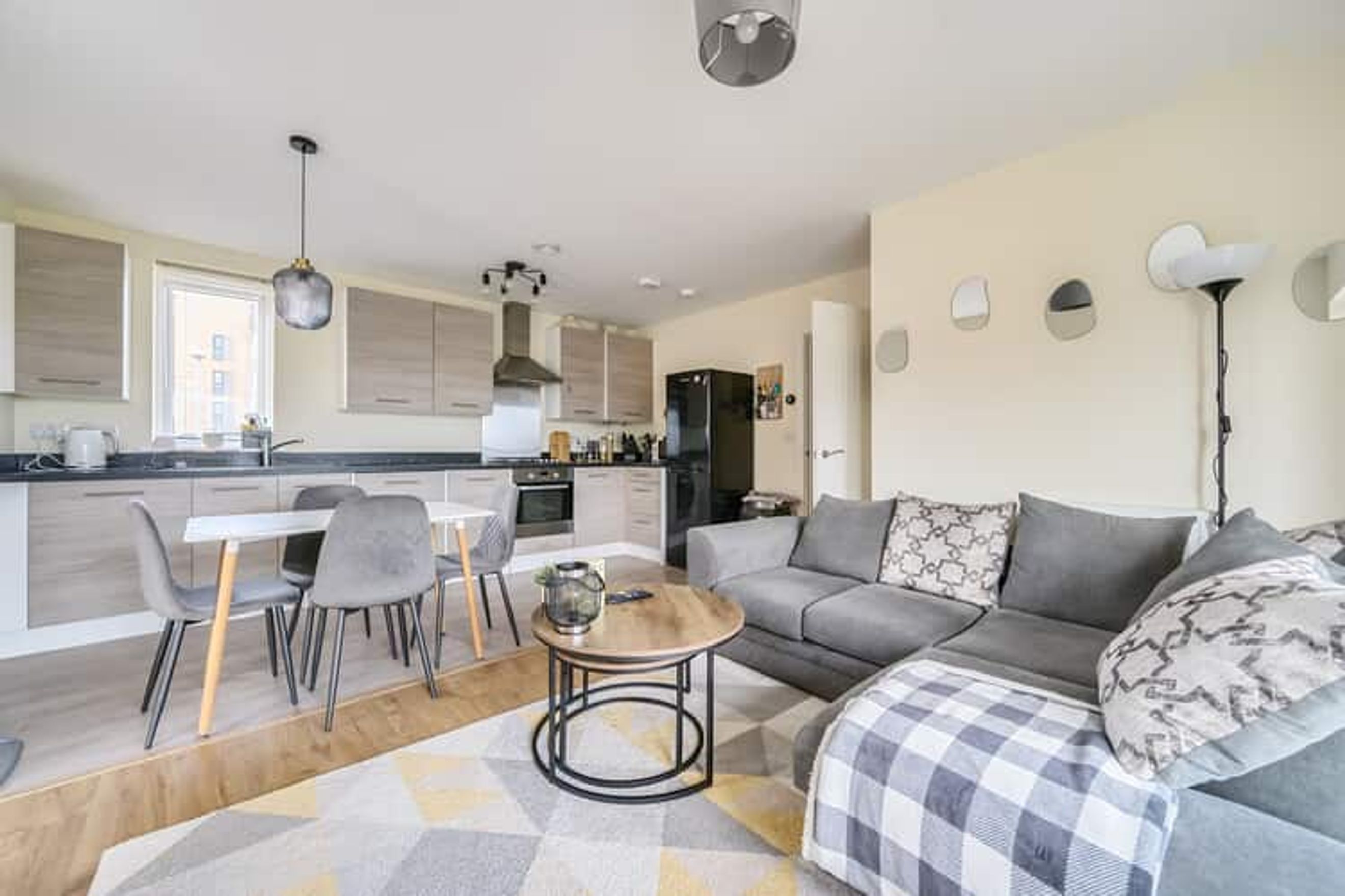 The property on the first floor comprises an entrance hall, a spacious living room with a modern open-plan kitchen, two double bedrooms and a bathroom.