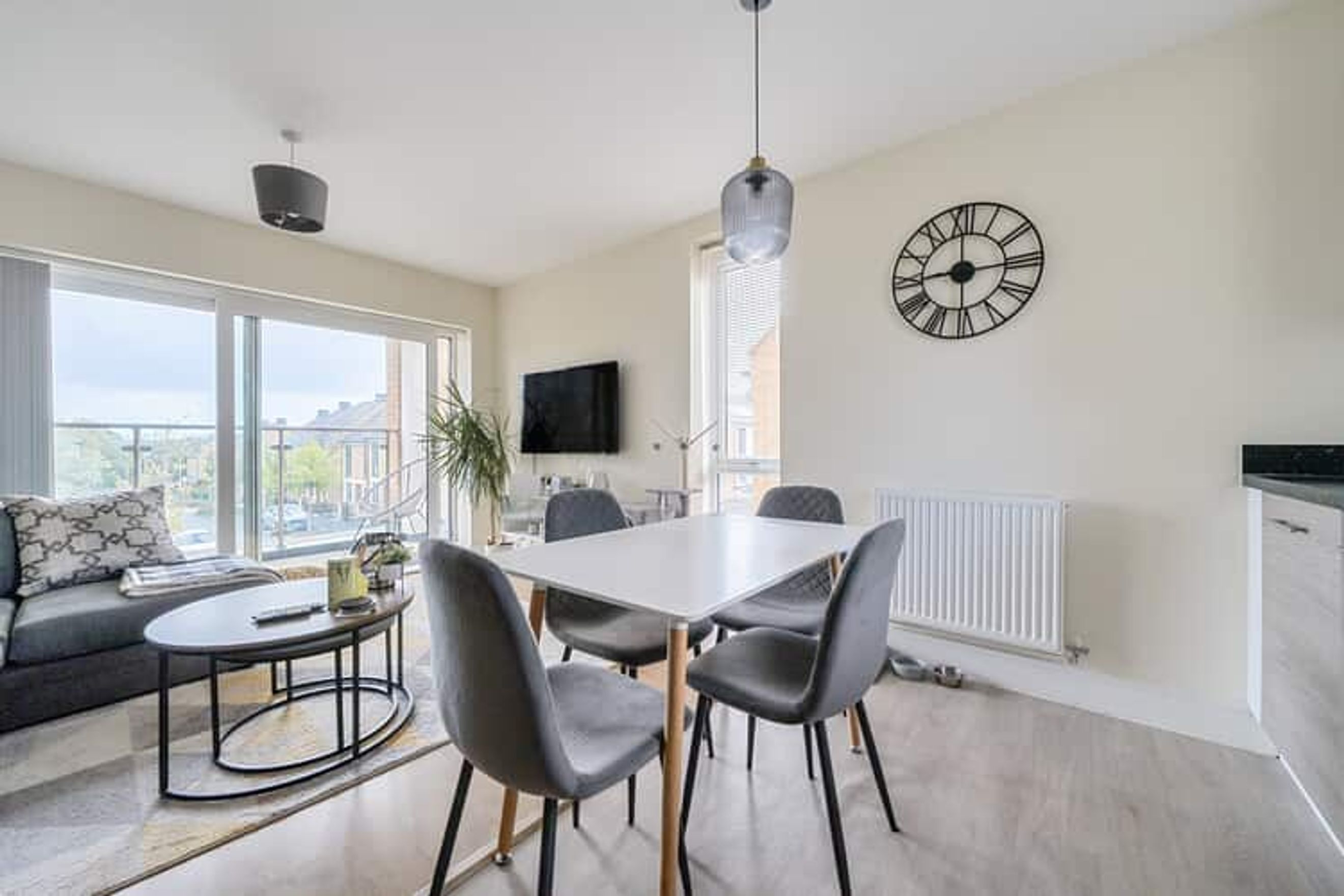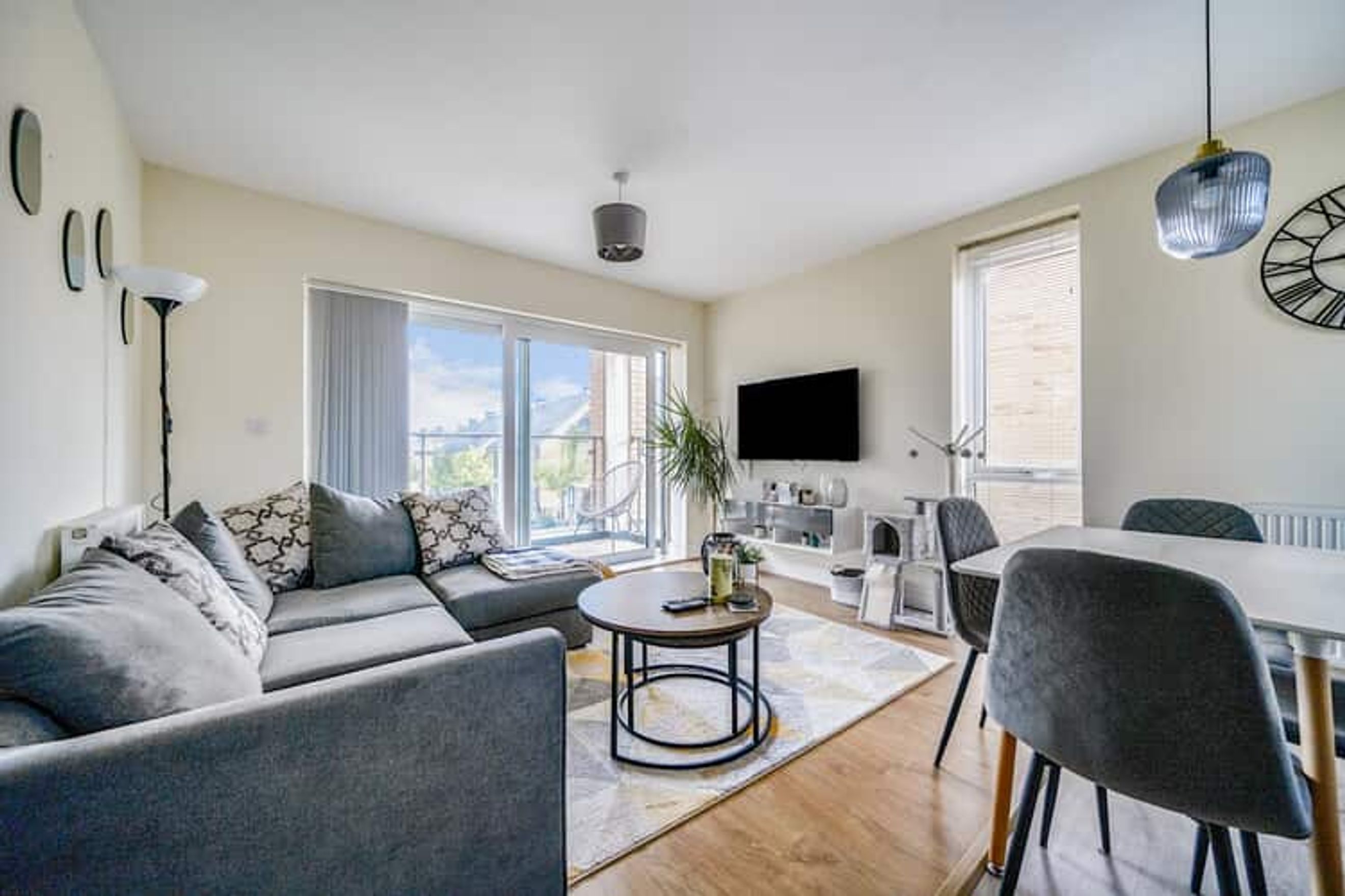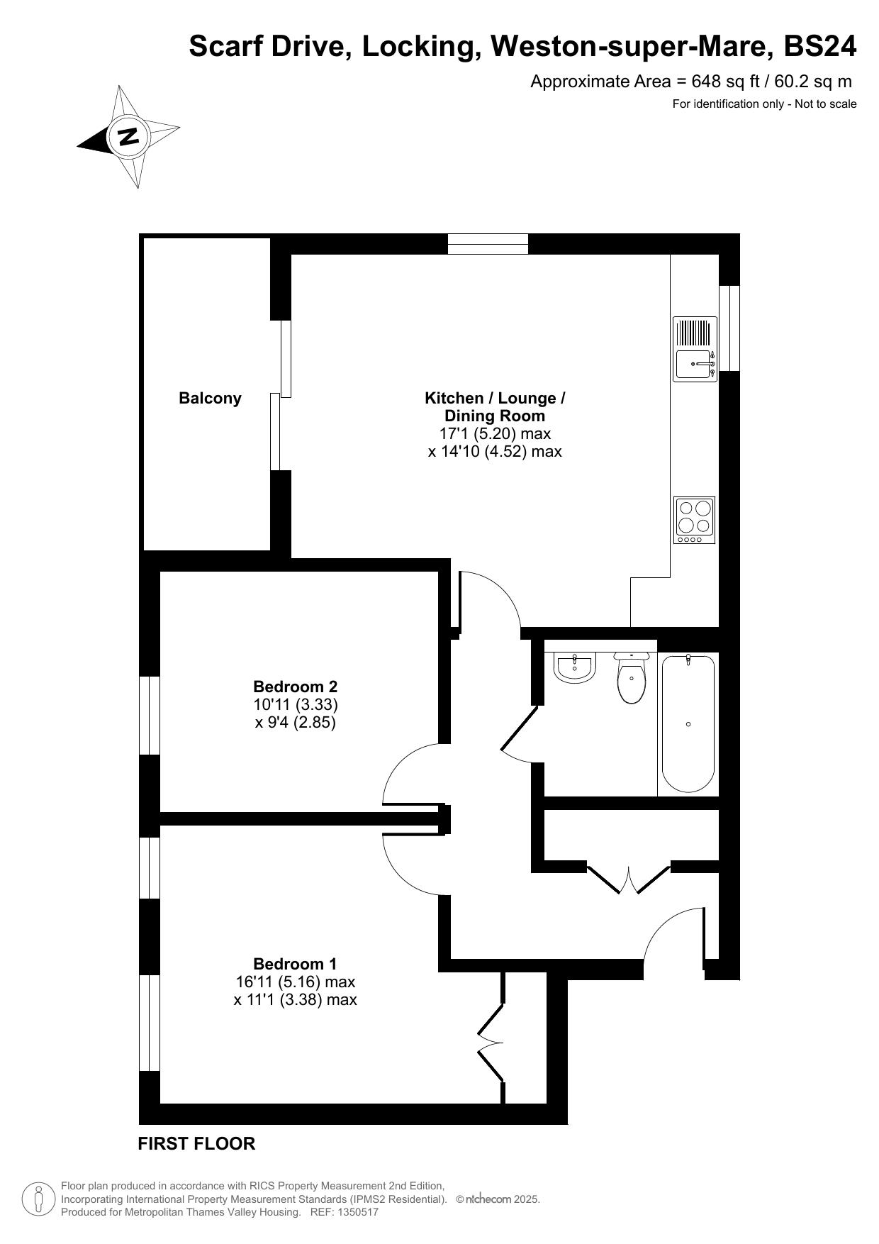 The property on the first floor comprises an entrance hall, a spacious living room with a modern open-plan kitchen, two double bedrooms and a bathroom.