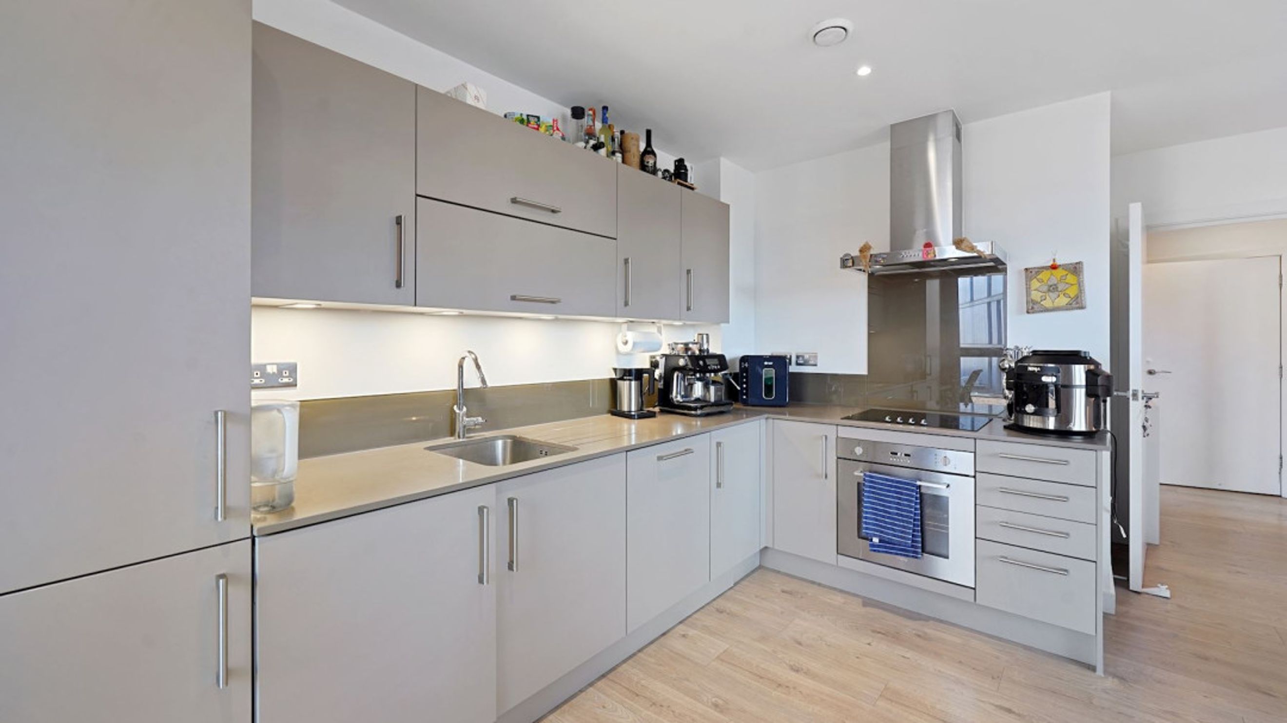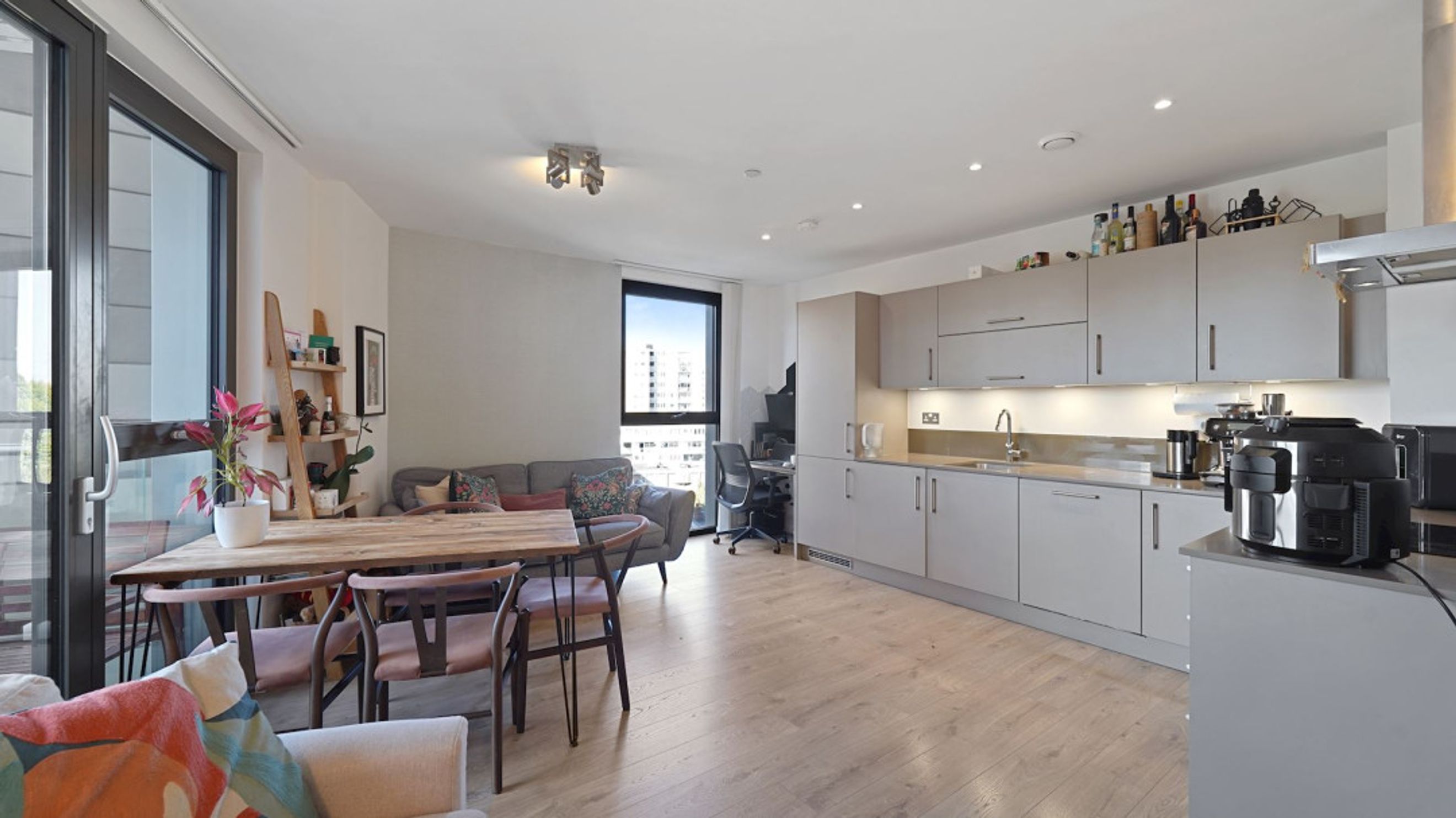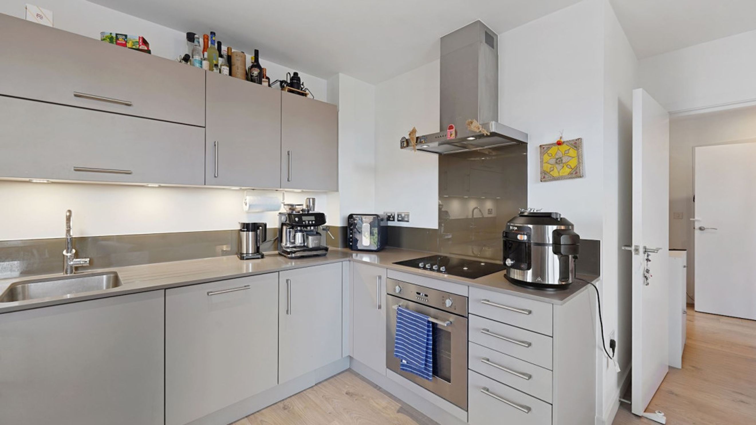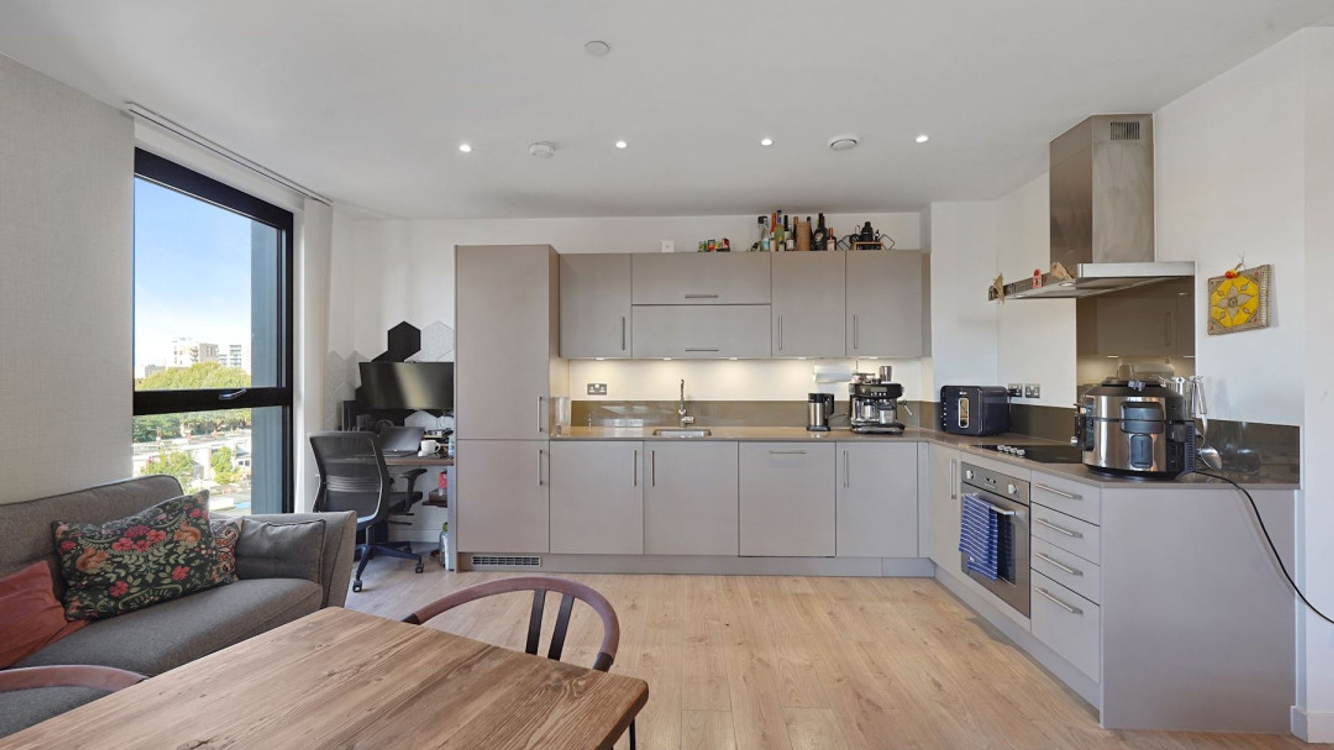 Step into 402 Engine House, E14 6UA, a bright and airy 1-bedroom, 1-bathroom haven in the heart of Poplar. This sophisticated space welcomes you with an open-plan living area that flows seamlessly to a spacious balcony, where you can savor panoramic city views over morning coffee or evening sundowners. The spacious bedroom offers a serene escape and natural light pouring through expansive windows, while the modern bathroom impresses with sleek fixtures, a relaxing bathtub, and contemporary walnut accents for that spa-like unwind. The sophisticated built-in kitchen features integrated appliances, glossy grey cabinetry.