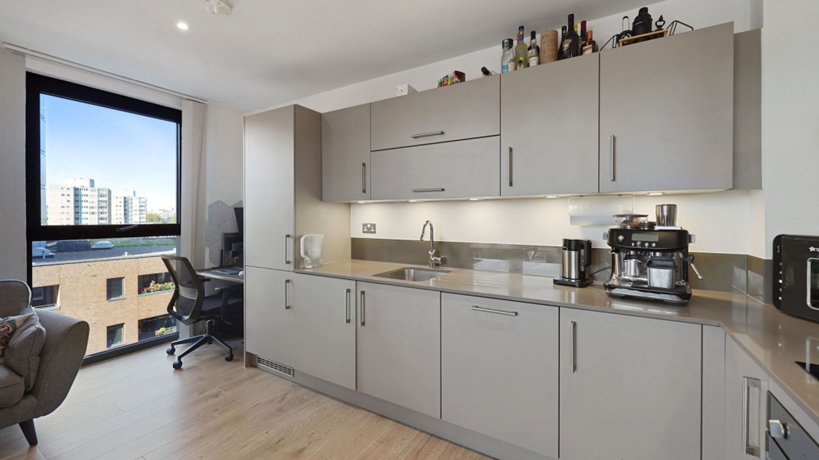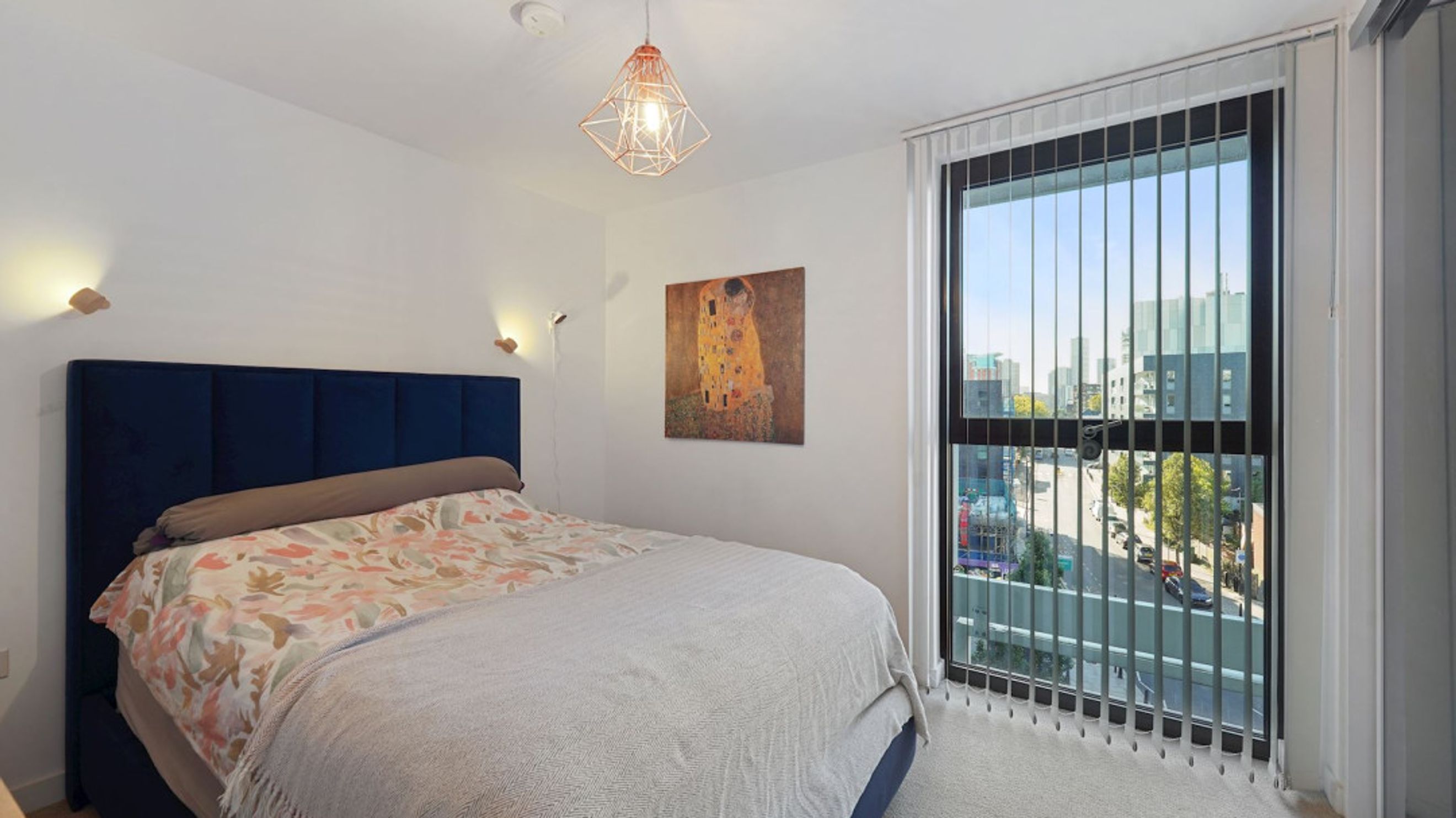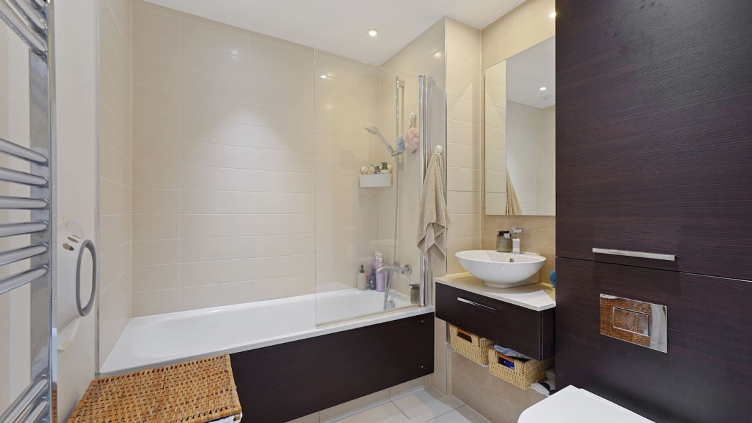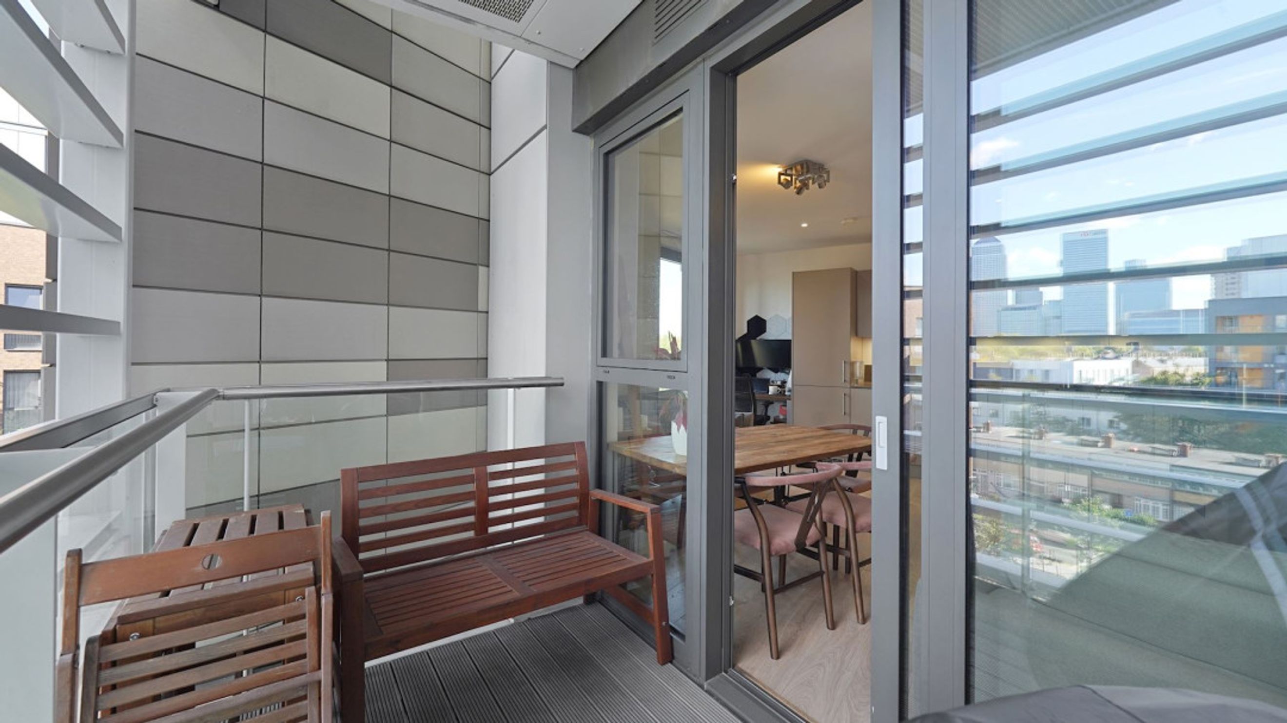 Step into 402 Engine House, E14 6UA, a bright and airy 1-bedroom, 1-bathroom haven in the heart of Poplar. This sophisticated space welcomes you with an open-plan living area that flows seamlessly to a spacious balcony, where you can savor panoramic city views over morning coffee or evening sundowners. The spacious bedroom offers a serene escape and natural light pouring through expansive windows, while the modern bathroom impresses with sleek fixtures, a relaxing bathtub, and contemporary walnut accents for that spa-like unwind. The sophisticated built-in kitchen features integrated appliances, glossy grey cabinetry.