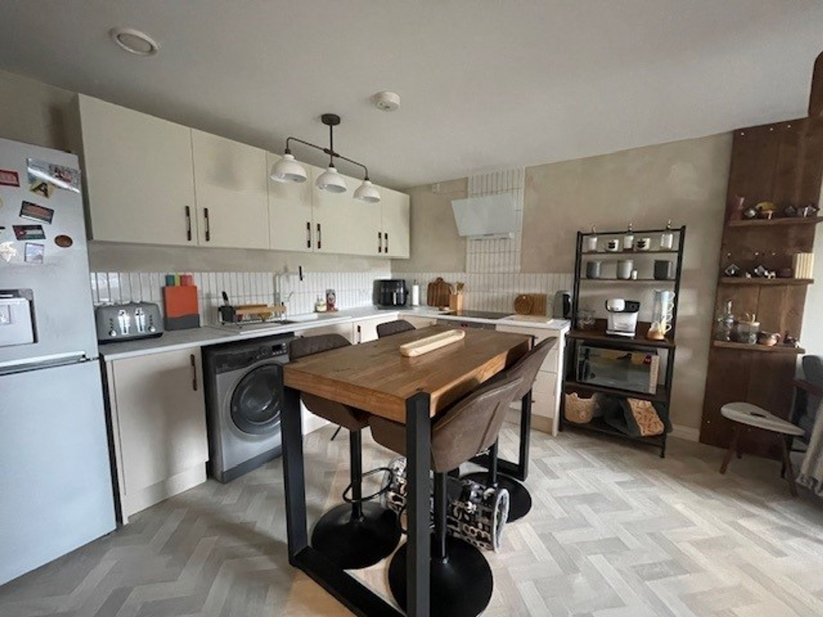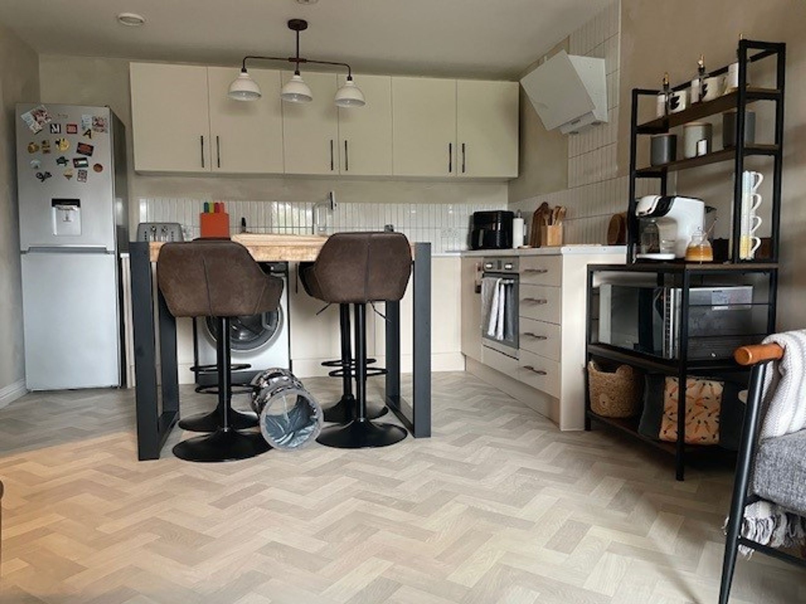 The open plan kitchen comes with integrated electric oven and hob with an extractor fan above.