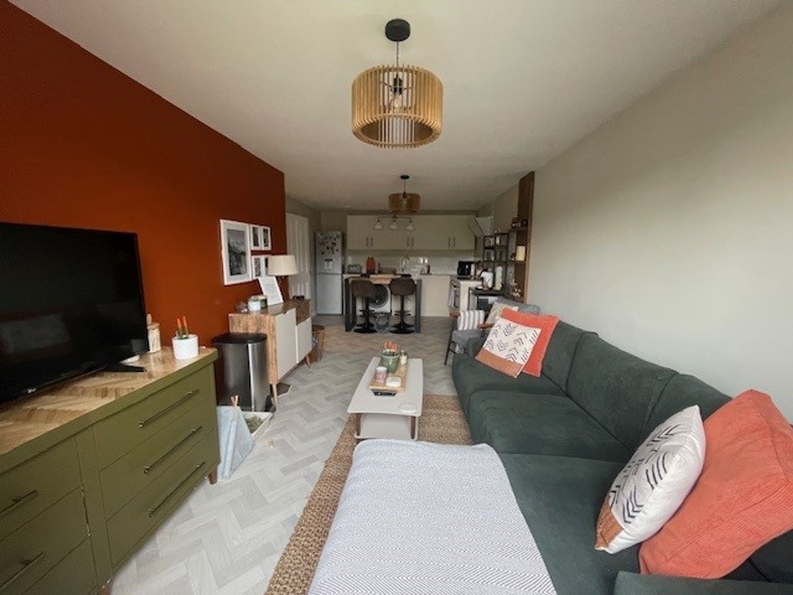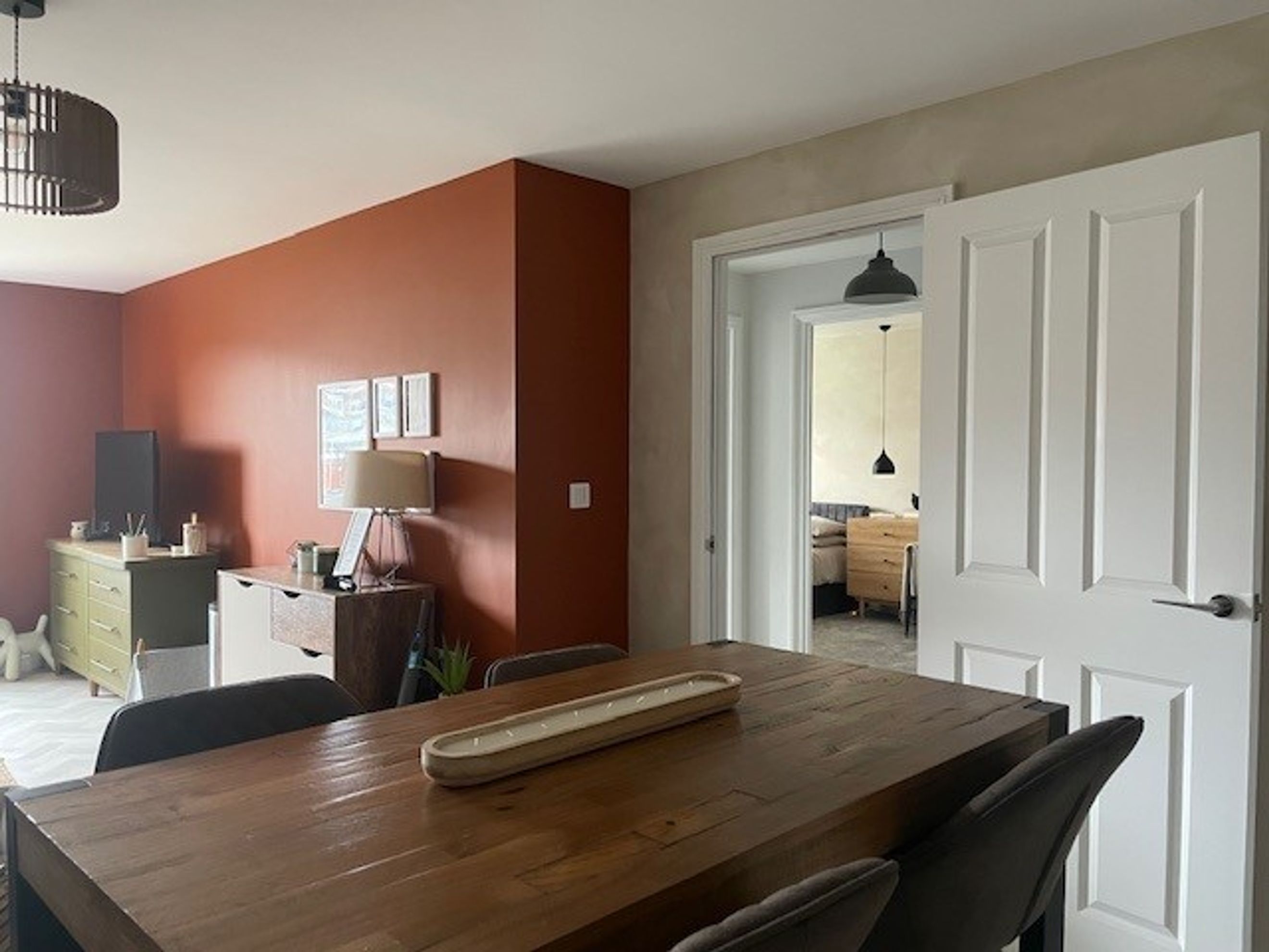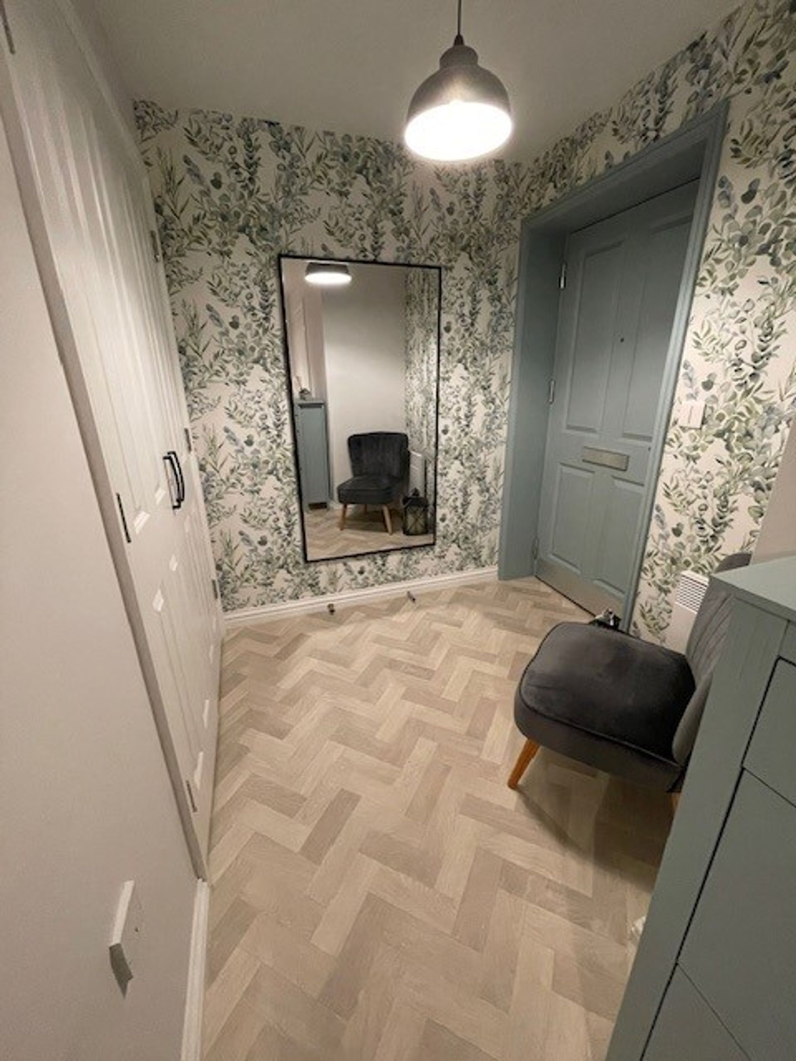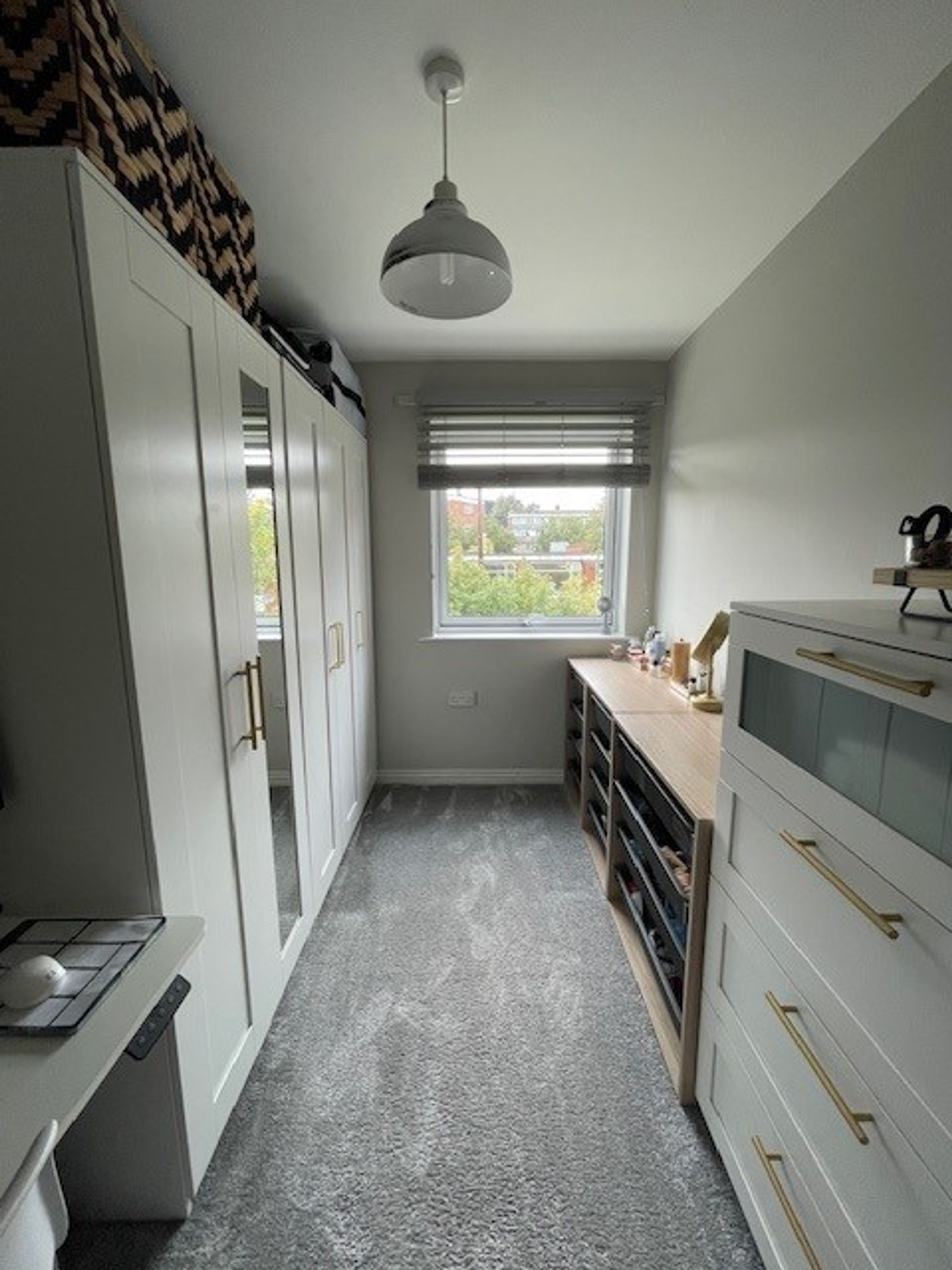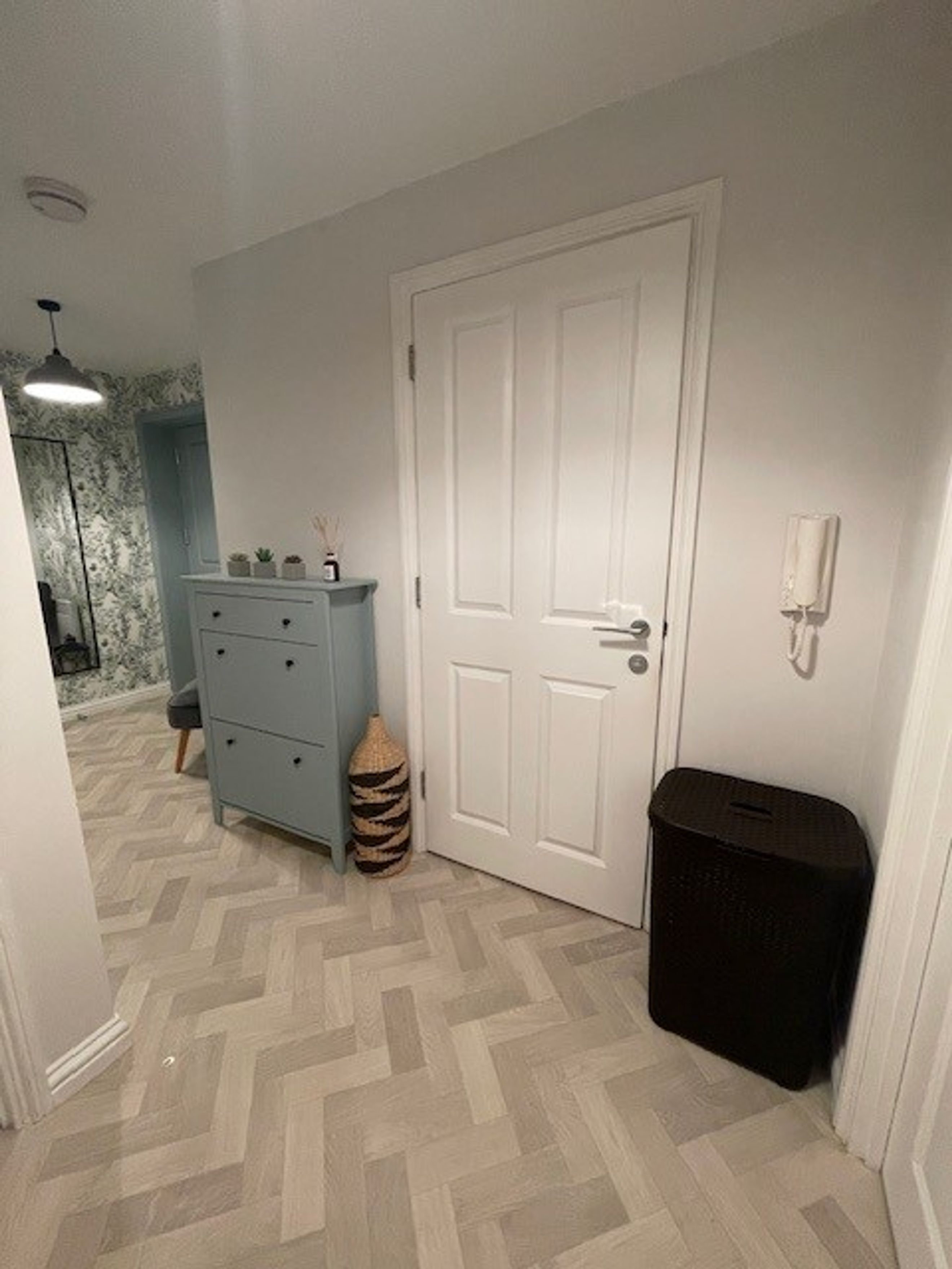 Upon entering the first floor apartment into the hallway you are greeted with a double cupboard directly in front that houses a venting system with plenty of storage. To the left you have an electric radiator and plug sockets.