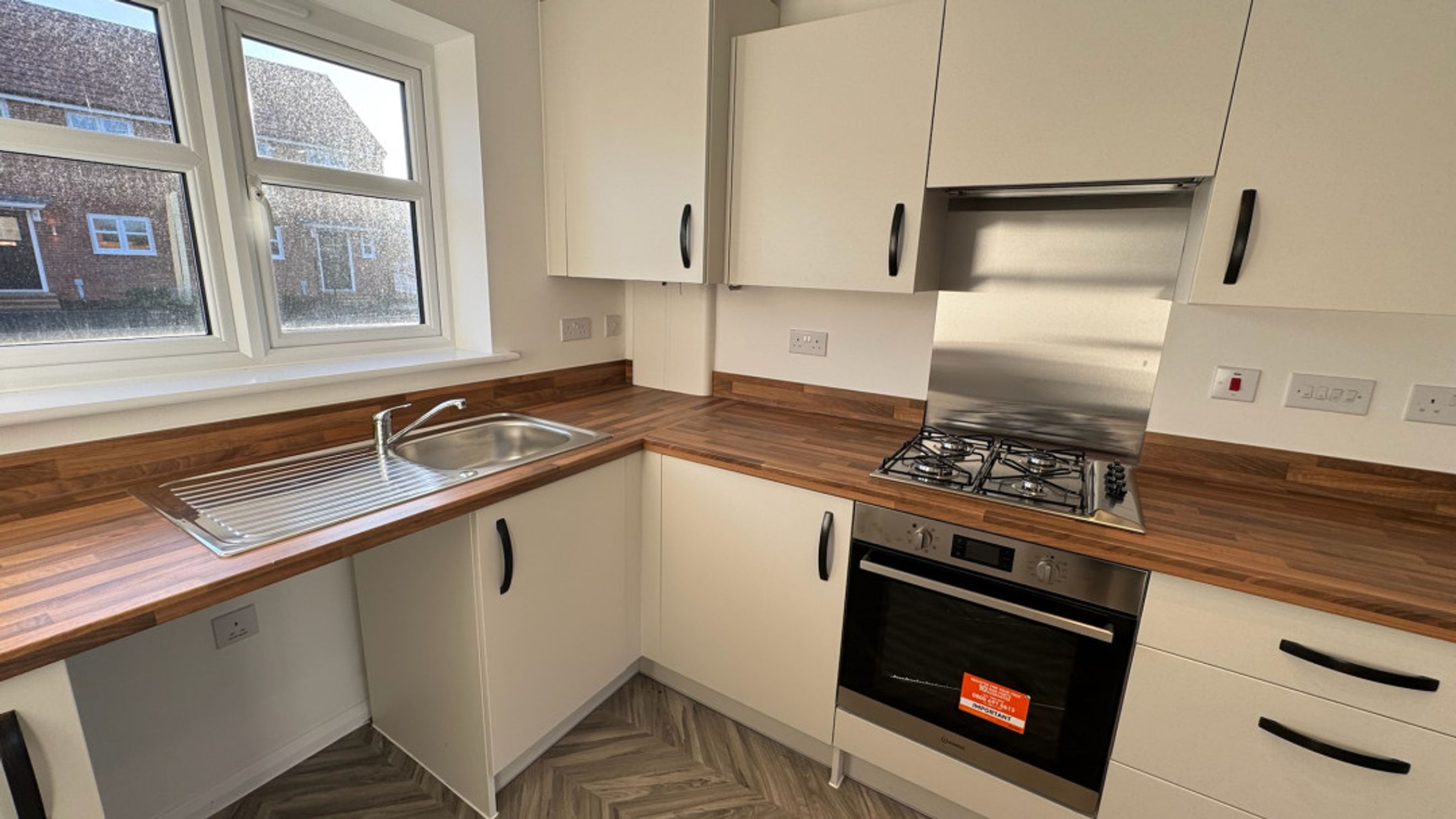A door off the hallway leads into the open-plan living area. The kitchen, located at the front of the home, features a range of stylish base and wall units, an integral oven and hob, an extractor fan, and a sleek stainless steel sink and drainer. There's ample space for your fridge/freezer and washer dryer.