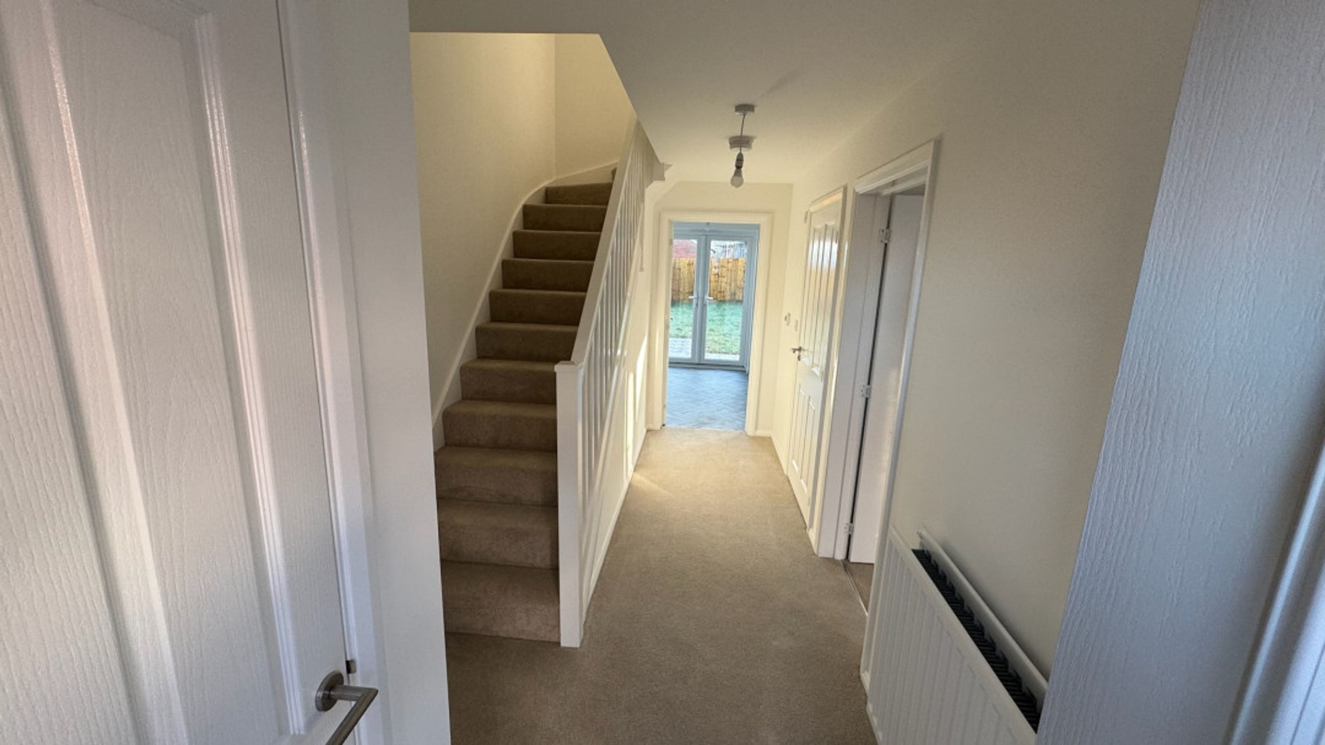 As you step into the entrance hall of this stunning new-build home, you'll discover a handy storage cupboard, the convenient downstairs W.C and a staircase leading to the first floor.