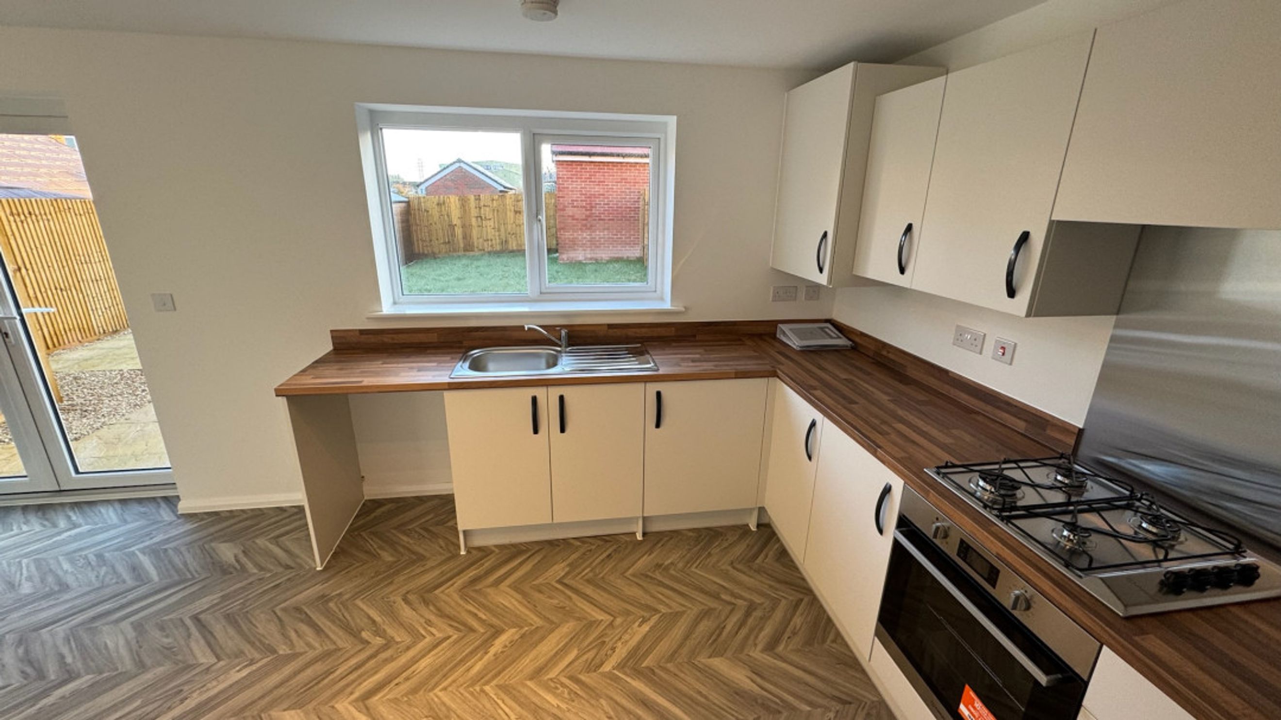 At the rear of the home, the kitchen/dining room features a range of stylish base and wall units, an integrated oven and hob, an extractor fan, and a sleek stainless steel sink and drainer. There's ample space for your fridge/freezer, washer dryer, and a dining table. This bright space also features a handy storage cupboard and patio doors that open out onto the private rear garden.