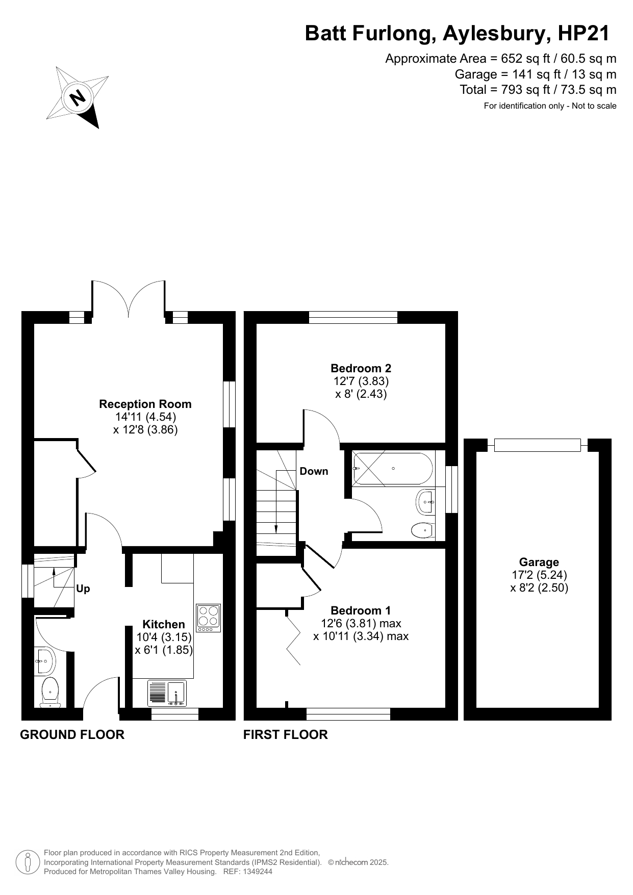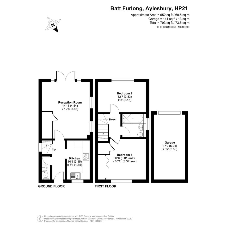 The property is spread across two floors, with an entrance hallway, a reception room, a separate kitchen, and a toilet on the ground floor. On the first floor, there are two bedrooms and a family bathroom.