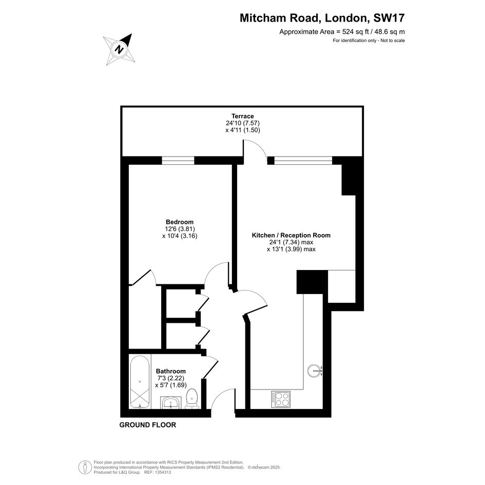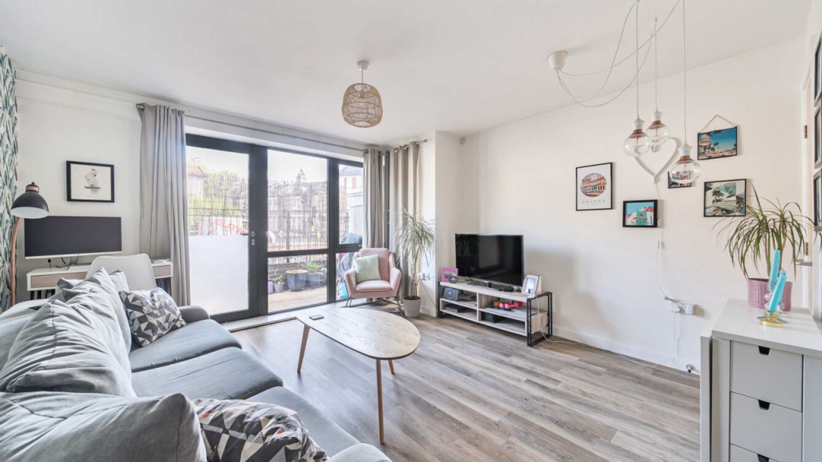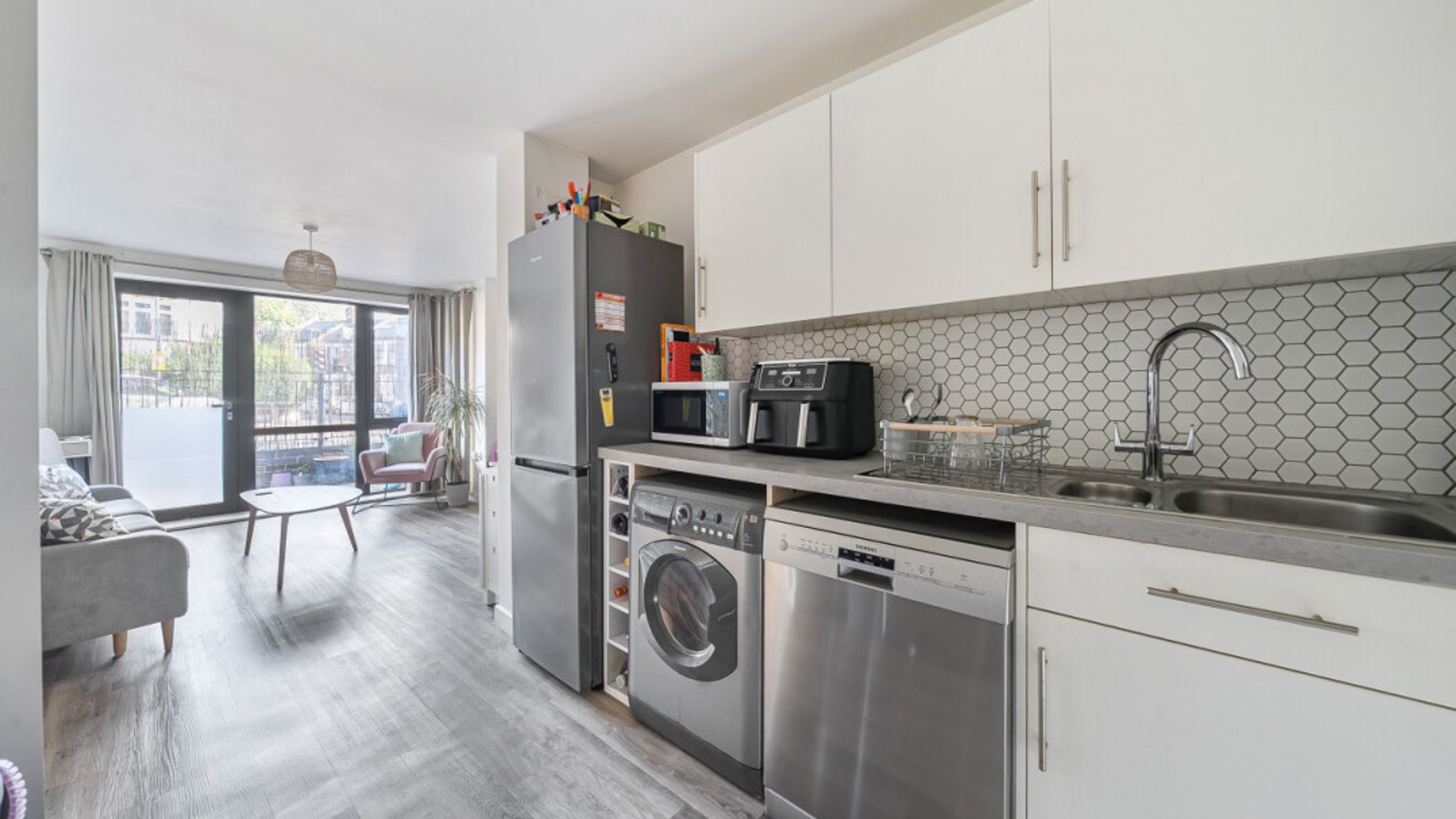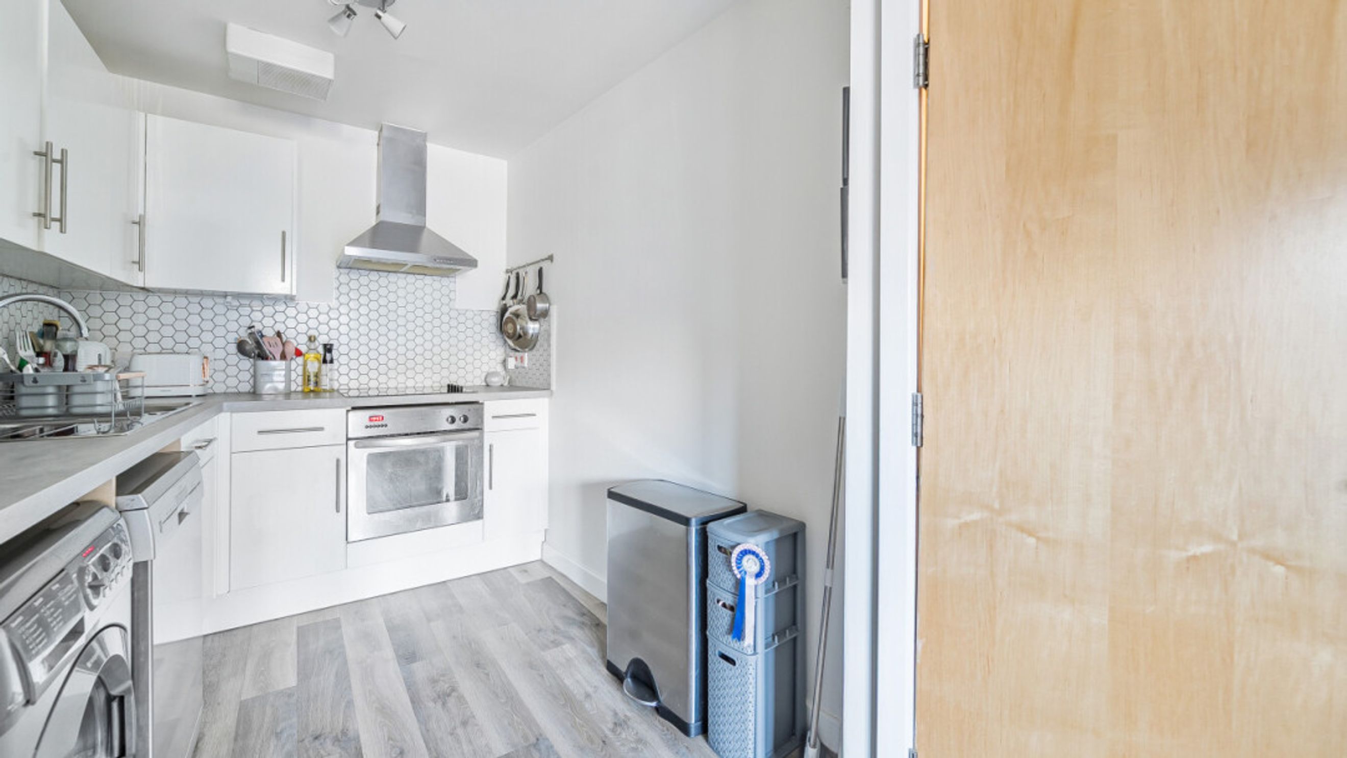 Enter this bright and spacious one bedroom apartment via an entrance hall with storage. The open plan living area, is to your right. Flooded with natural light from wide floor-length windows and door leading to a private north west facing terrace, it includes a kitchen fitted with pale wall and base units with co-ordinated work surfaces and incorporating integrated oven, hob and extractor fan and spaces for your white goods. The well proportioned bedroom includes a walk in store. A contemporary bathroom completes the accommodation.