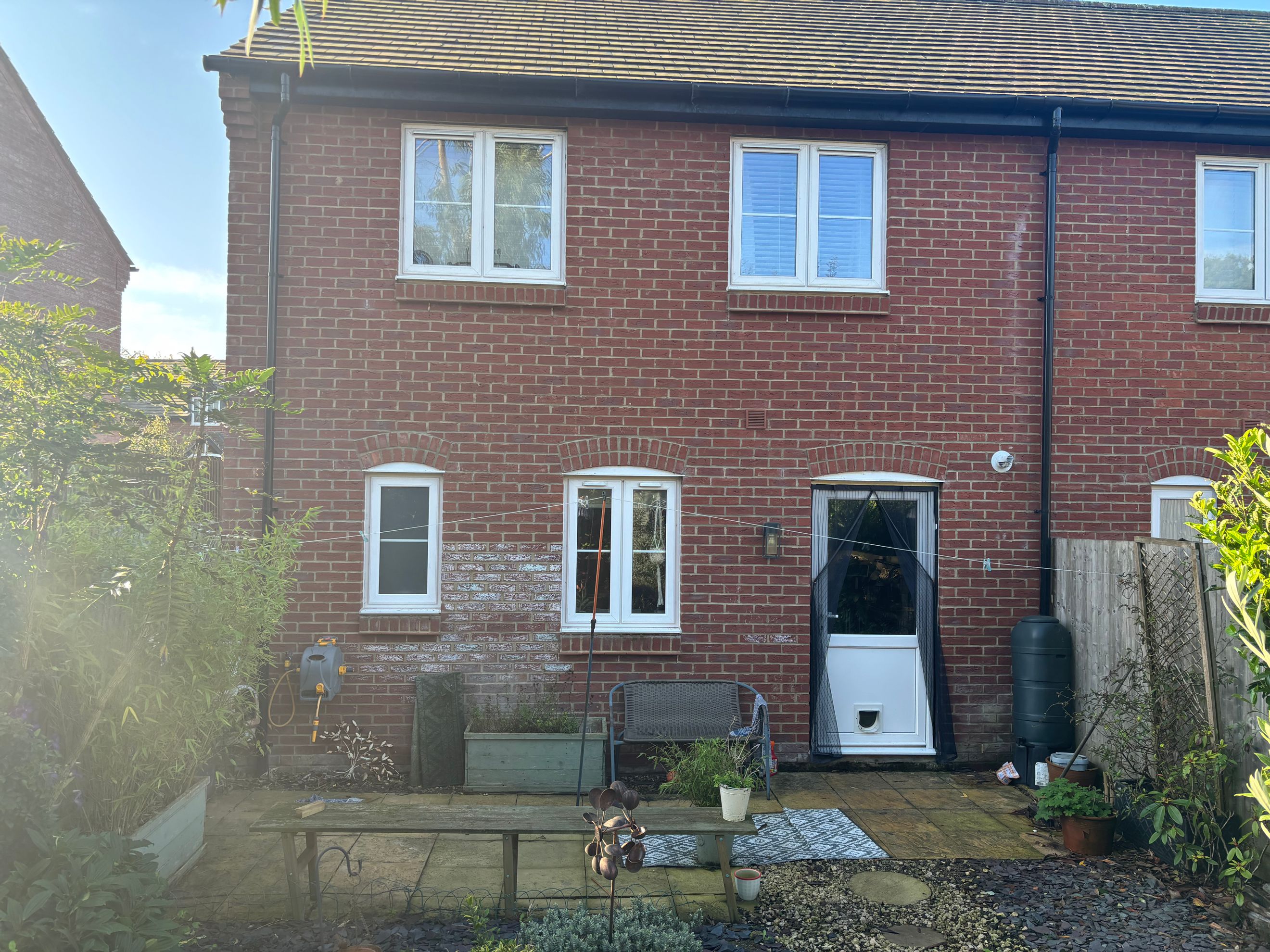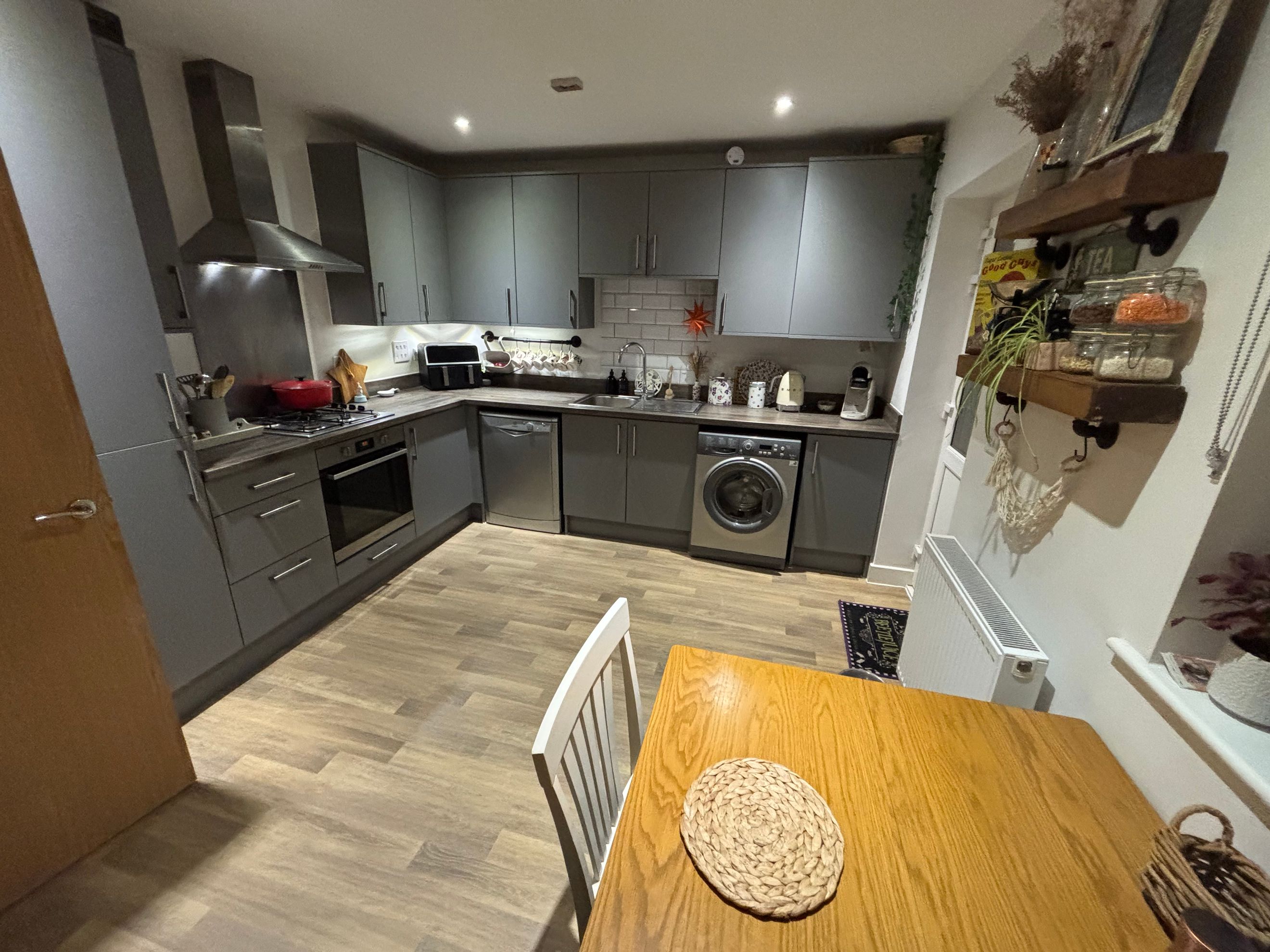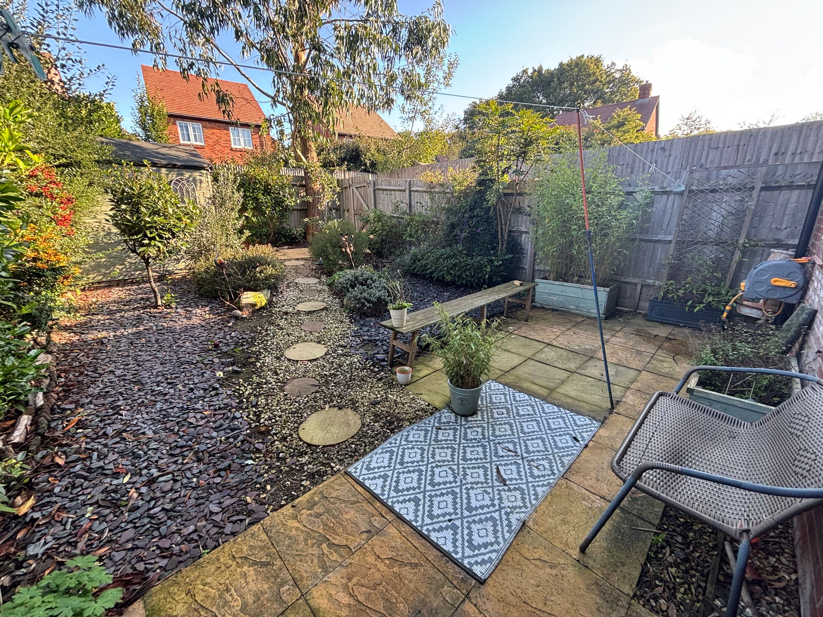The property features modern décor throughout, a downstairs WC, and a kitchen fitted with an oven, hob and extractor. There’s plenty of built-in storage, and the private rear garden includes a shed, outside tap and gated side access. Driveway parking is available for two cars.