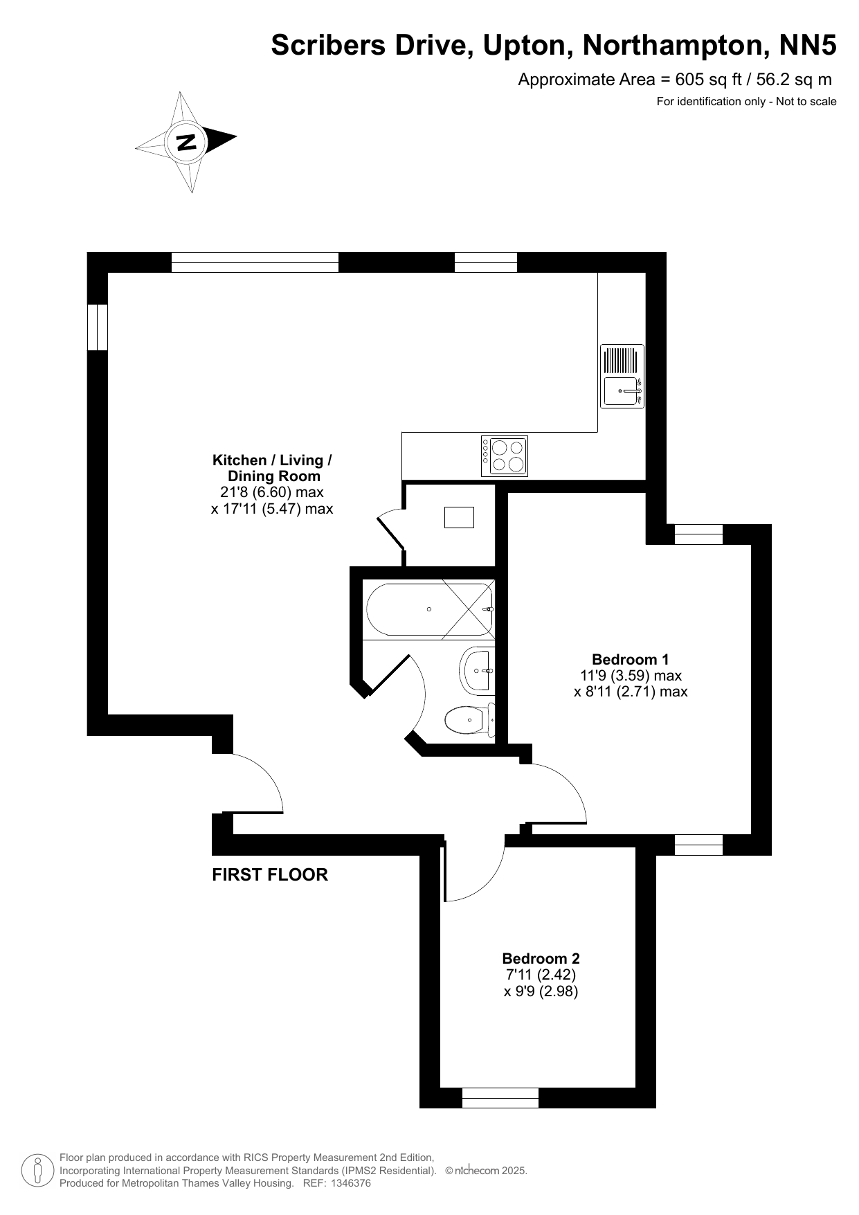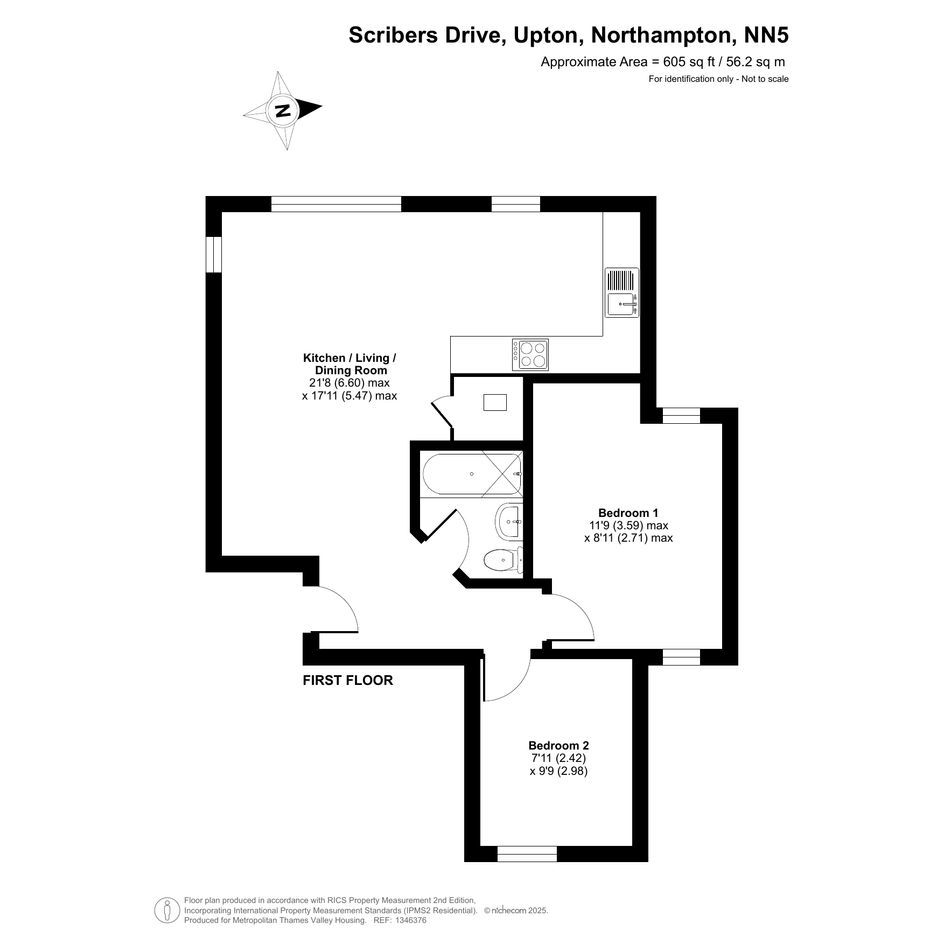 The property features an entrance hallway, an open plan living room and kitchen, two bedrooms and one bathroom.
