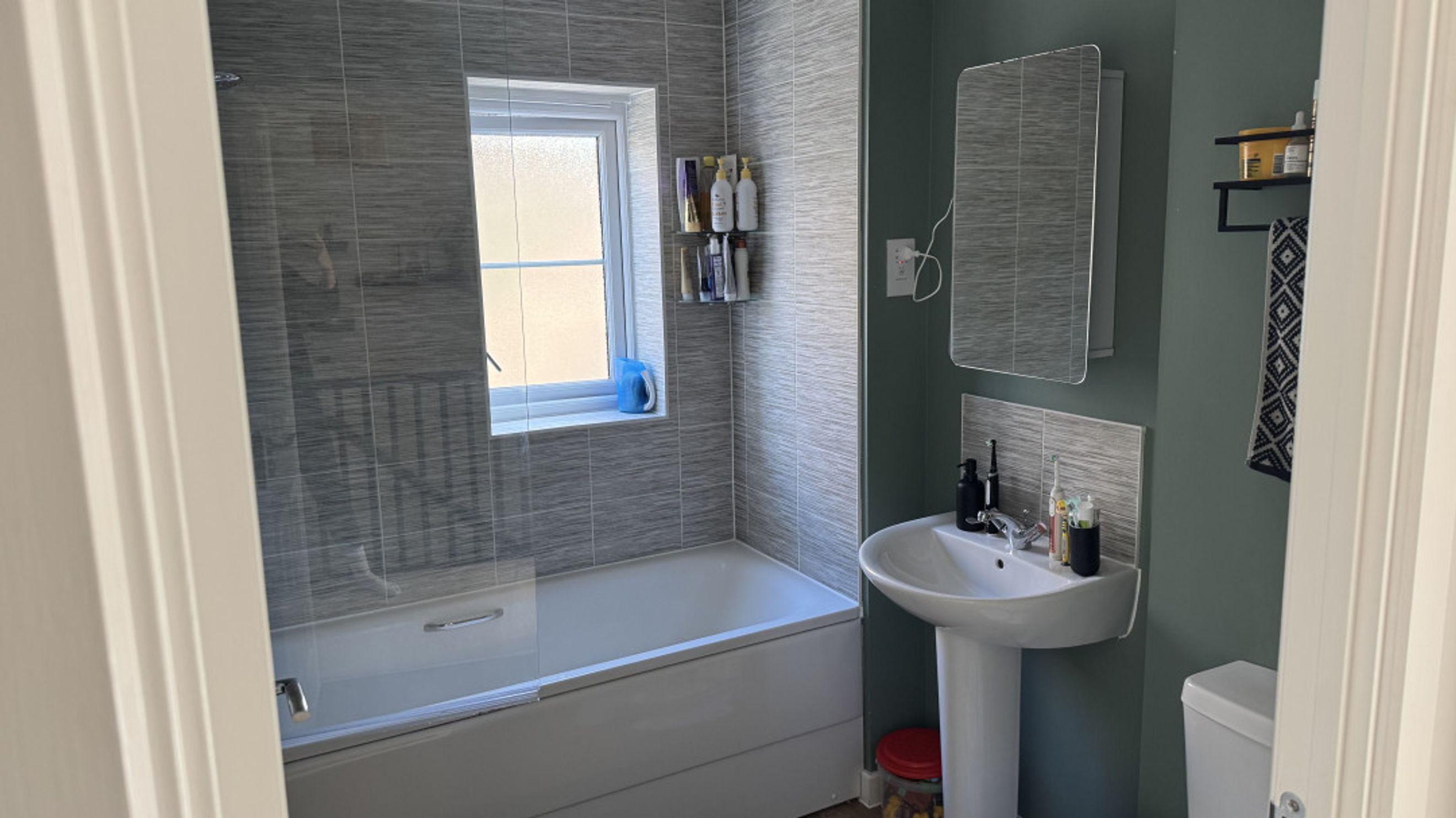 Upstairs, the property offers three generously sized bedrooms, all with carpet flooring and loft access for additional storage. The family bathroom includes a white suite, shower over the bath, shower screen, and laminate flooring.