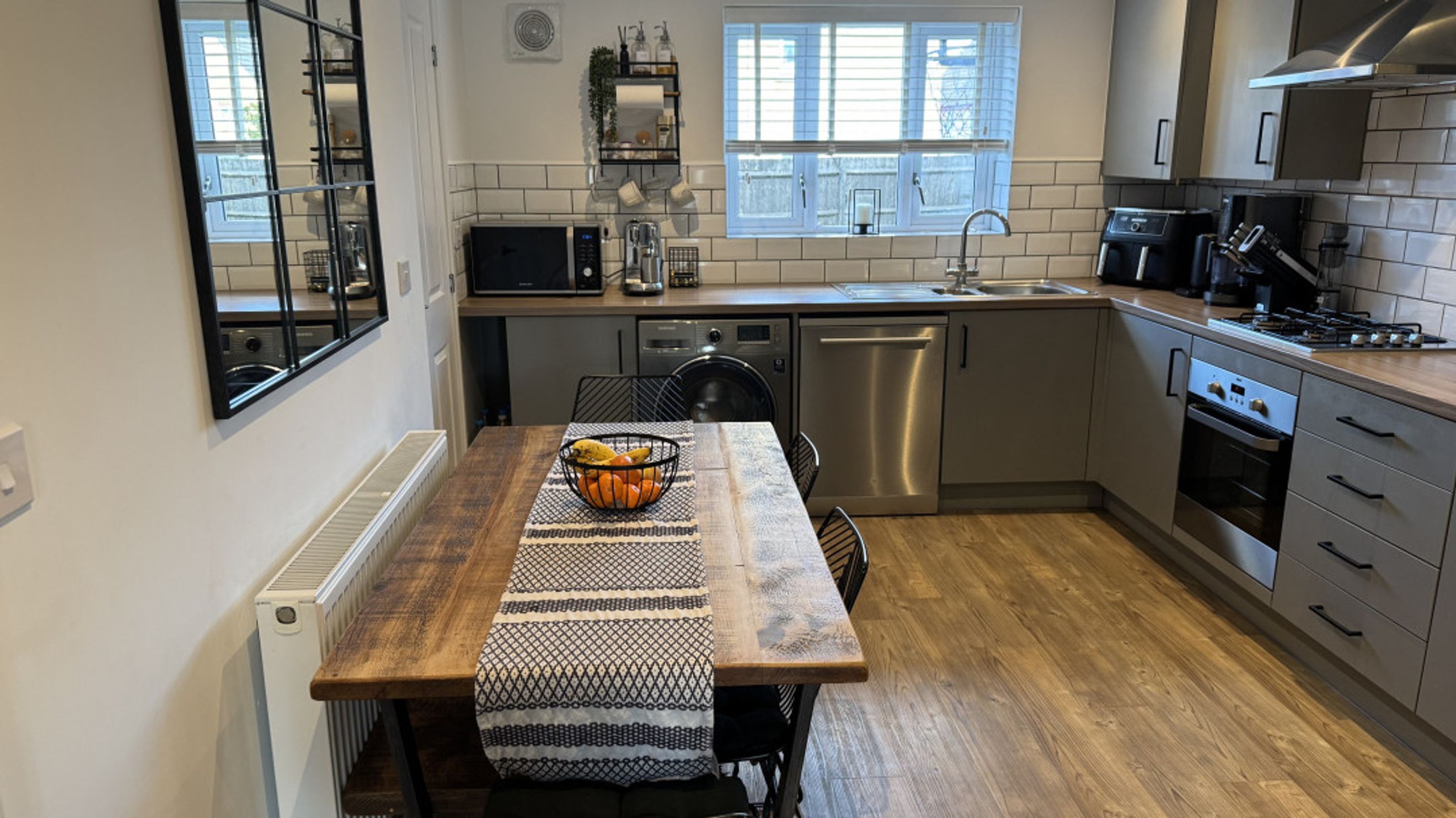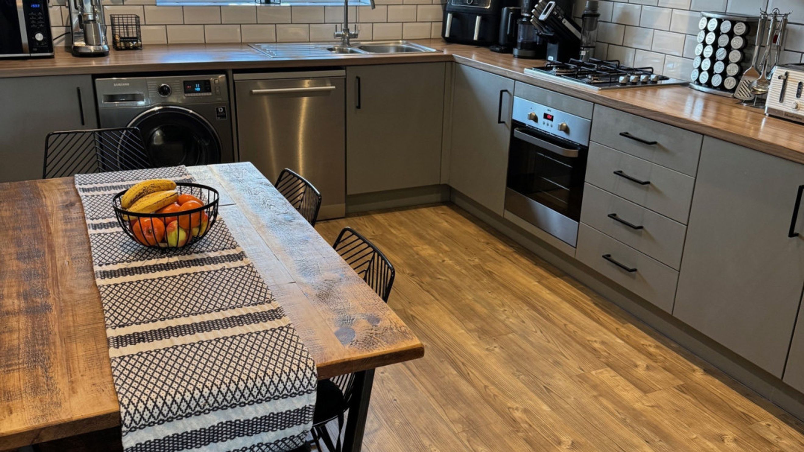 The kitchen is well-equipped with a range of wall and base units, gas hob, electric oven, and extractor fan, all set against laminate flooring.