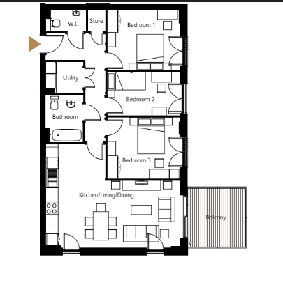 We are pleased to release this spacious three bedroom apartment, located on the first floor and offering 88sqm (942 sqft) of living space with two double bedrooms, 1 single bedroom, a family sized bathroom, additional WC and open plan kitchen/living/dining space.