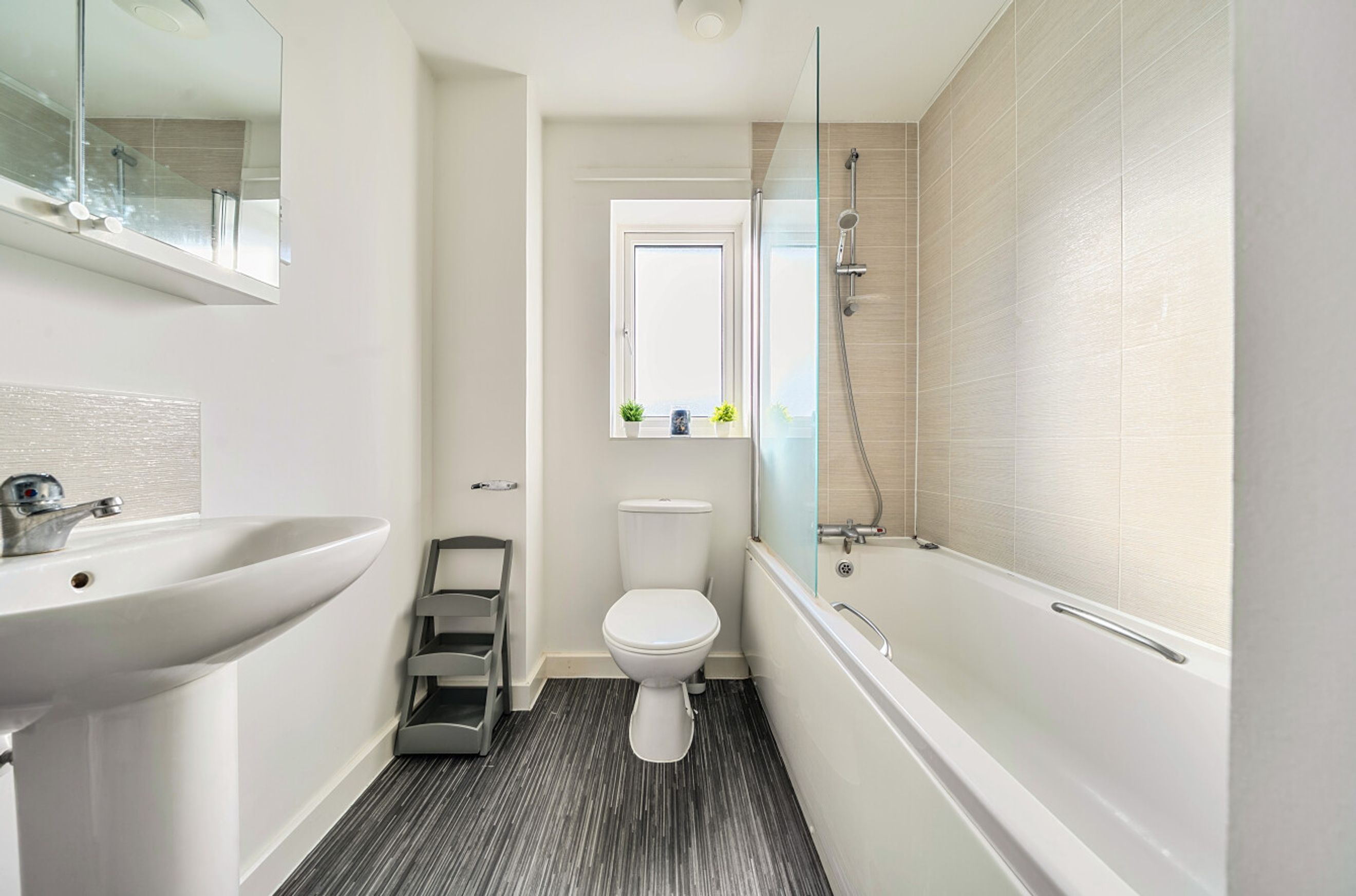 Upstairs, there are two comfortable bedrooms. The bathroom has a modern, white suite. You'll also have your own back garden, and two parking spaces.