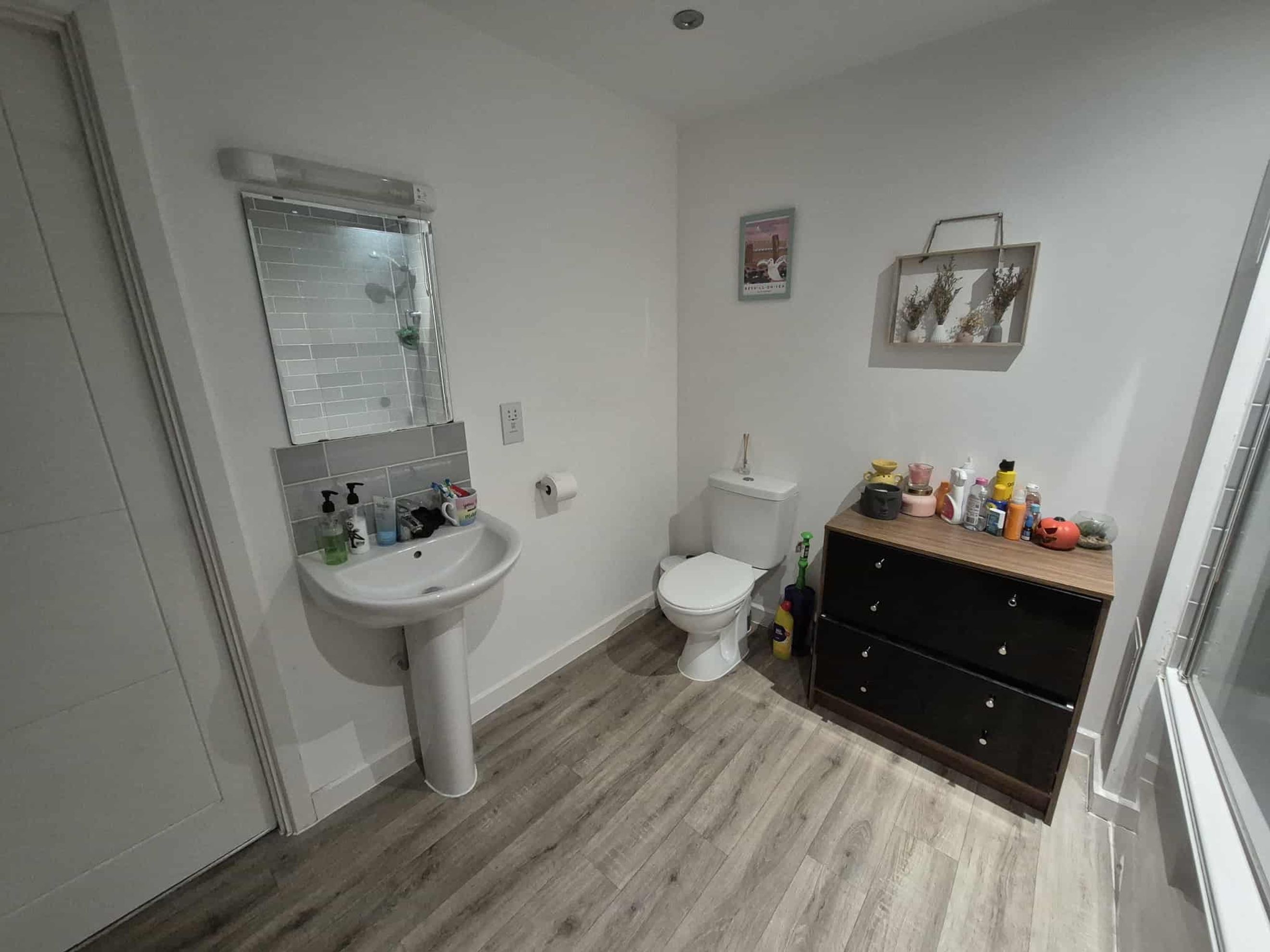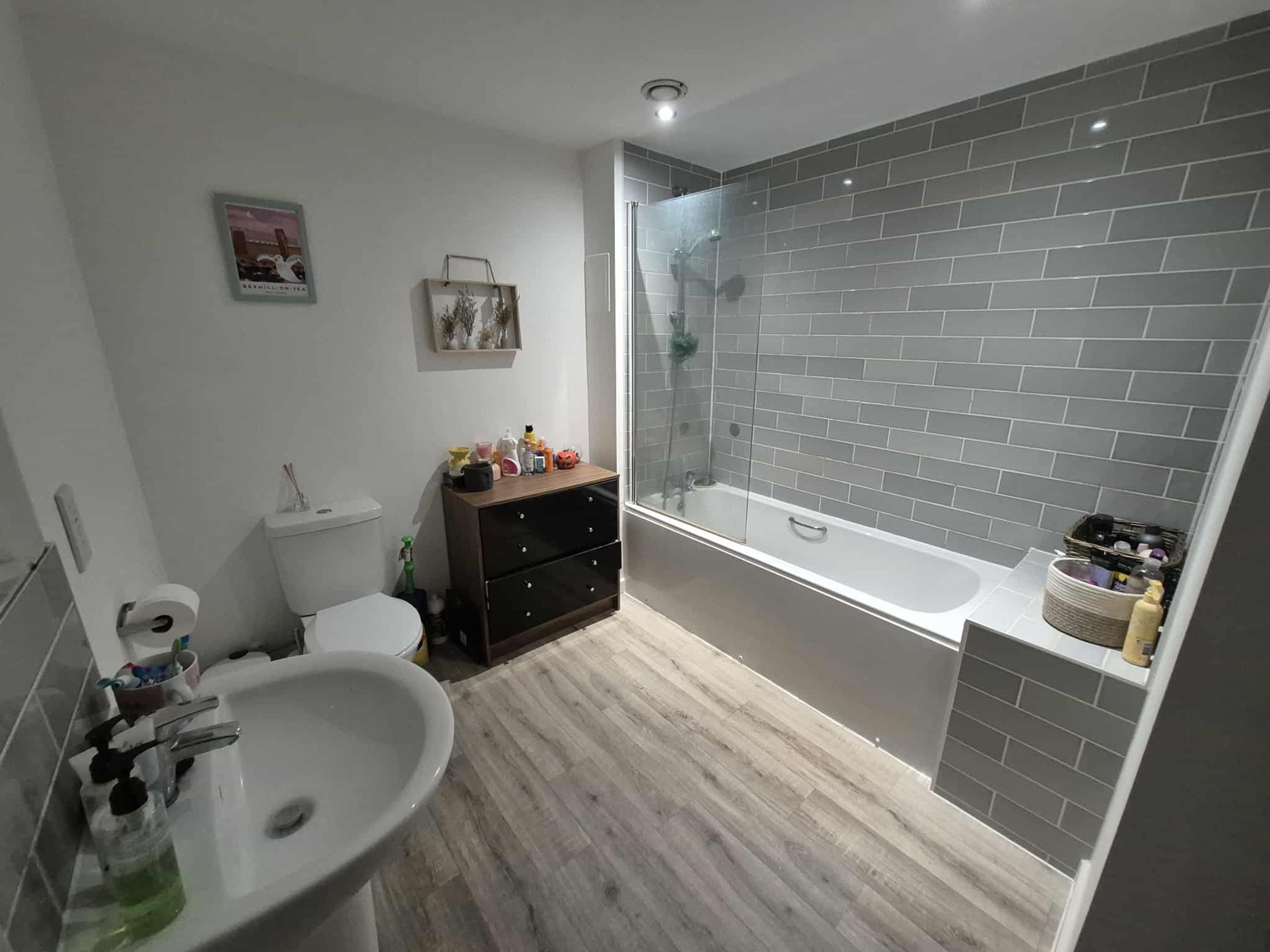 Finally, the contemporary family bathroom is fitted with a shower over the bath, combining style and practicality.
