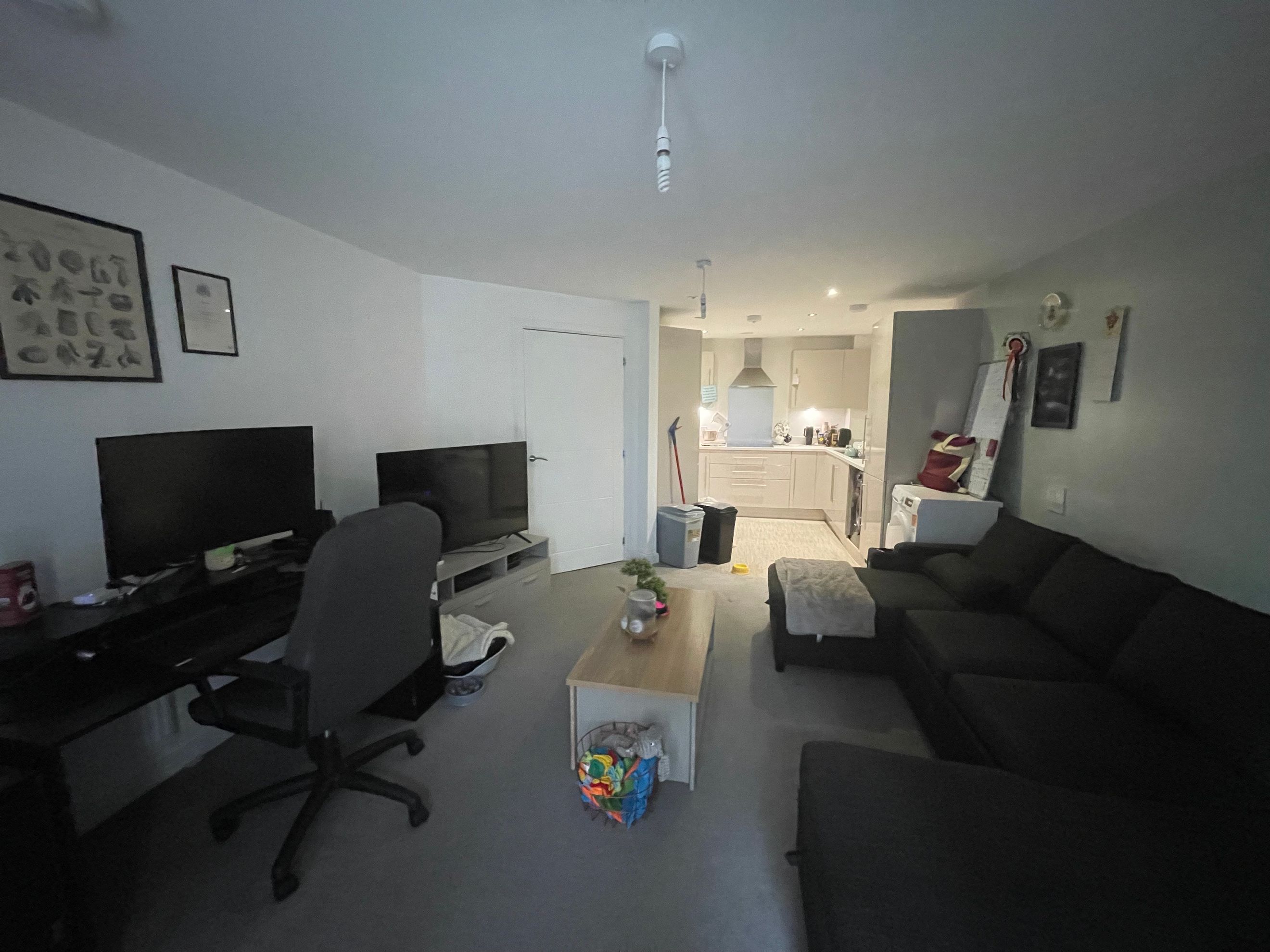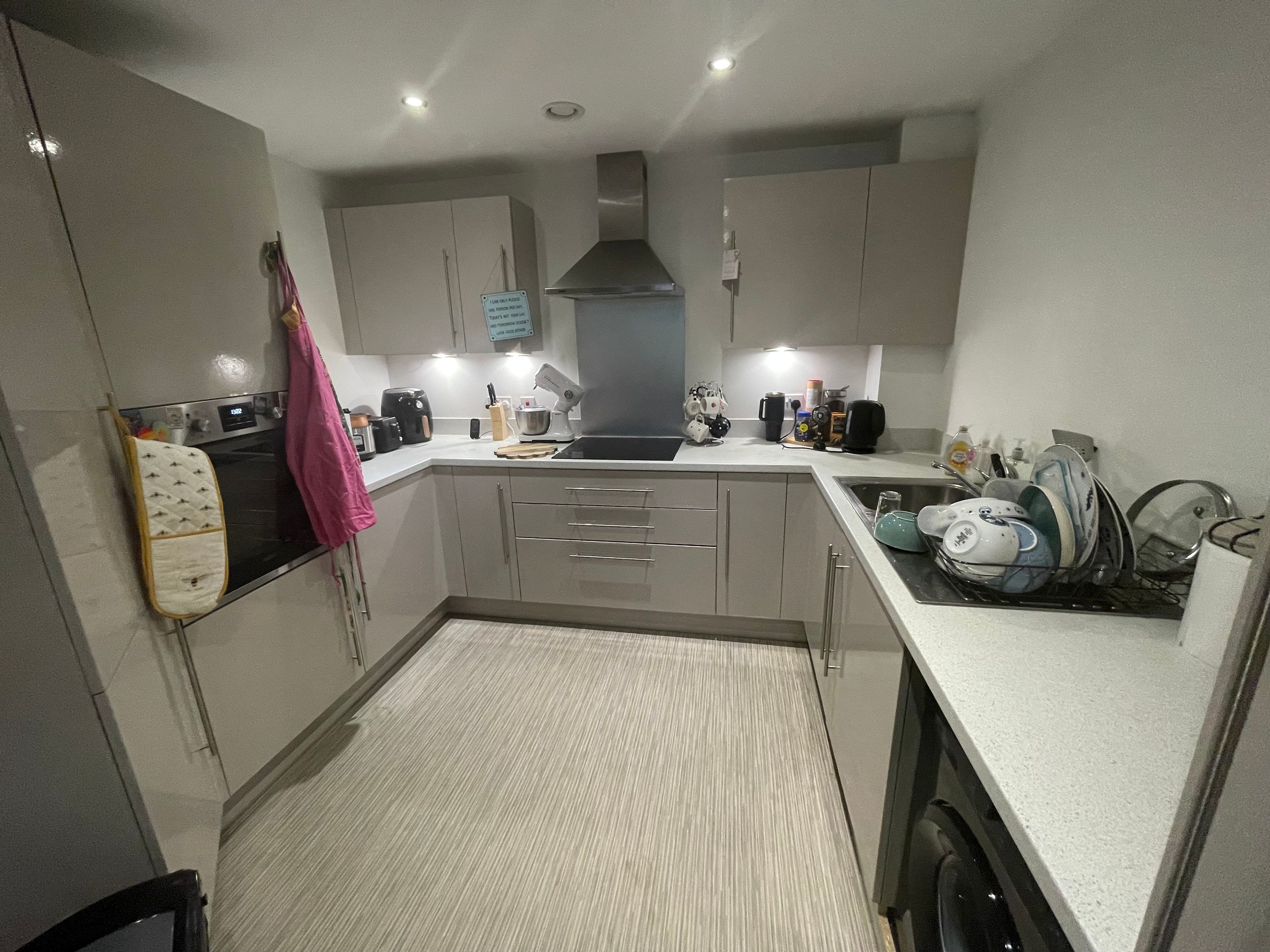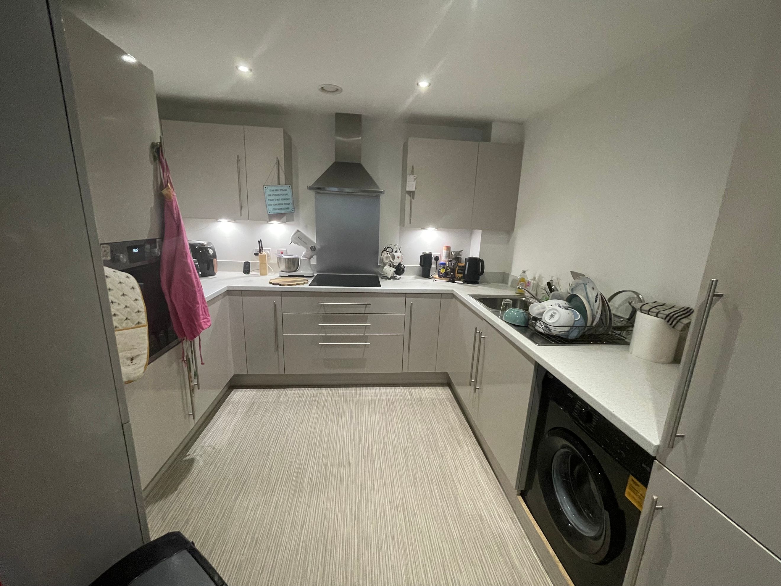 The modern kitchen boasts plenty of storage and counter space, along with integrated appliances including a fridge freezer, hob, extractor fan, and oven.